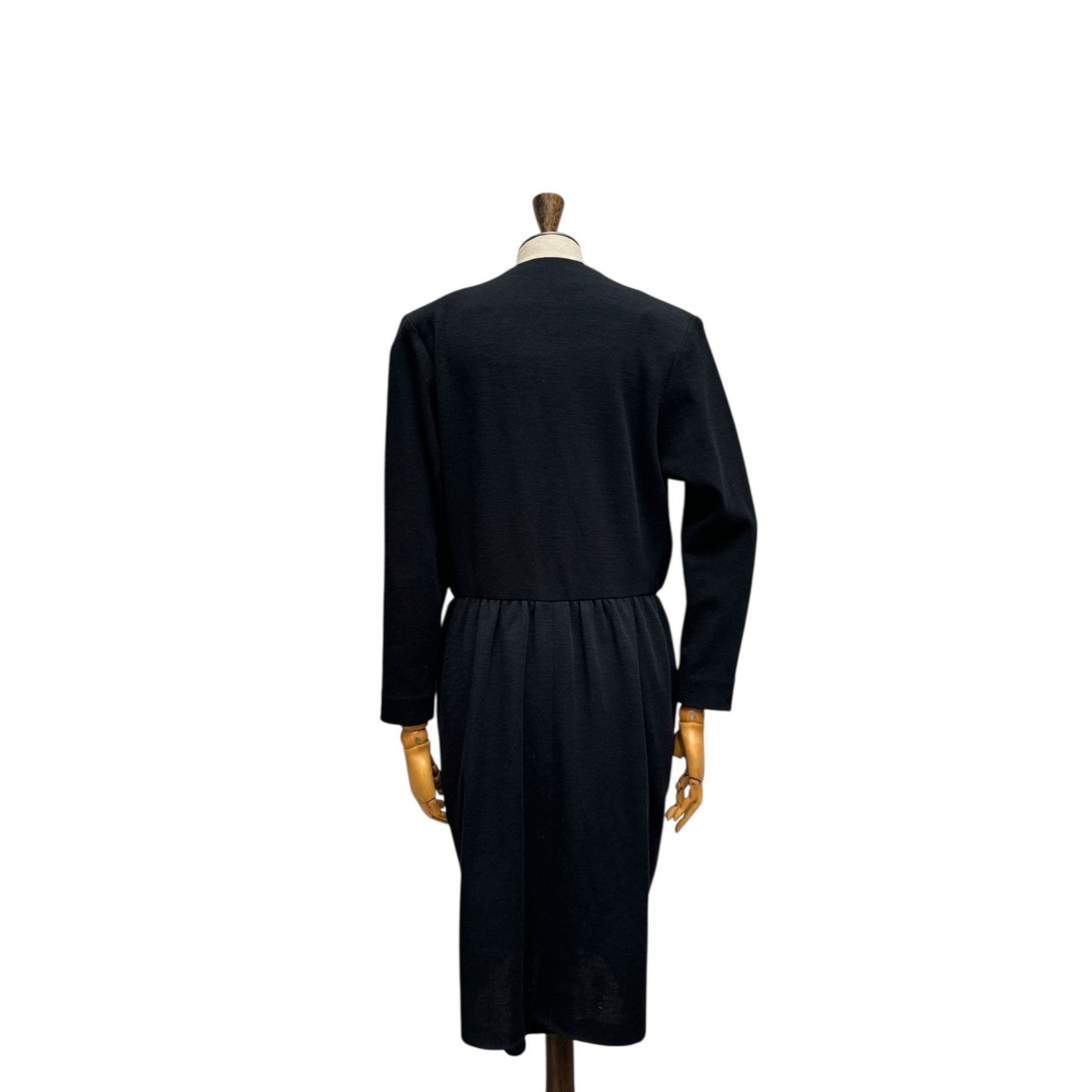 Iconic Yves Saint Laurent black wool dress from the 1970s, embodying the effortless Parisian elegance and architectural minimalism that defined the house during this era. Crafted in France from pure wool, the fabric offers a fluid yet structured drape, maintaining shape while remaining comfortable and breathable.