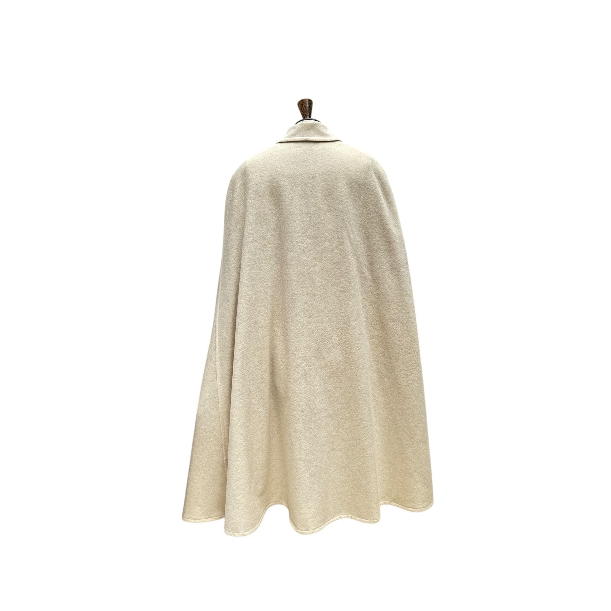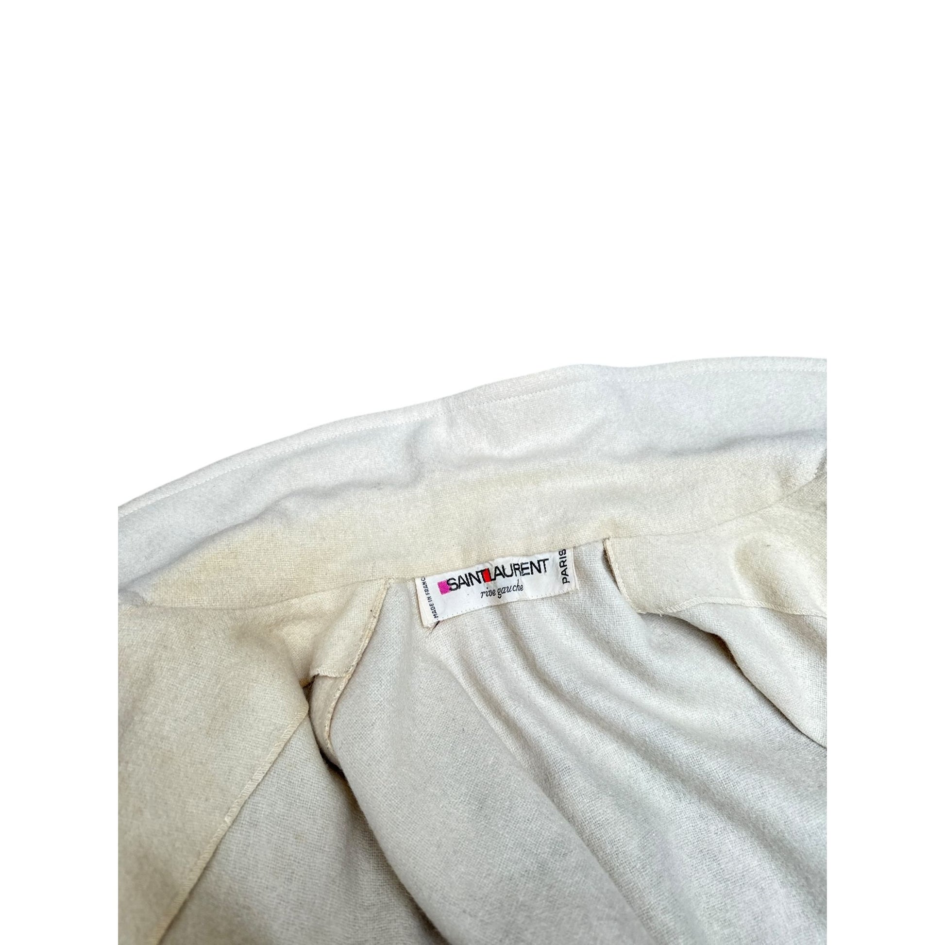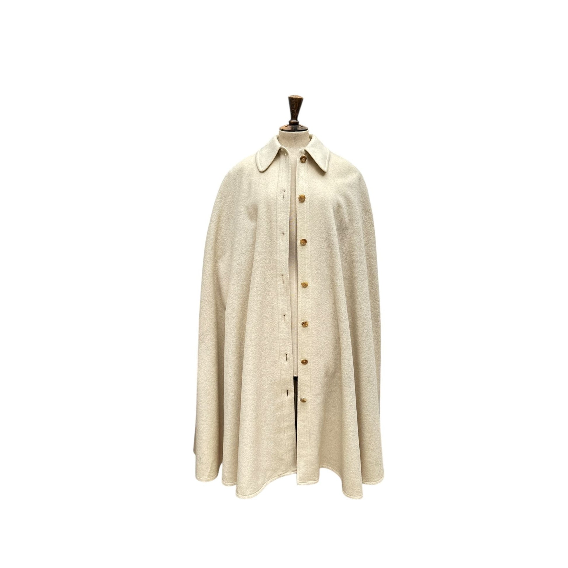 Elegant vintage Yves Saint Laurent cape from the 1970s, crafted in France from soft ecru wool. This timeless piece drapes beautifully, creating a fluid, architectural silhouette that moves gracefully with the wearer. Designed with a classic collar and button-down front, it embodies the effortless sophistication of the Rive Gauche era.