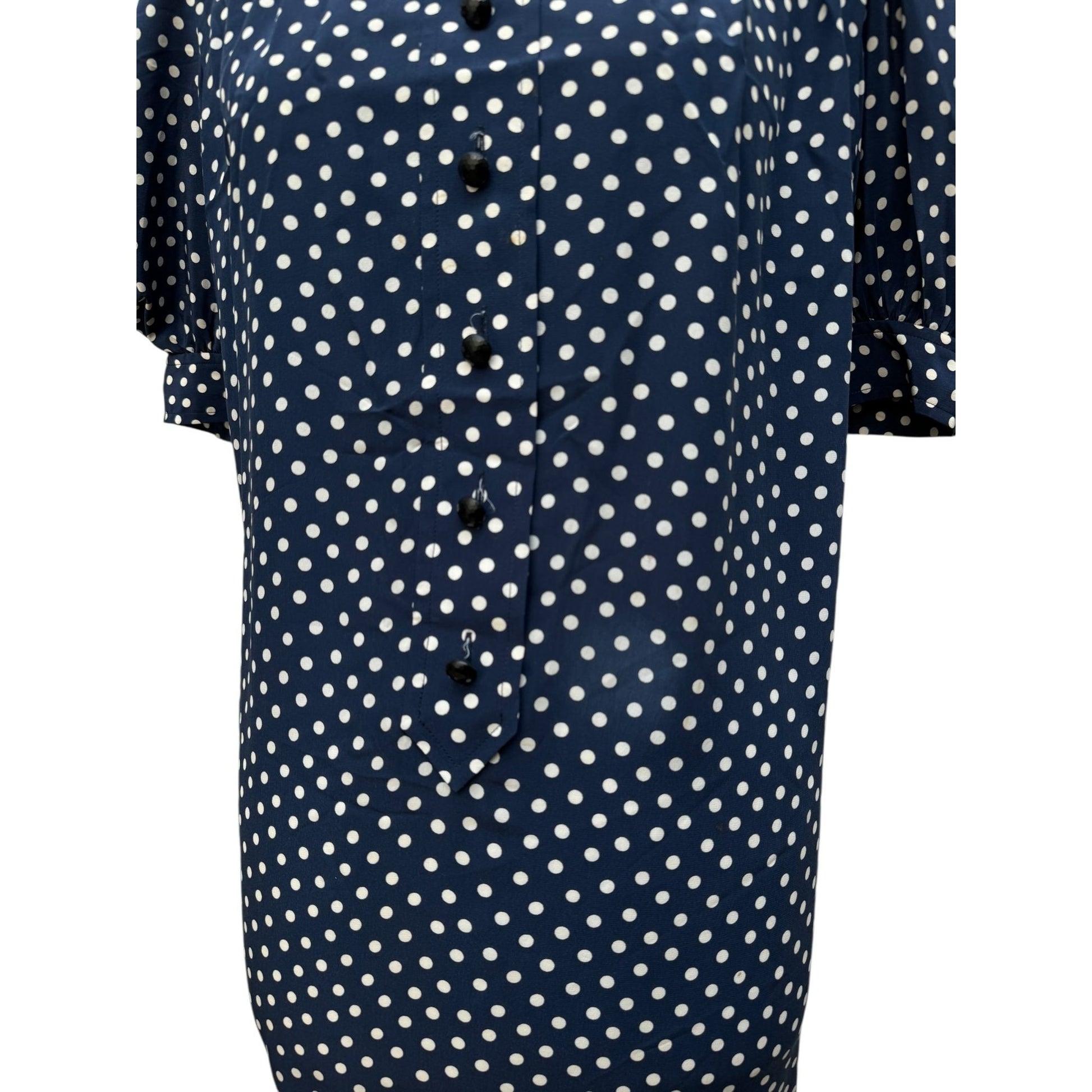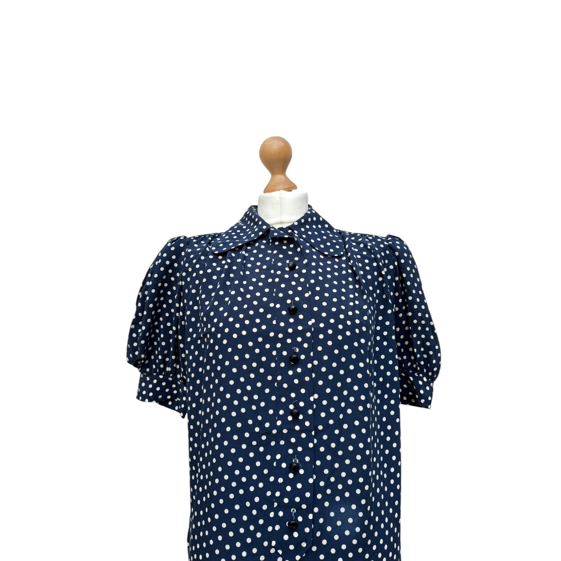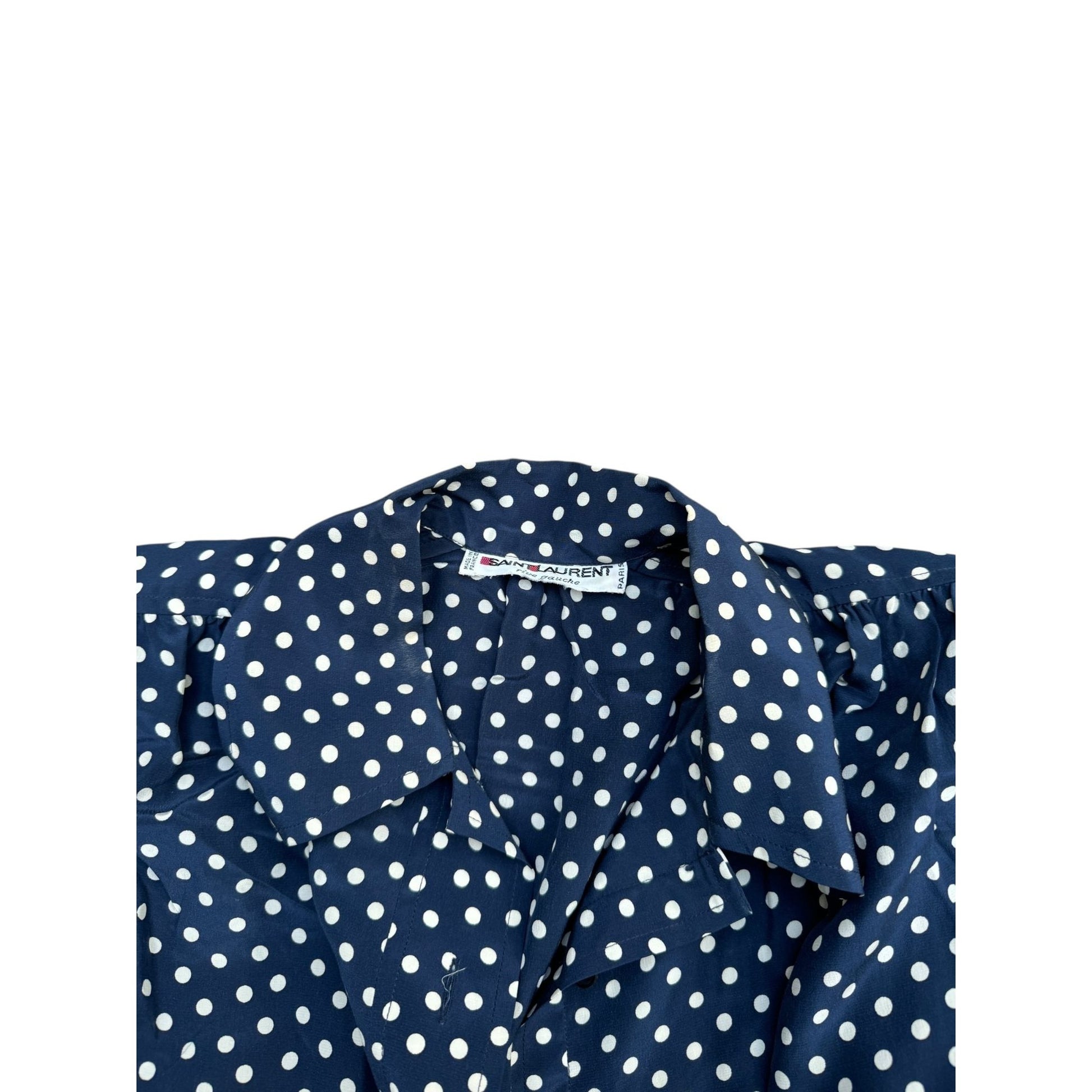 A timeless piece from the archives of Yves Saint Laurent, this 1970s silk dress embodies the playful sophistication and bold femininity that defined the maison’s aesthetic during that era. Crafted in France, the dress features a striking navy blue base adorned with crisp white polka dots, a pattern that remains eternally chic.