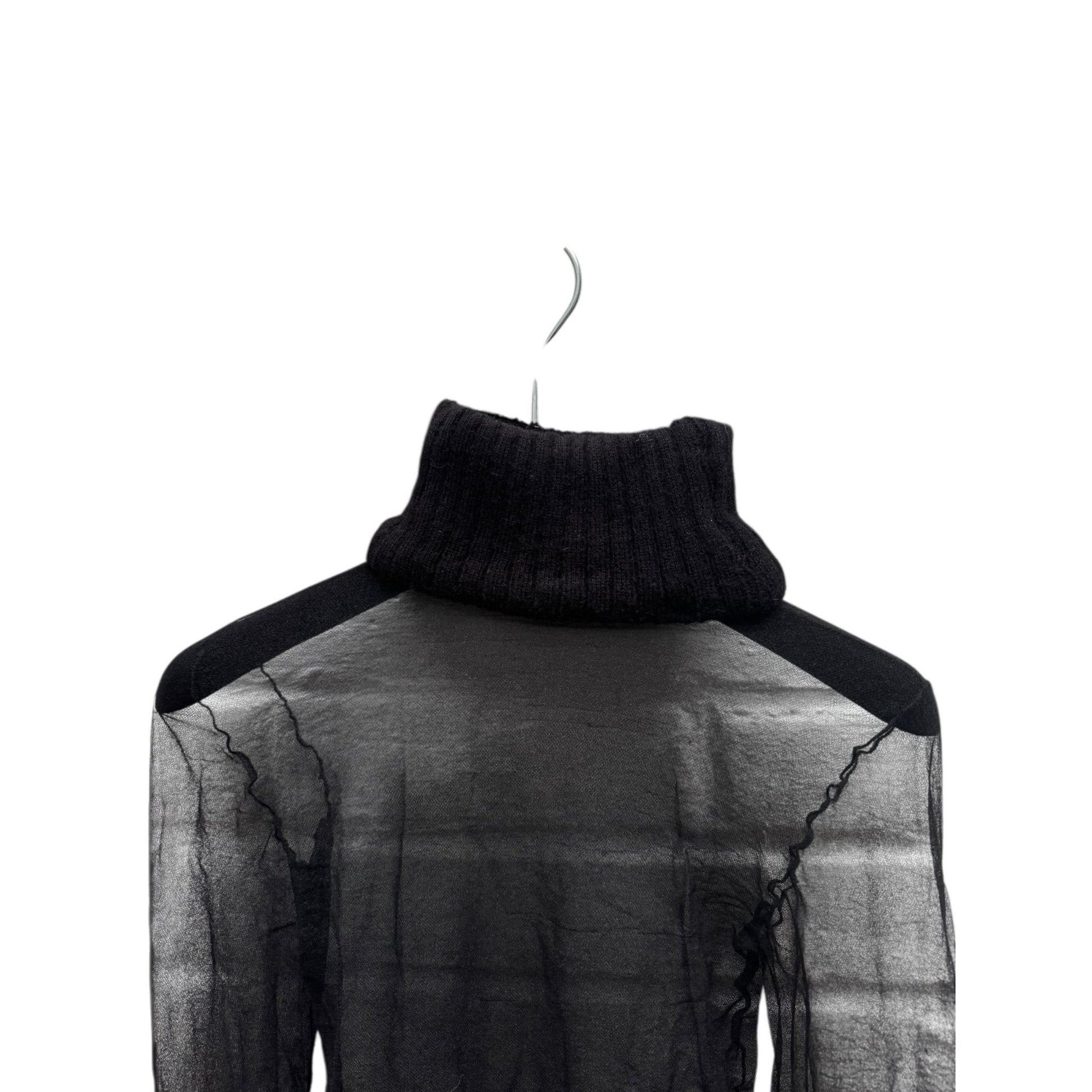 Designed in the house’s signature futuristic aesthetic, this top combines a sheer black nylon body with contrasting chunky wool ribbed detailing at the rollneck, shoulders, and cuffs.