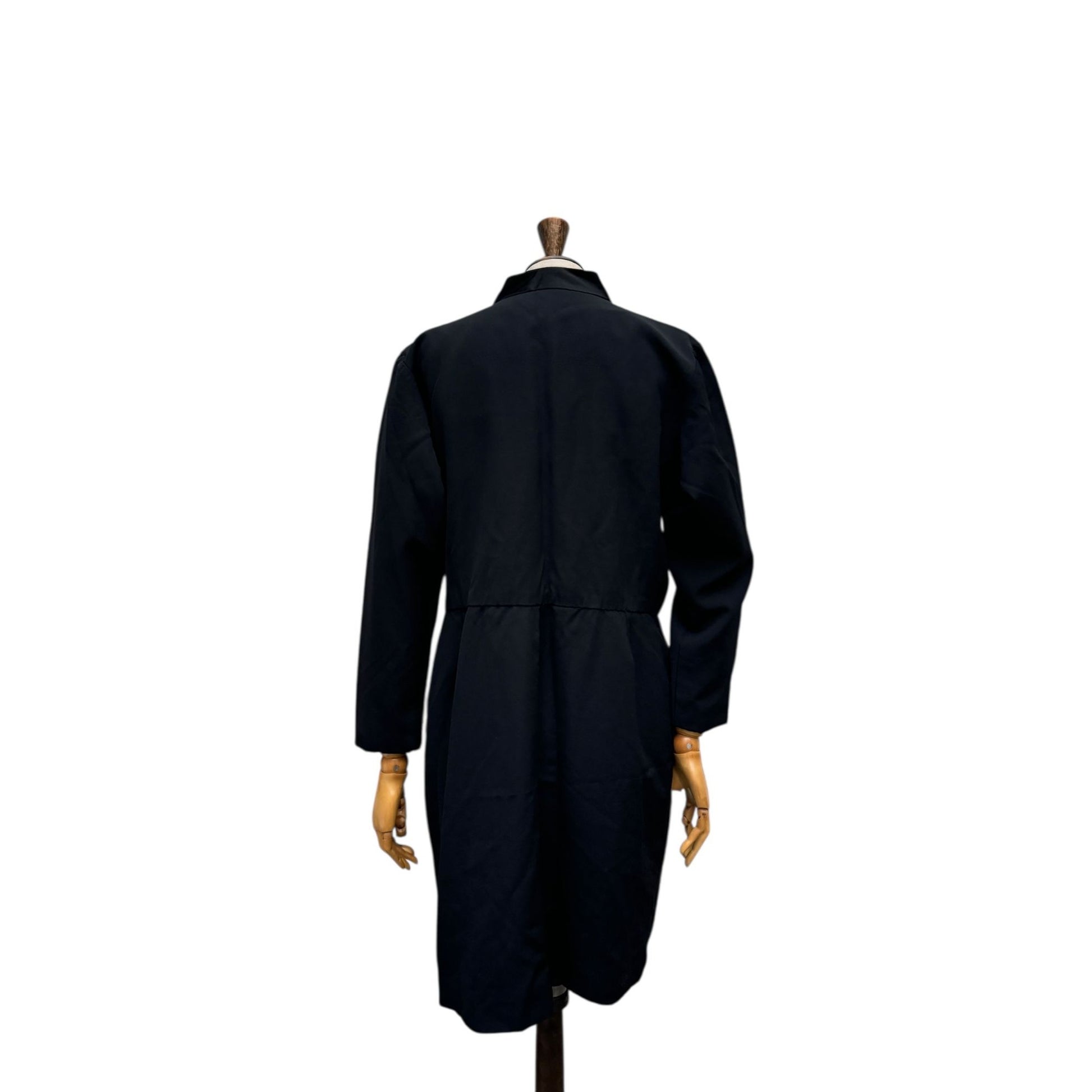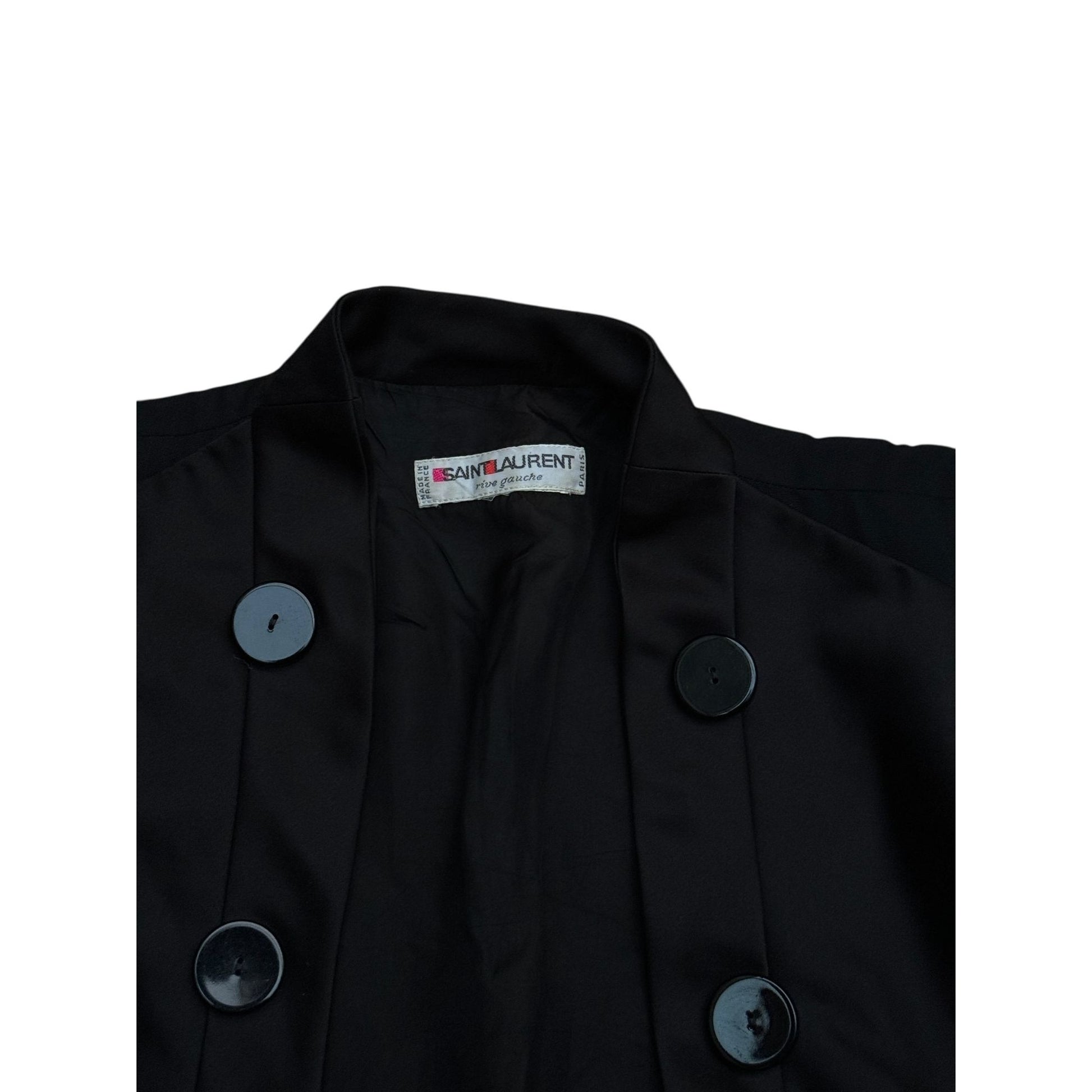 The design features a buttoned front running the full length, adorned with beautiful statement buttons that give the dress a strong graphic presence. The cut is softly tailored with a subtly defined waist, creating a flattering and elegant shape. Side pockets add both practicality and a relaxed sophistication—an iconic YSL detail of the era.