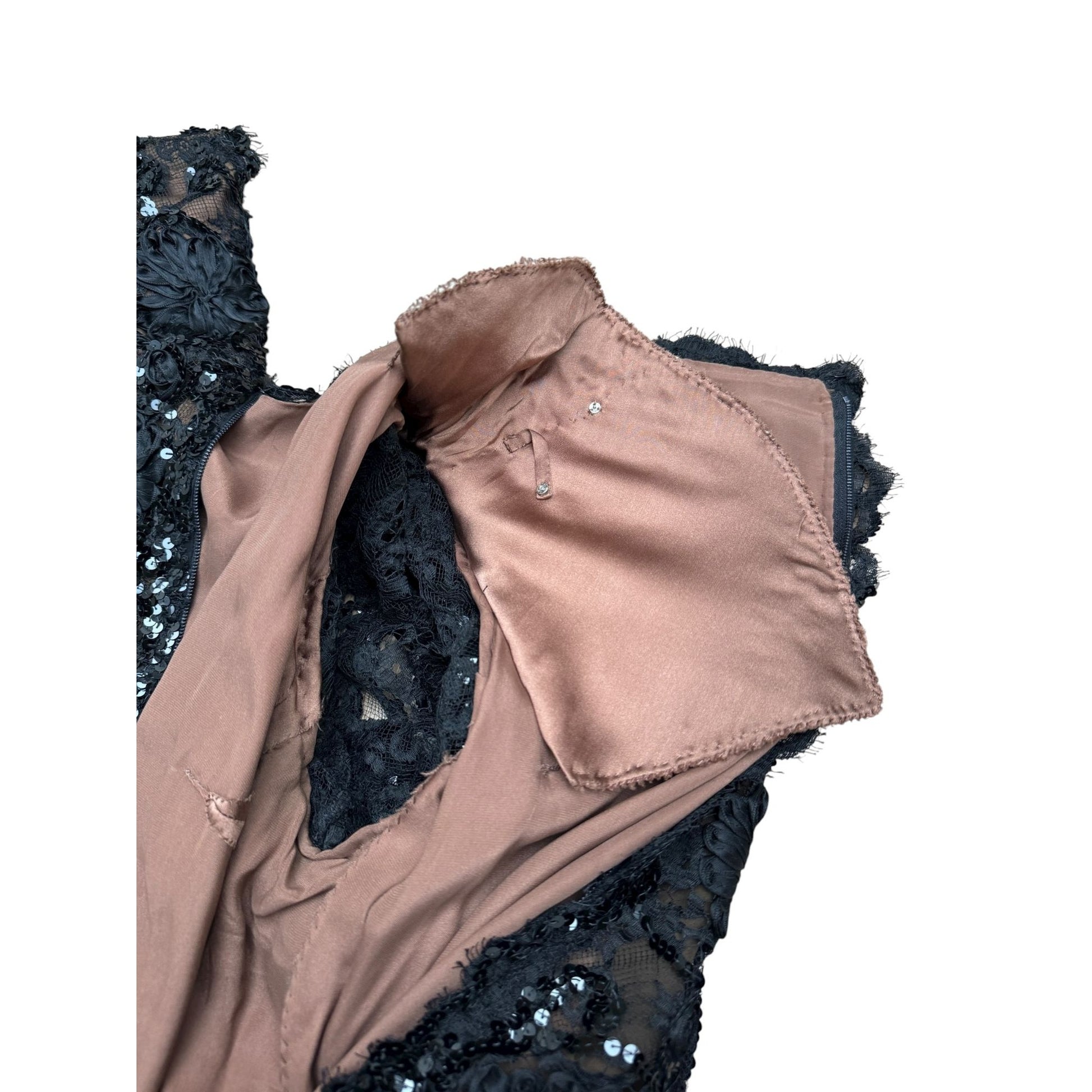 Inside, the dress is lined with rich brown silk, providing a warm contrast to the black sequins while ensuring both comfort and elegance.