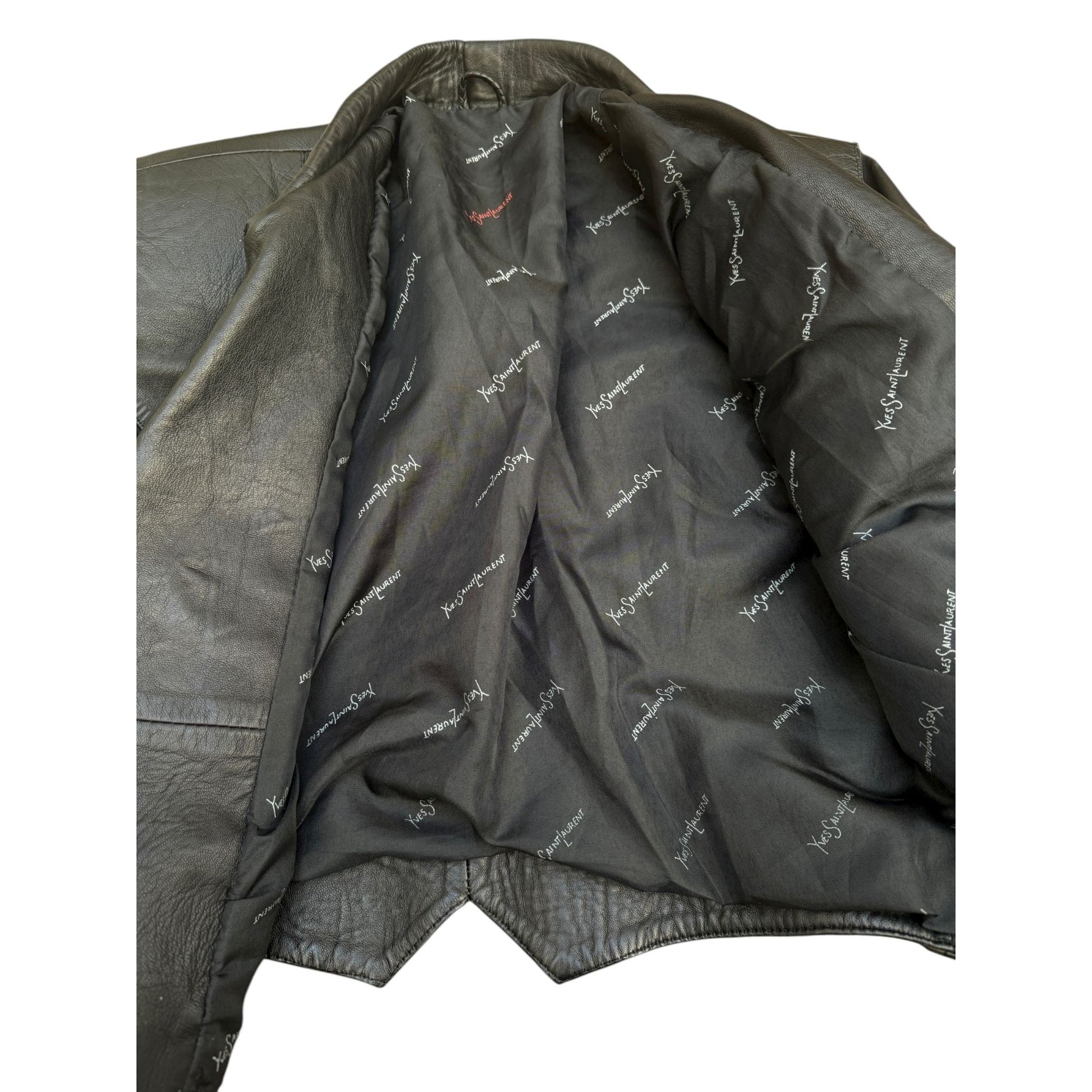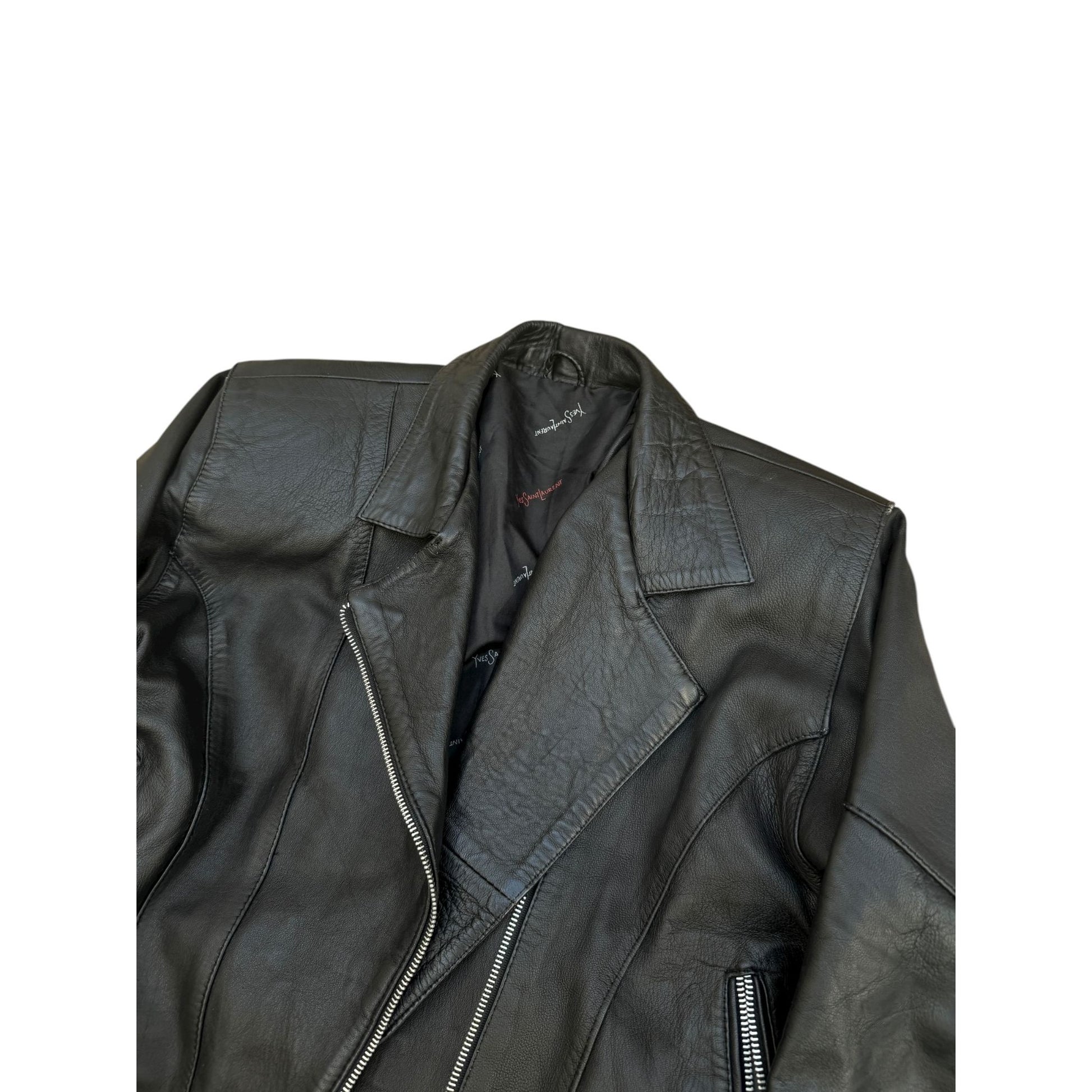 An exceptional vintage Yves Saint Laurent biker jacket from the 1990s, made in France from supple black calfskin leather. This piece captures the spirit of the decade’s powerful silhouettes with its strong shoulders, cinched waist, and cropped cut—a timeless reinterpretation of the classic motorcycle jacket through Saint Laurent’s refined lens.