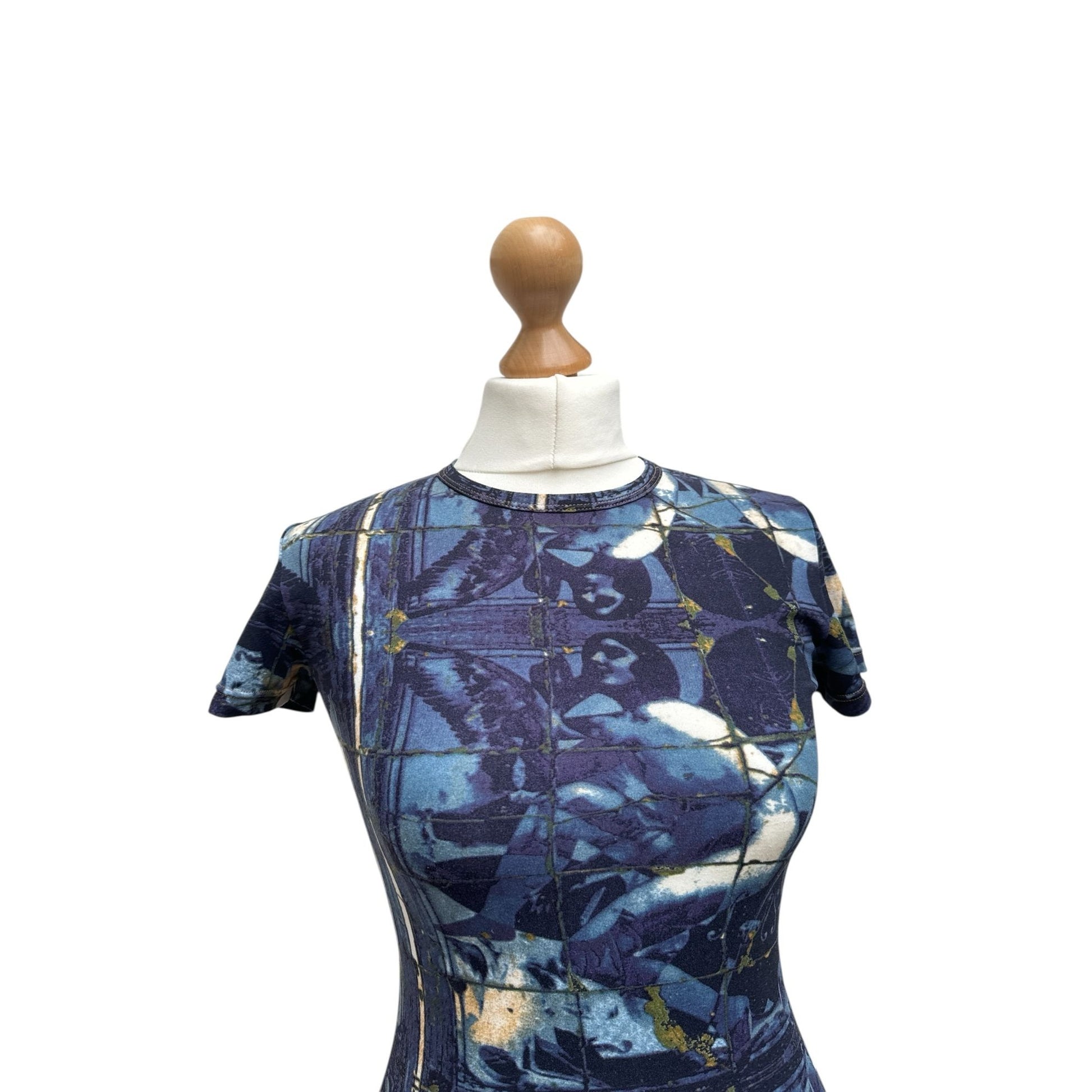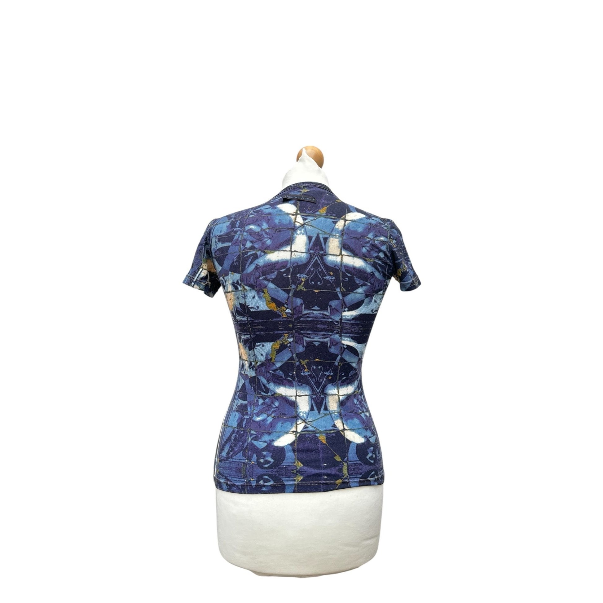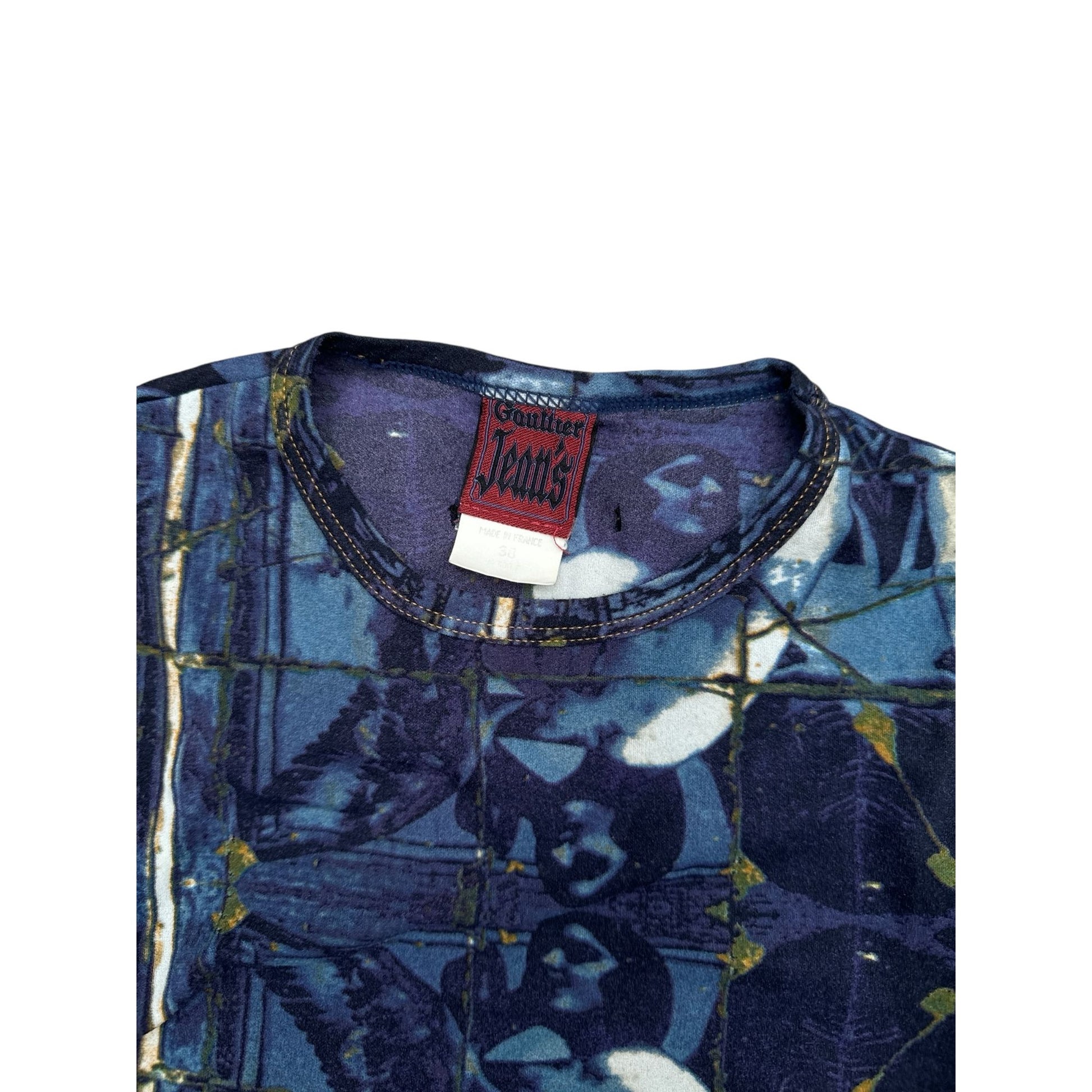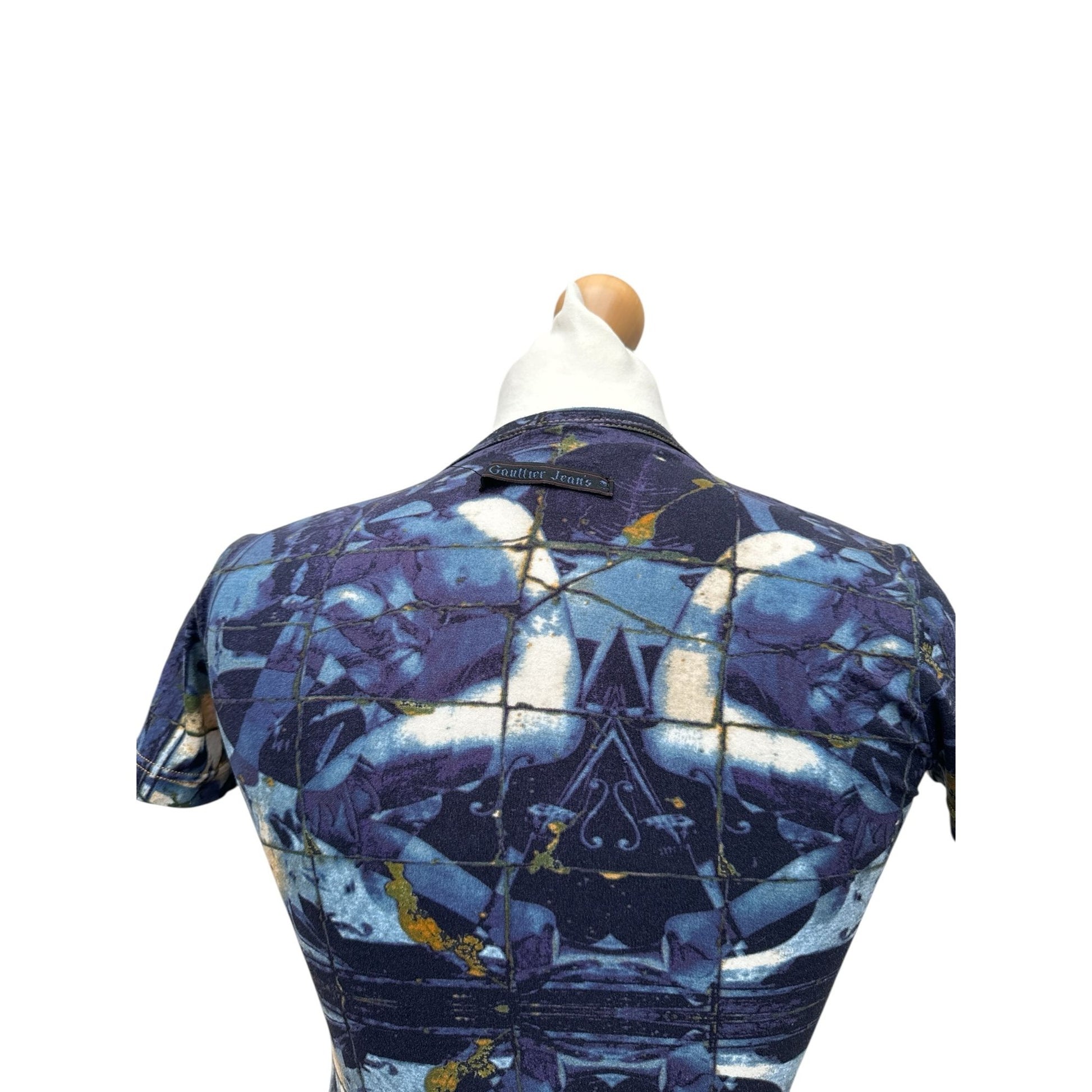 This rare 1990s Jean Paul Gaultier mesh top features an intricate all-over print in deep blue tones with golden accents, creating a visually striking and art-inspired pattern.