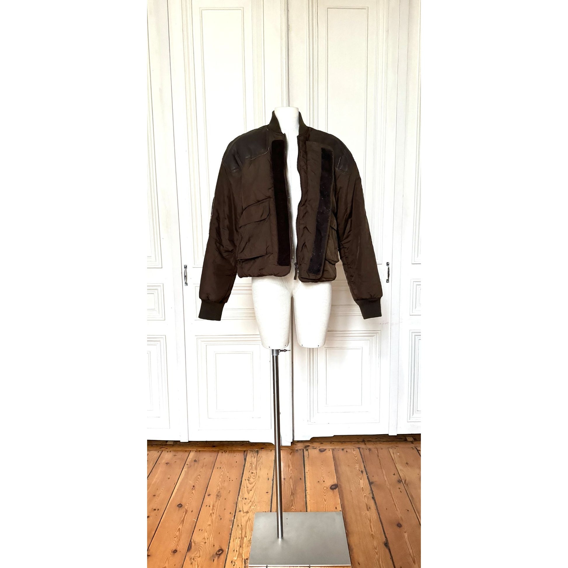 A rare 1990s JPG bomber in deep brown nylon, designed with utilitarian details and signature Gaultier edge. Cut in a boxy, slightly cropped silhouette with a high rib-knit collar and matching ribbed cuffs/hem for that classic bomber shape. Finished with leather yokes at the shoulders (and leather panels at the sleeves), plus adjustable lace-up side panels, in a corset style for a more custom fit and layering versatility.