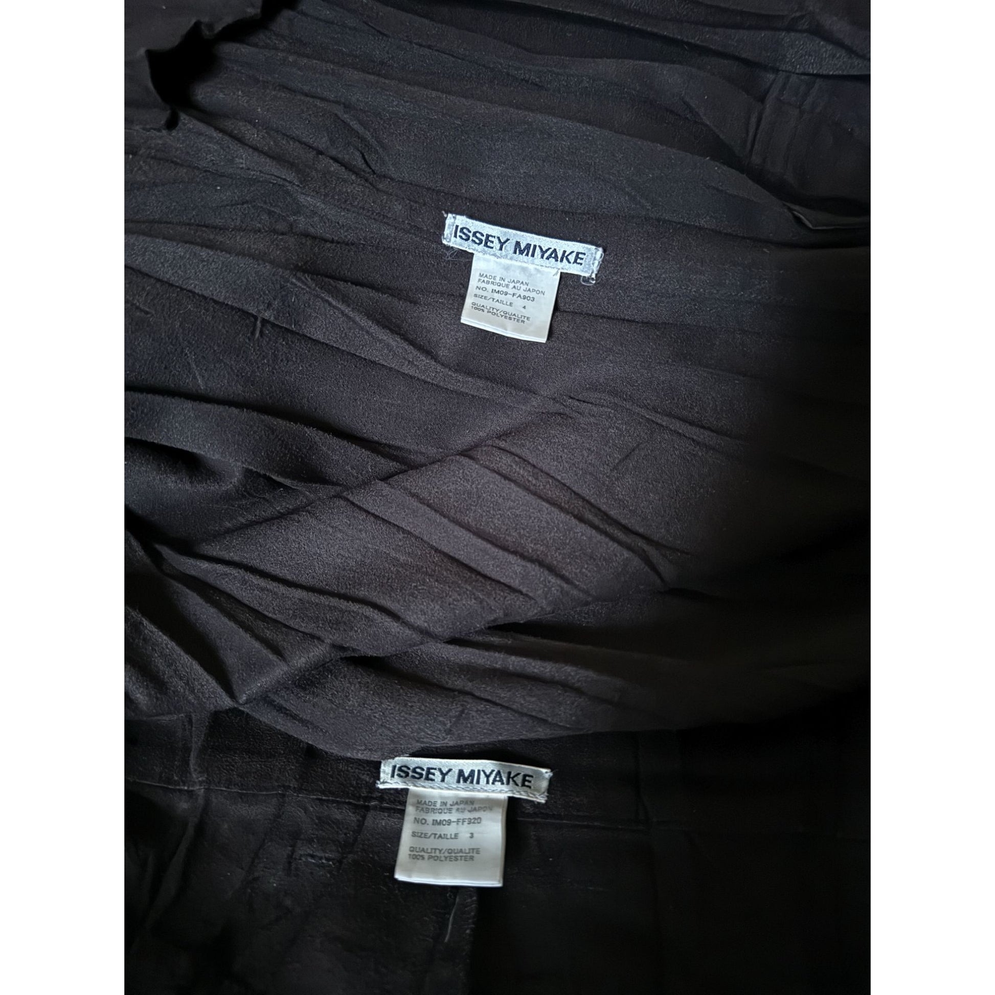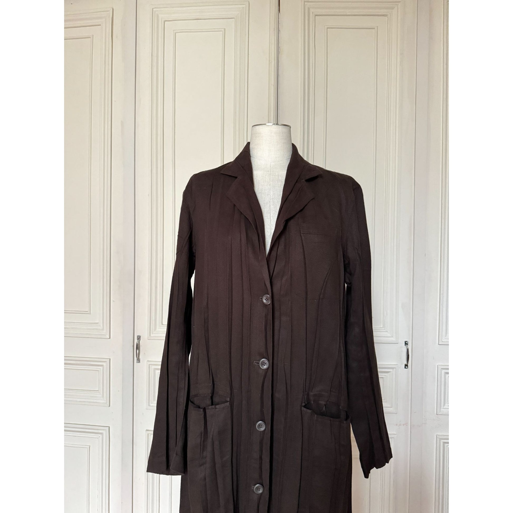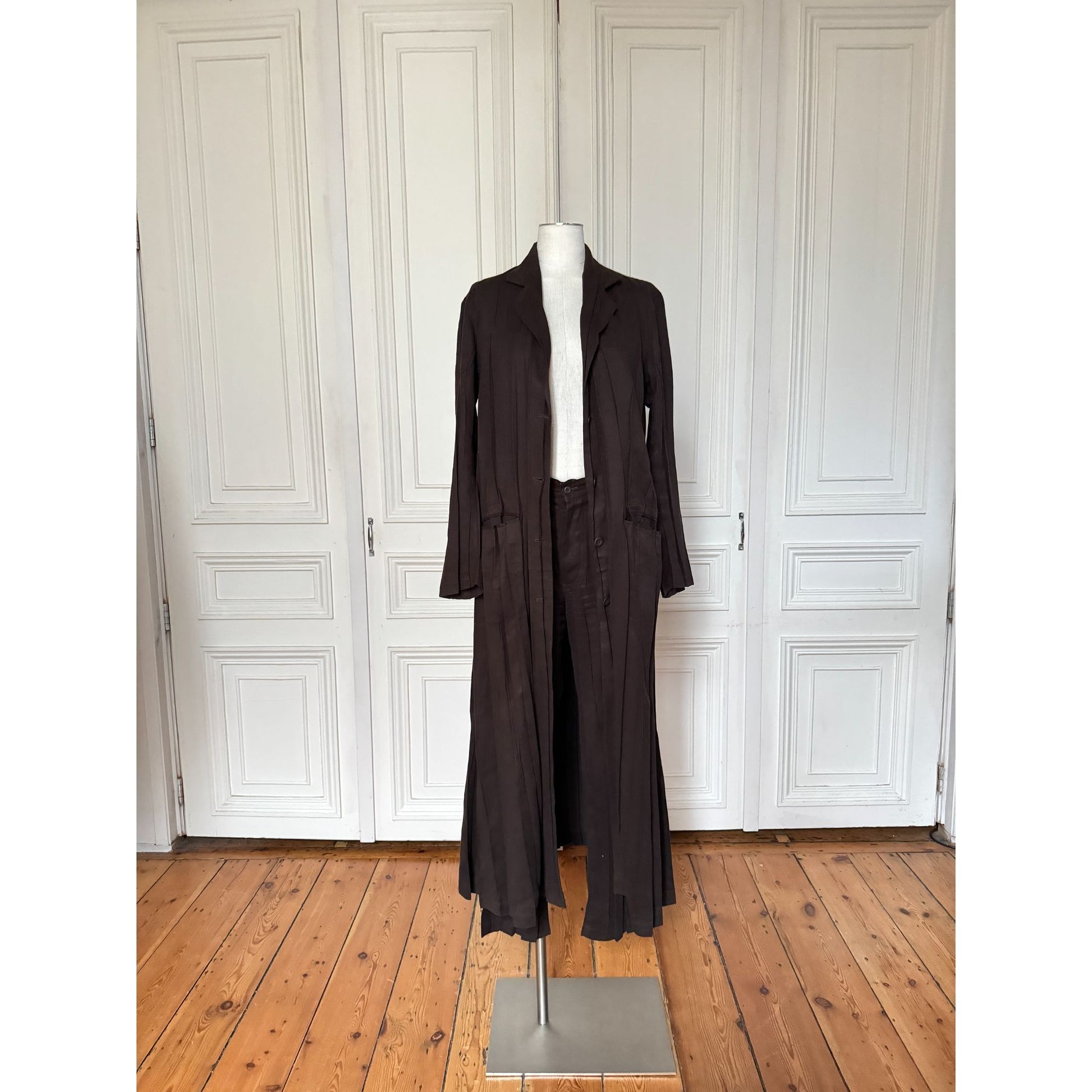A rare early-1990s Issey Miyake two-piece suit in a deep chocolate-brown “moleskin” polyester—exceptionally smooth to the touch with a soft, velvety handle and fluid drape. The set features a longline jacket with a relaxed, elongated silhouette and a clean button-front, paired with straight-leg trousers for an understated, minimalist look typical of the era. Worn together as a full statement or styled separately as elevated wardrobe staples.
