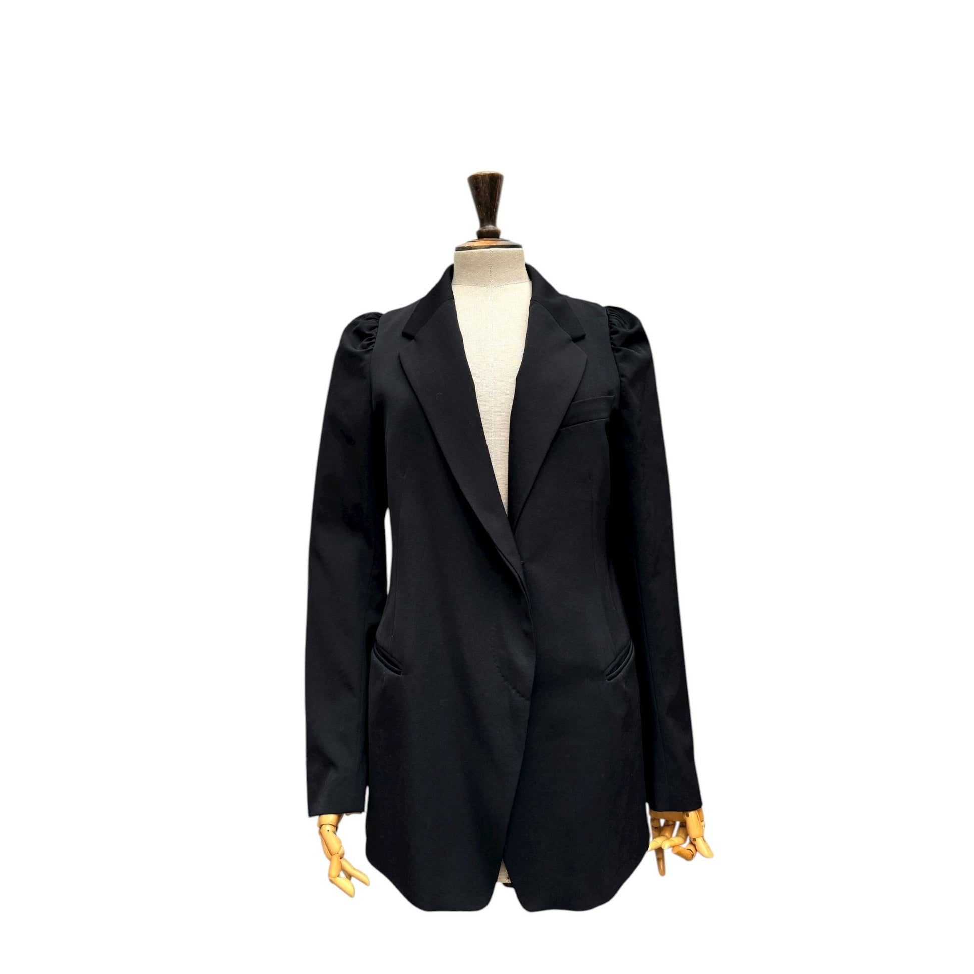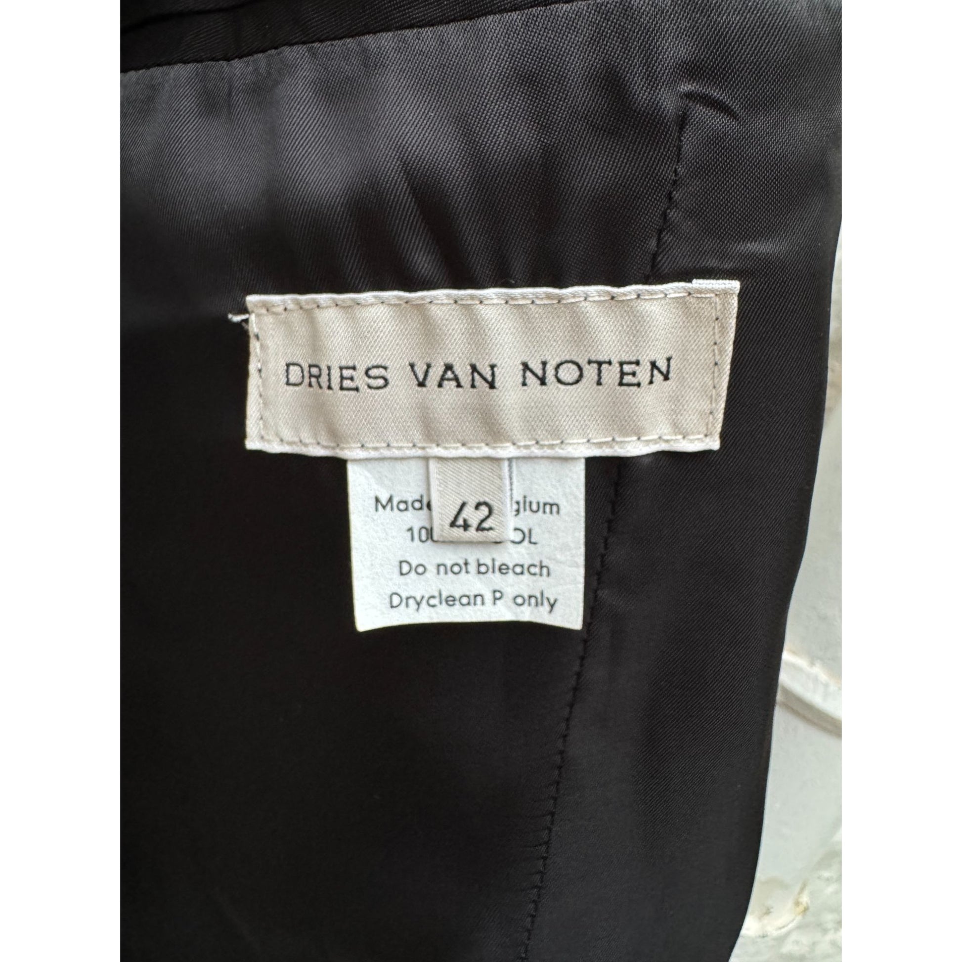 The blazer features a hidden two-button closure, notched lapels, and discreet front pockets, offering a minimalist yet sculptural design that defines Dries Van Noten’s refined aesthetic. The exaggerated shoulder line contrasts beautifully with the long, fluid body, creating a look that is both powerful and understated.