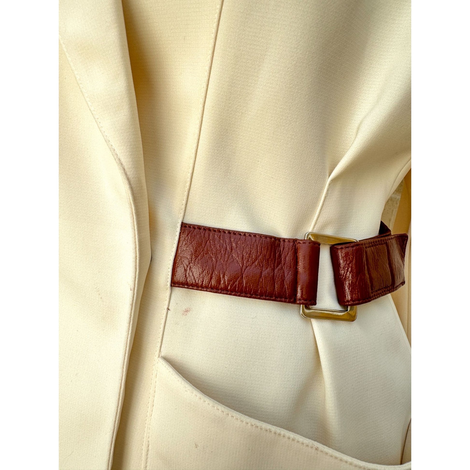 A striking example of Thierry Mugler’s sculptural tailoring from the 1990s, this cream blazer embodies the designer’s signature power silhouette. Featuring a sharp, wide lapel, cinched waist with brown leather side straps, and oversized patch pockets, it combines strong lines with feminine elegance.