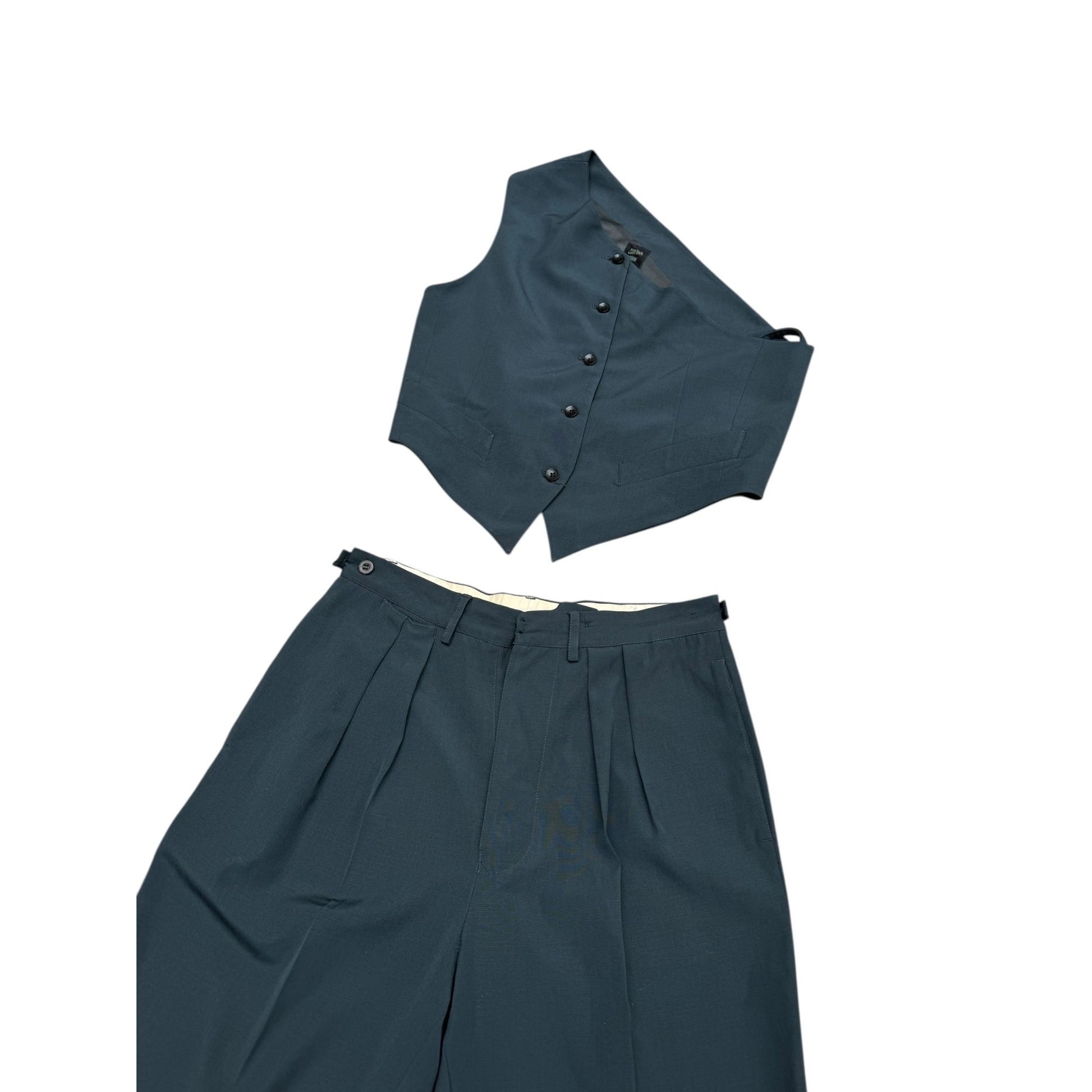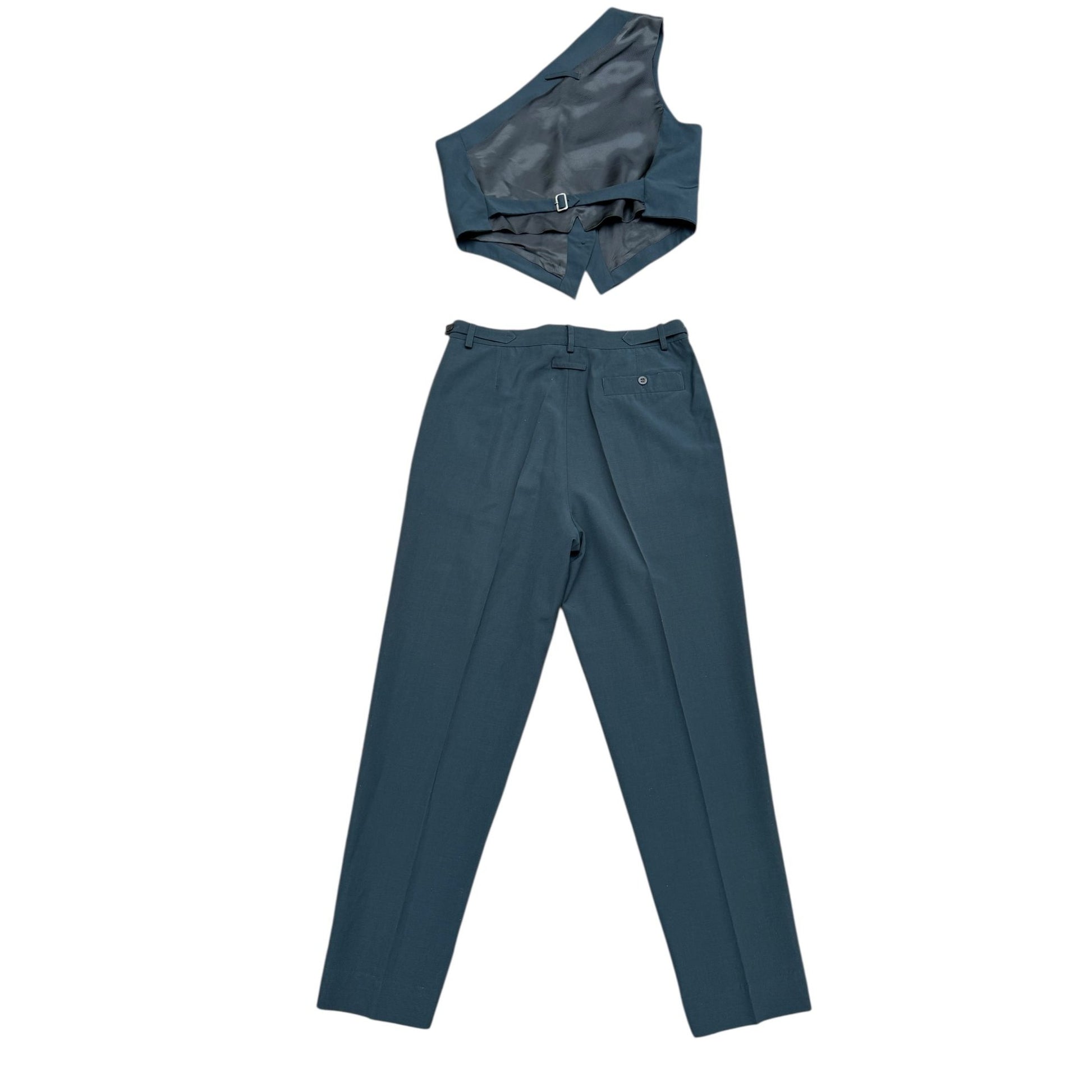 The standout piece is the asymmetrical vest, an iconic Gaultier construction that brings architectural character and unmistakable designer identity to the suit. This unique cut transforms a classic ensemble into a collectible fashion statement.