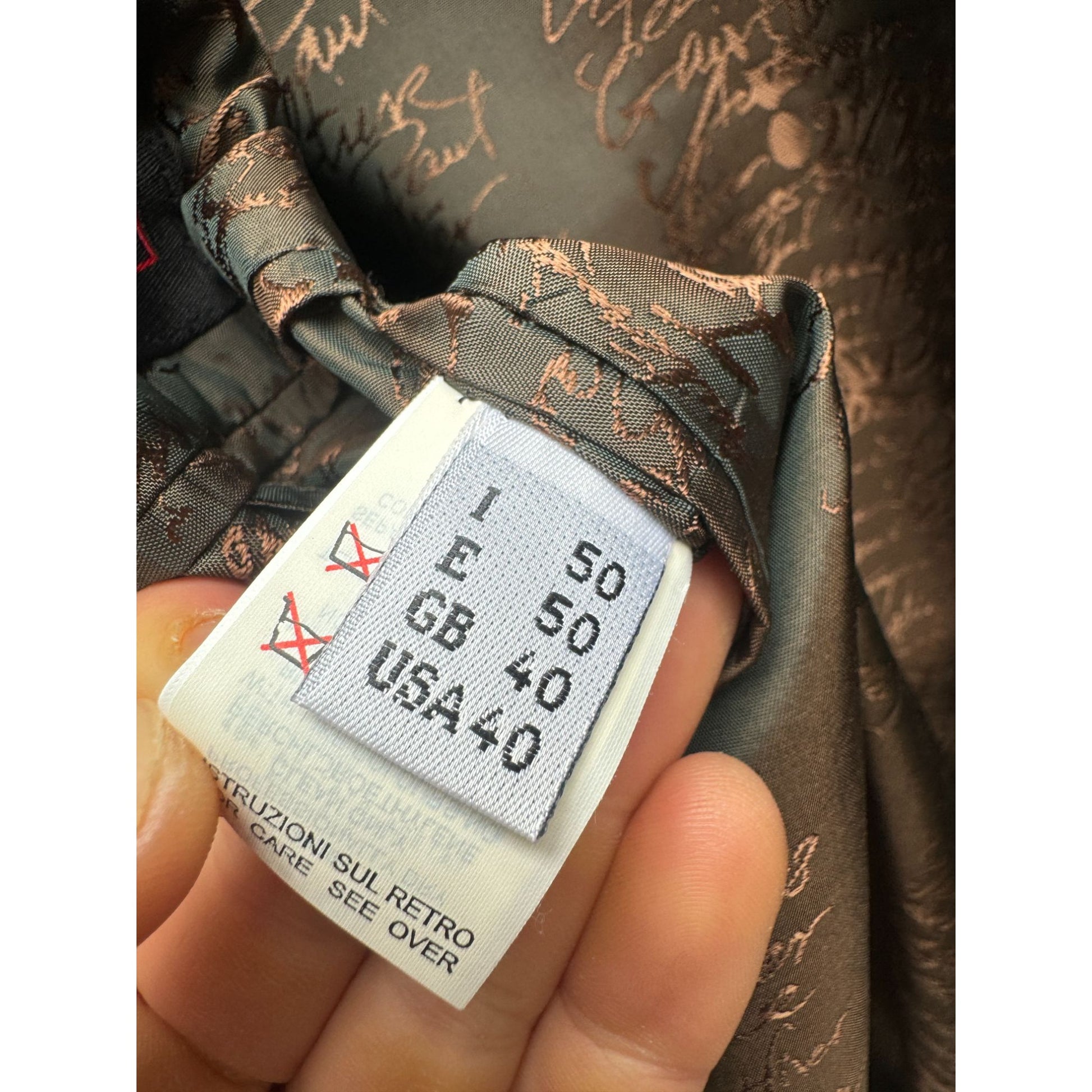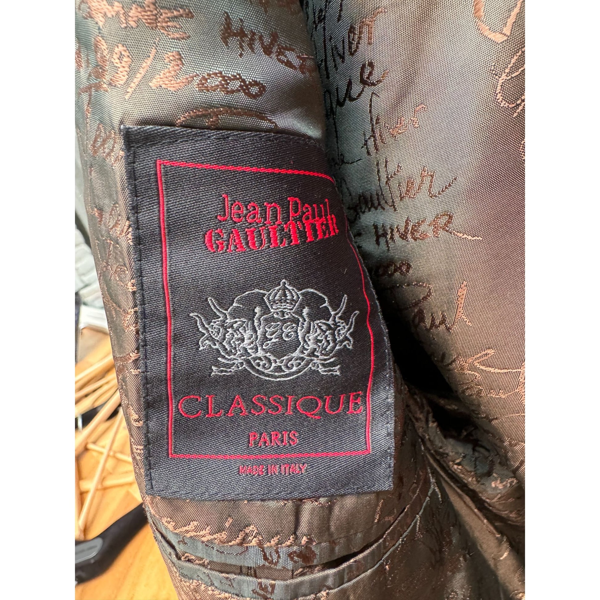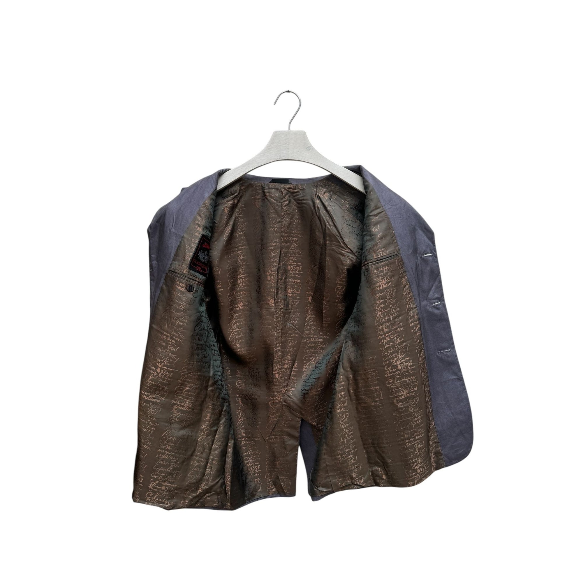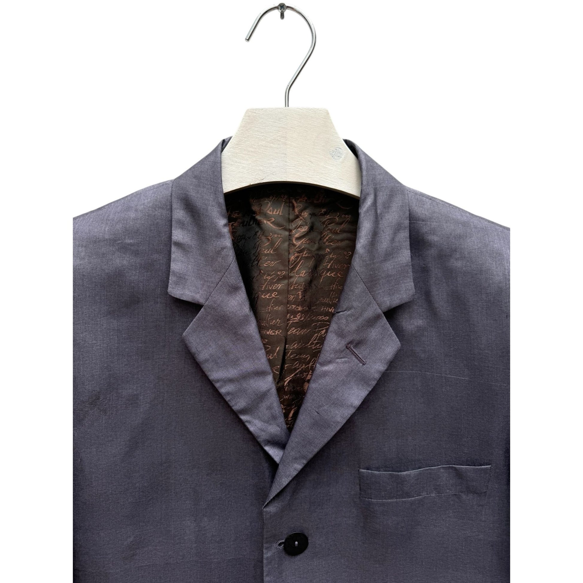 Featuring a classic three-button front closure, this piece is distinguished by its exquisite lining—a sophisticated composition of 52% viscose and 48% acetate, showcasing intricate details and the signature Jean Paul Gaultier style.
