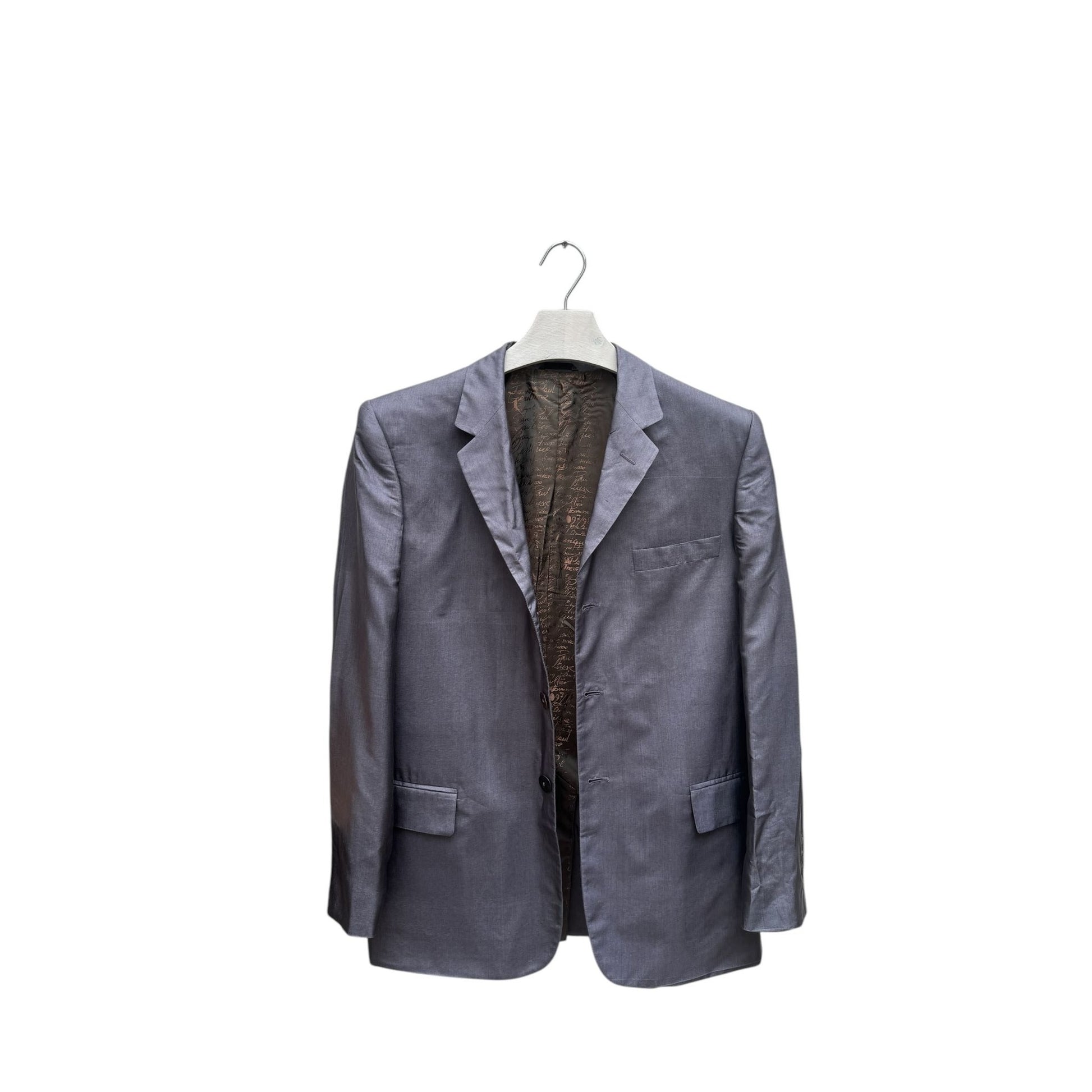 This remarkable Jean Paul Gaultier blazer from the 1990s epitomizes timeless sophistication and iconic style. Crafted in Italy from luxurious 100% silk, this blazer boasts a unique iridescent grey hue, offering subtle shifts in color and an elegant sheen that catches the light beautifully.