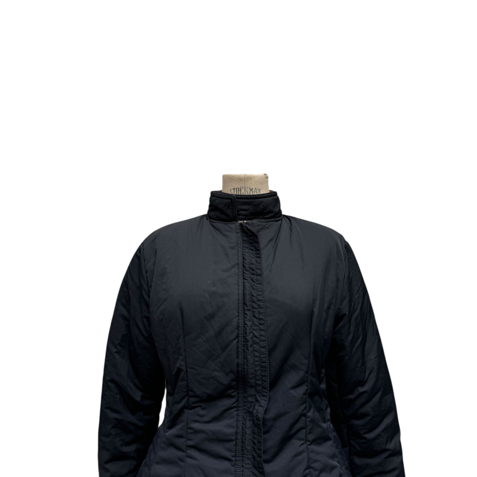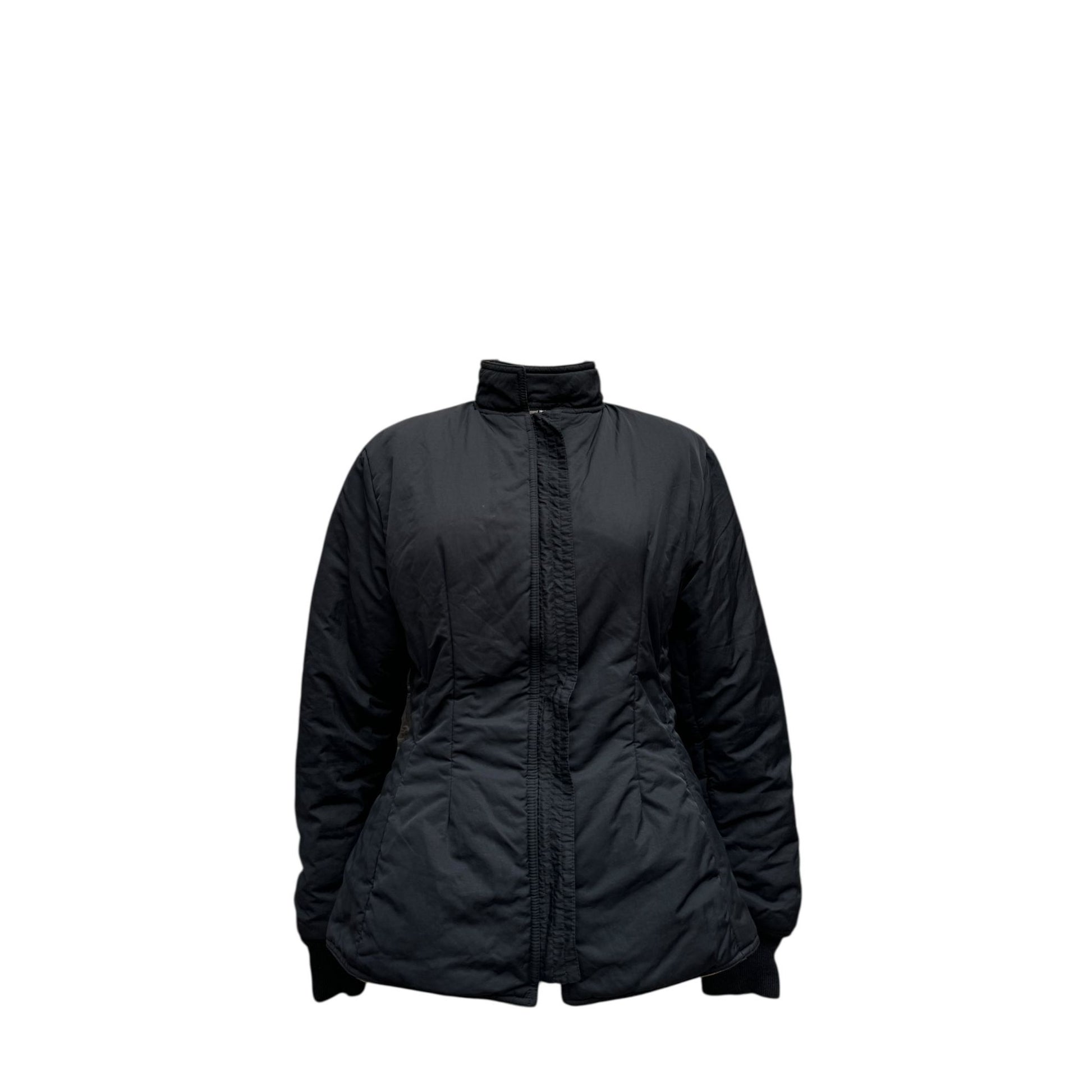 This exceptional Jean Paul Gaultier piece is a true collector’s item, showcasing the designer’s avant-garde vision with a functional twist. The jacket is fully reversible, offering two distinct styles in one: a sleek solid black side with a minimalist silhouette, and a bold camouflage side in earthy tones of green, brown, and mustard yellow, accented with a slight sheen.