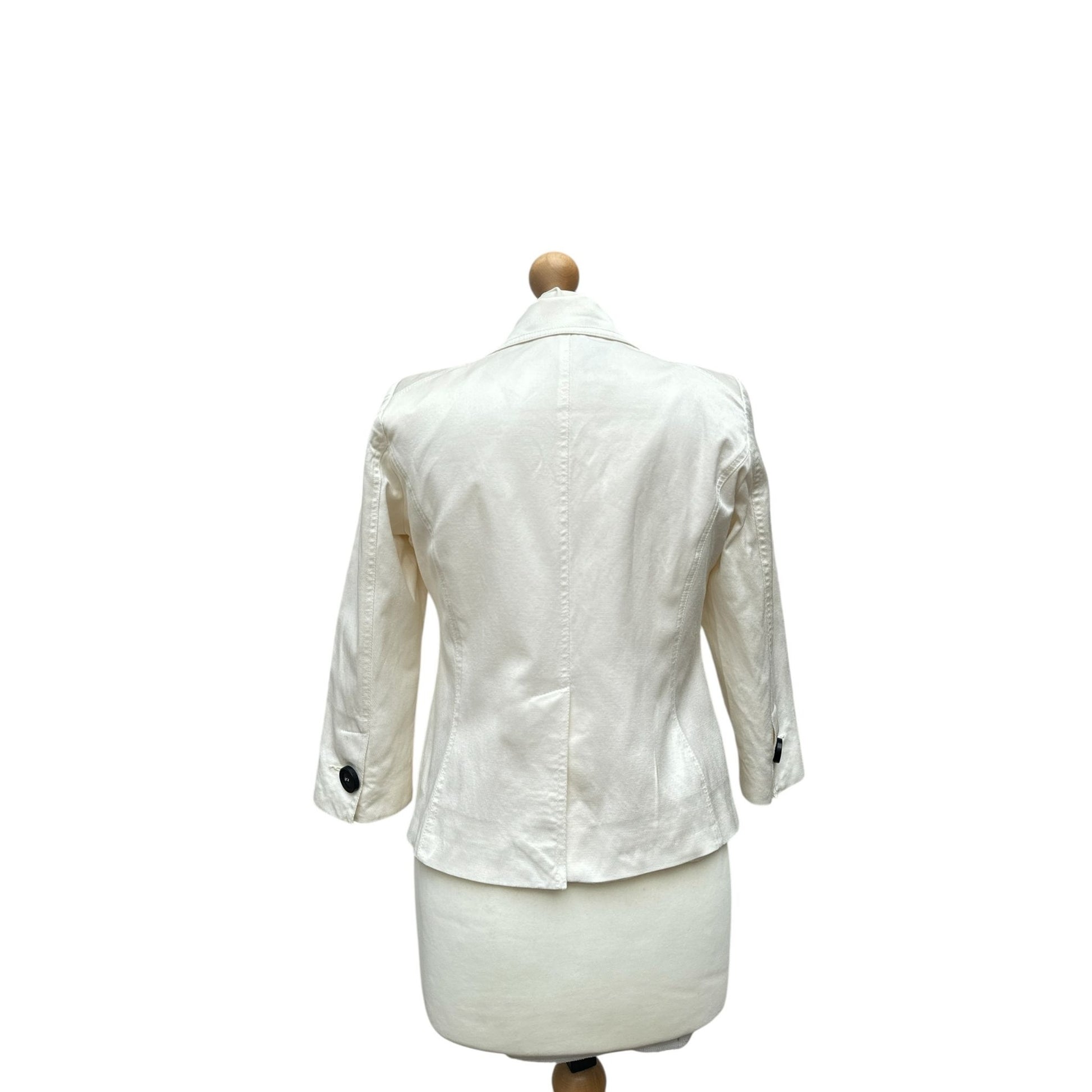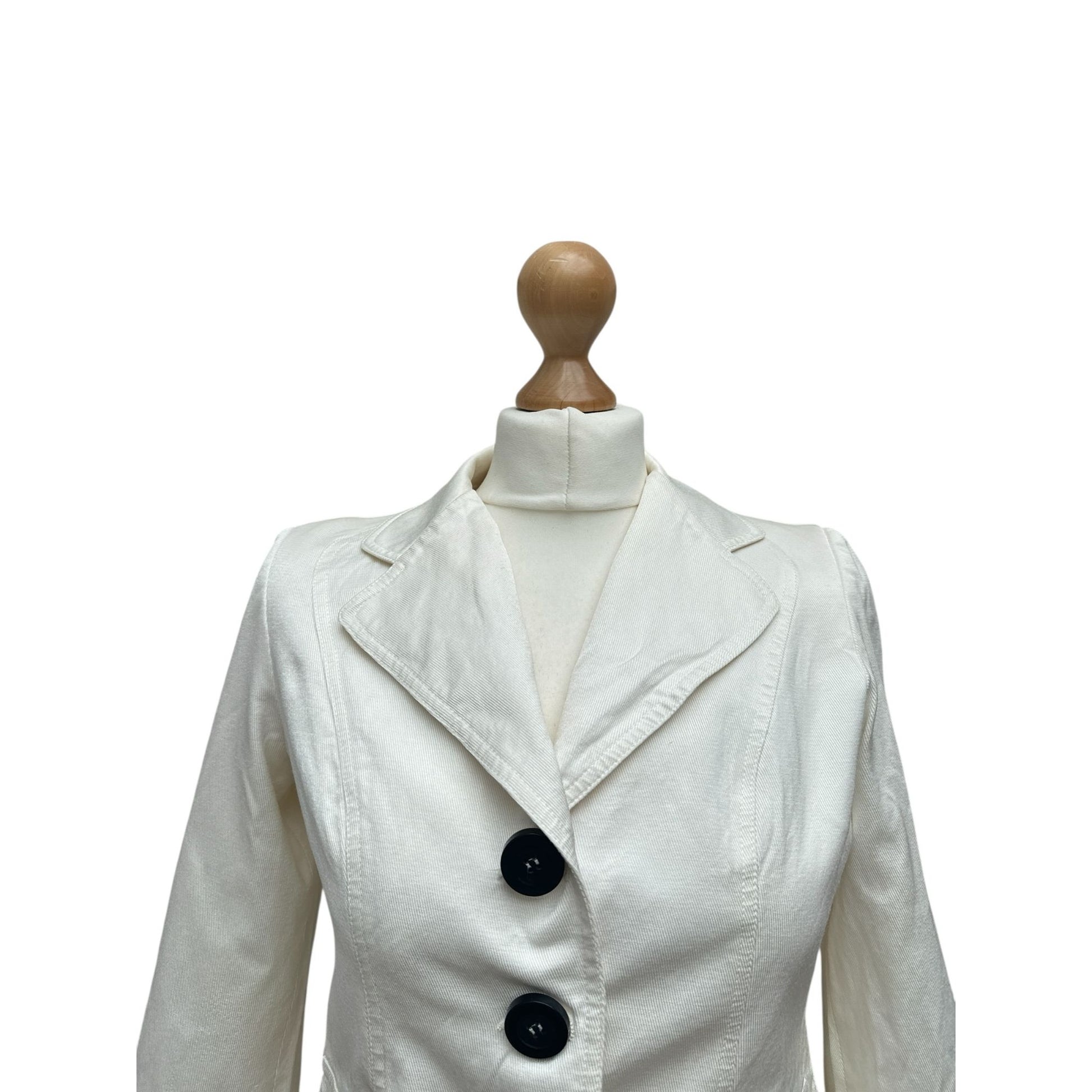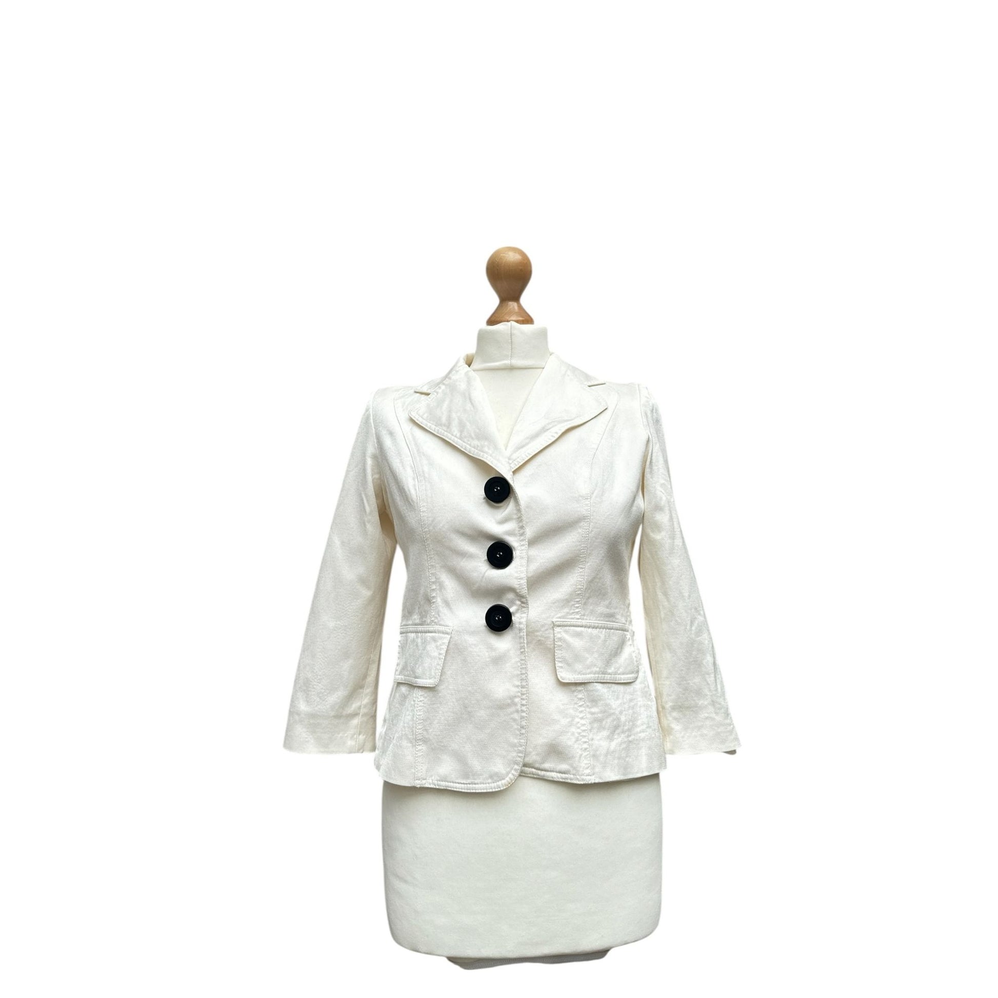Crafted in Italy from a luxurious cotton-viscose blend with a touch of elastane for comfort, the jacket features a structured yet flattering cut, a classic notched lapel, and a three-button front closure in contrasting black.