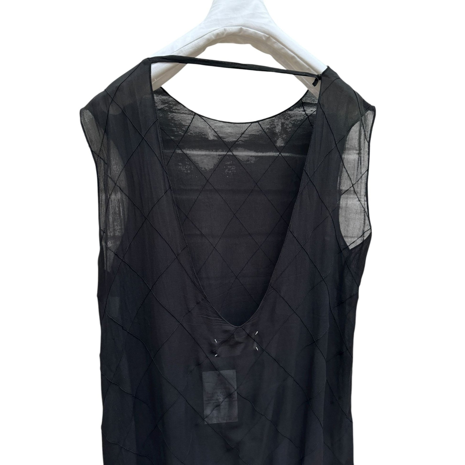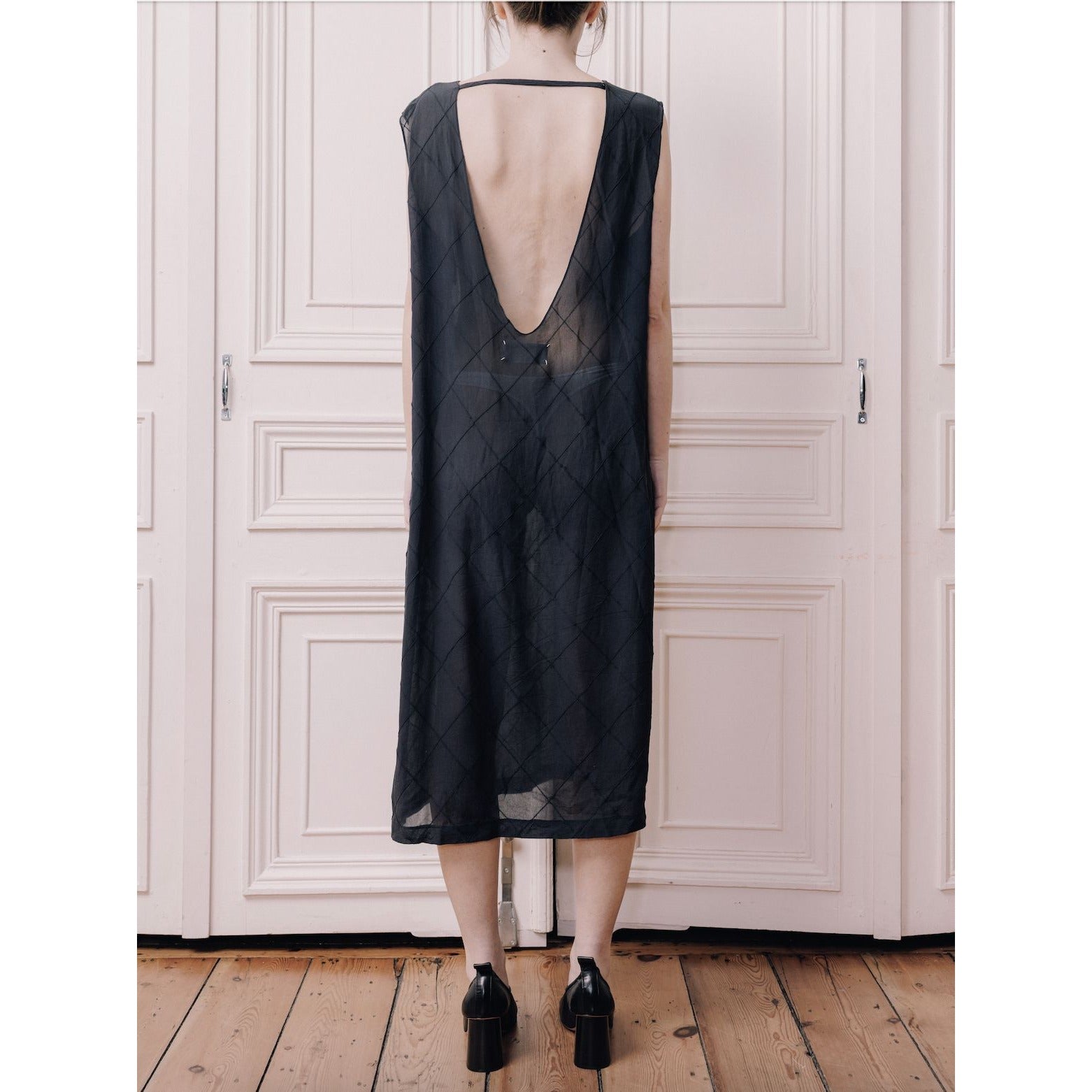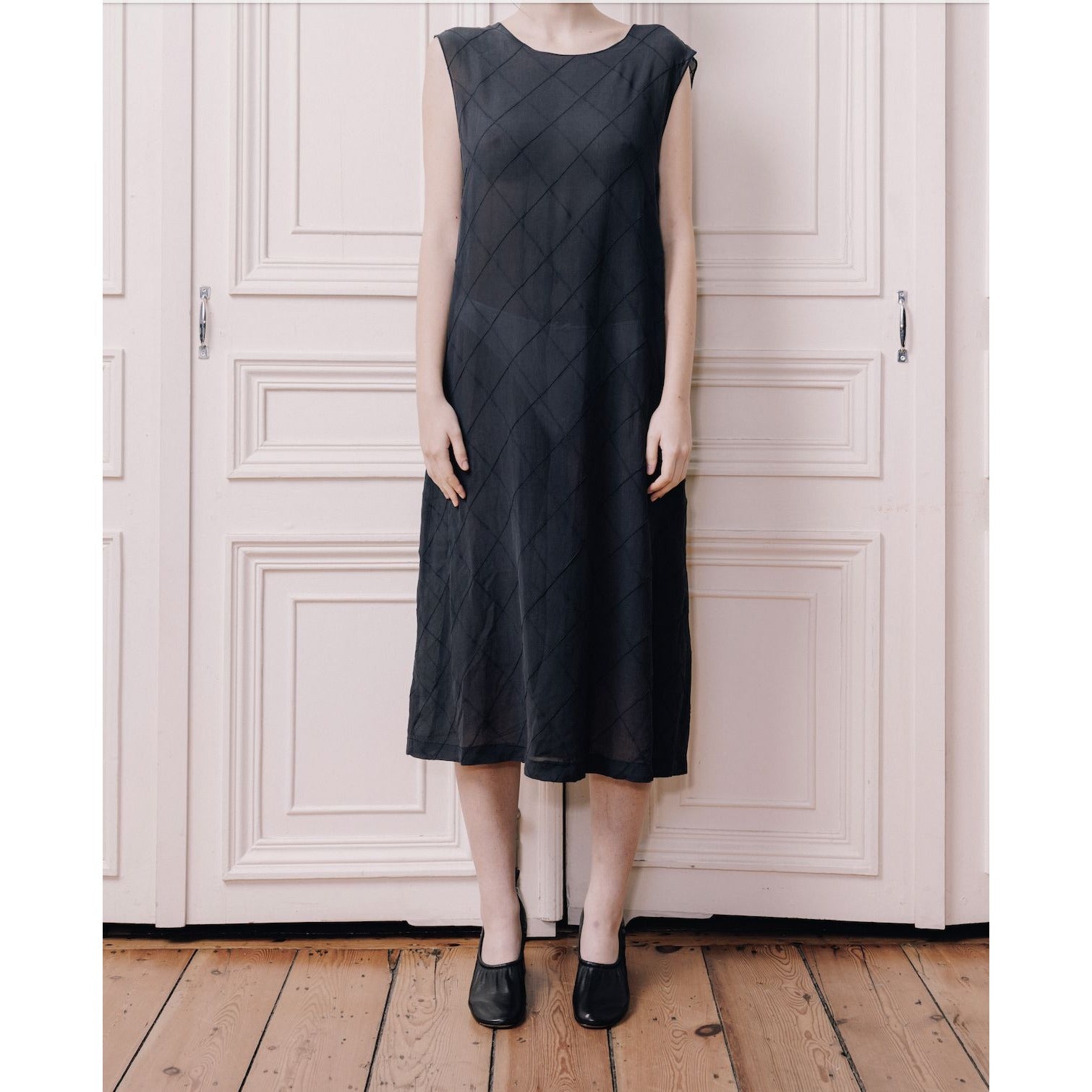 Made in France from 100% sheer silk, the dress features an ethereal transparency and a subtle midnight blue–dark grey hue that shifts gently under light. The surface is defined by diamond-pattern stitching, a technique that forms both structure and ornament — a restrained yet unmistakable nod to the designer’s fascination with process and texture.