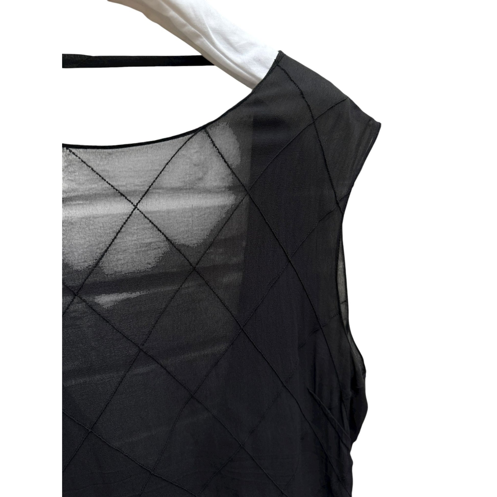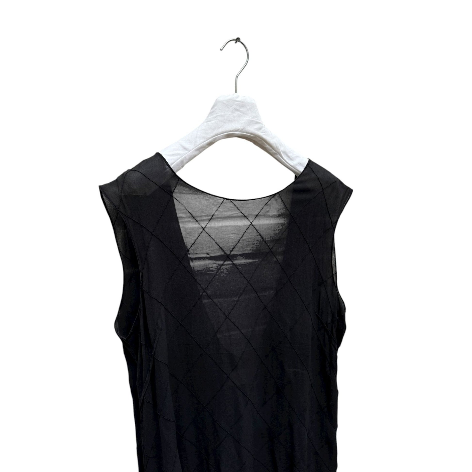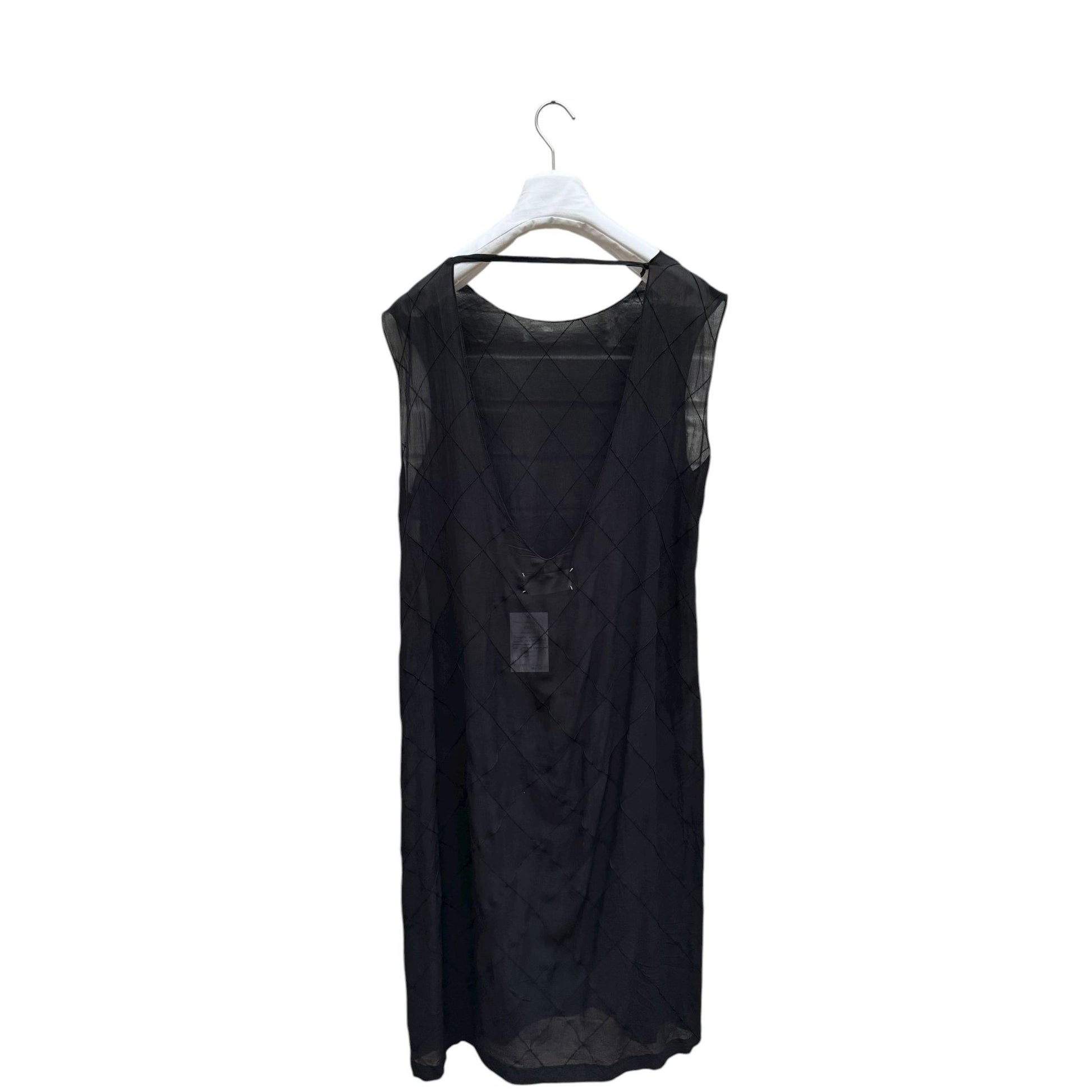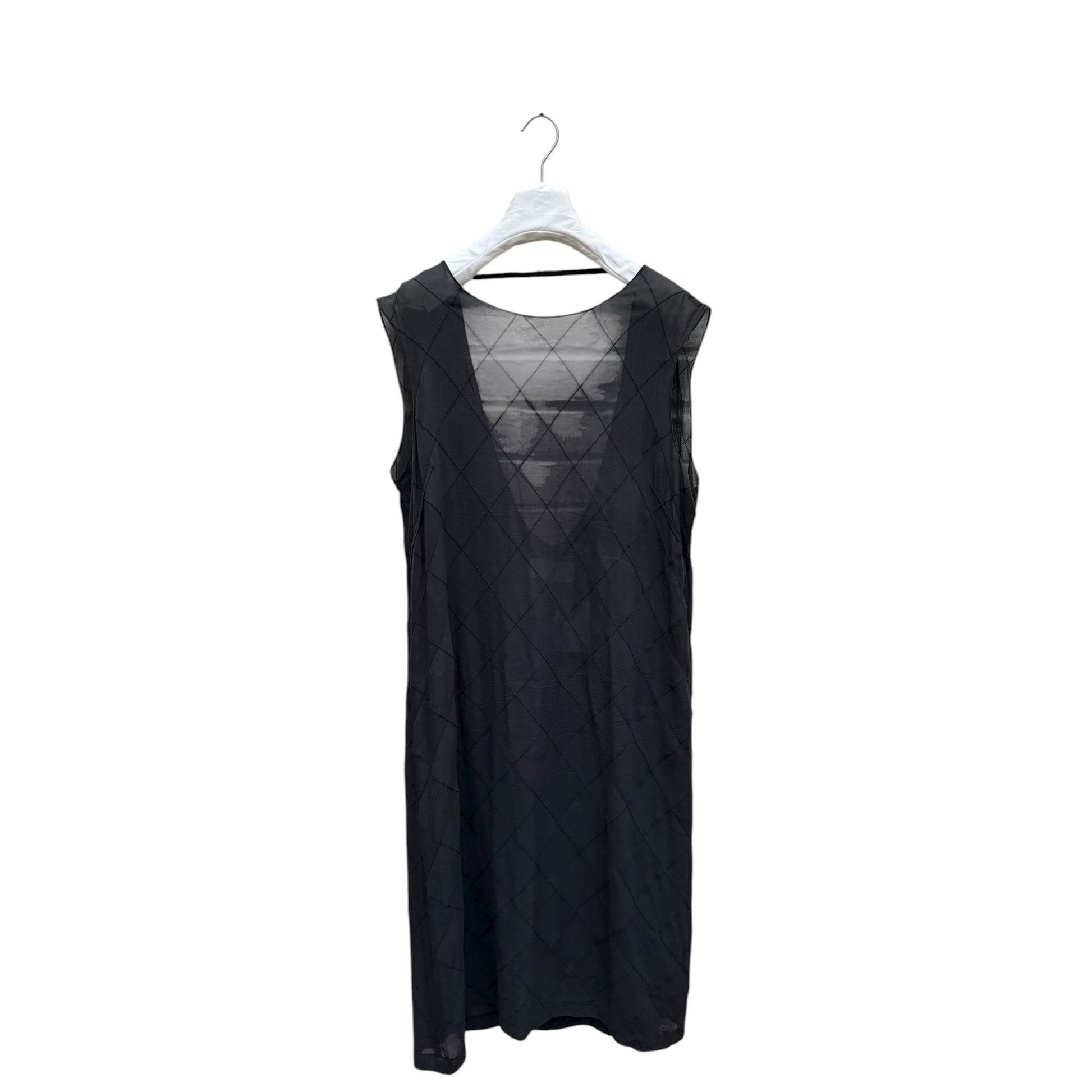 Made in France from 100% sheer silk, the dress features an ethereal transparency and a subtle midnight blue–dark grey hue that shifts gently under light. The surface is defined by diamond-pattern stitching, a technique that forms both structure and ornament — a restrained yet unmistakable nod to the designer’s fascination with process and texture.