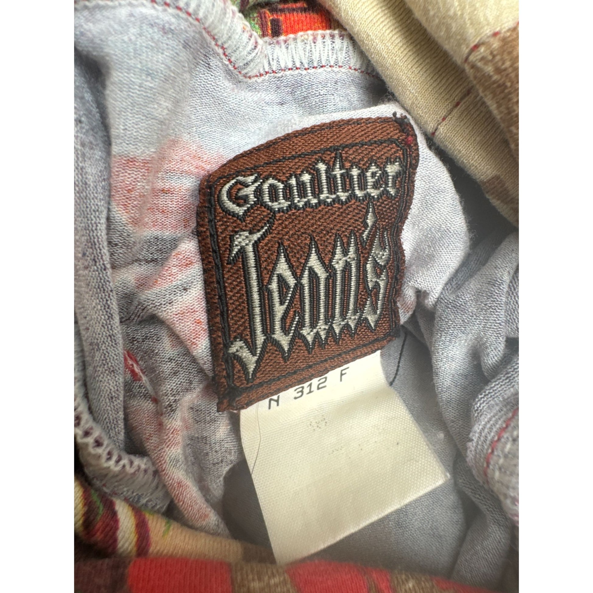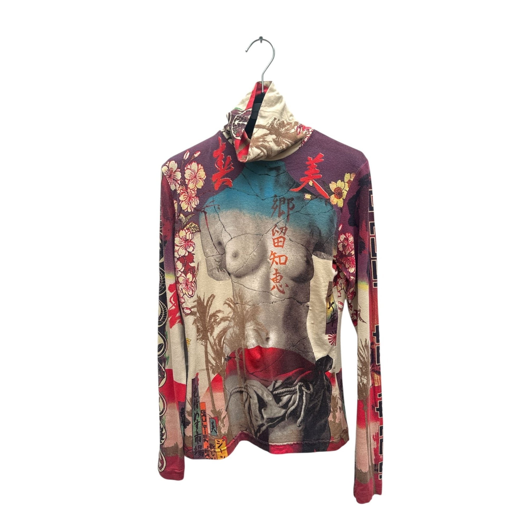 An exceptionally rare archival piece from Jean Paul Gaultier's 1999 collection under the Gaultier Jeans line, this long sleeve top fuses classical iconography with Eastern-inspired motifs. Featuring a graphic reinterpretation of the Venus de Milo statue surrounded by Kanji characters, hibiscus florals, palm trees, and butterflies, it showcases the designer’s signature ability to blend surrealism, sensuality, and cultural contrast.