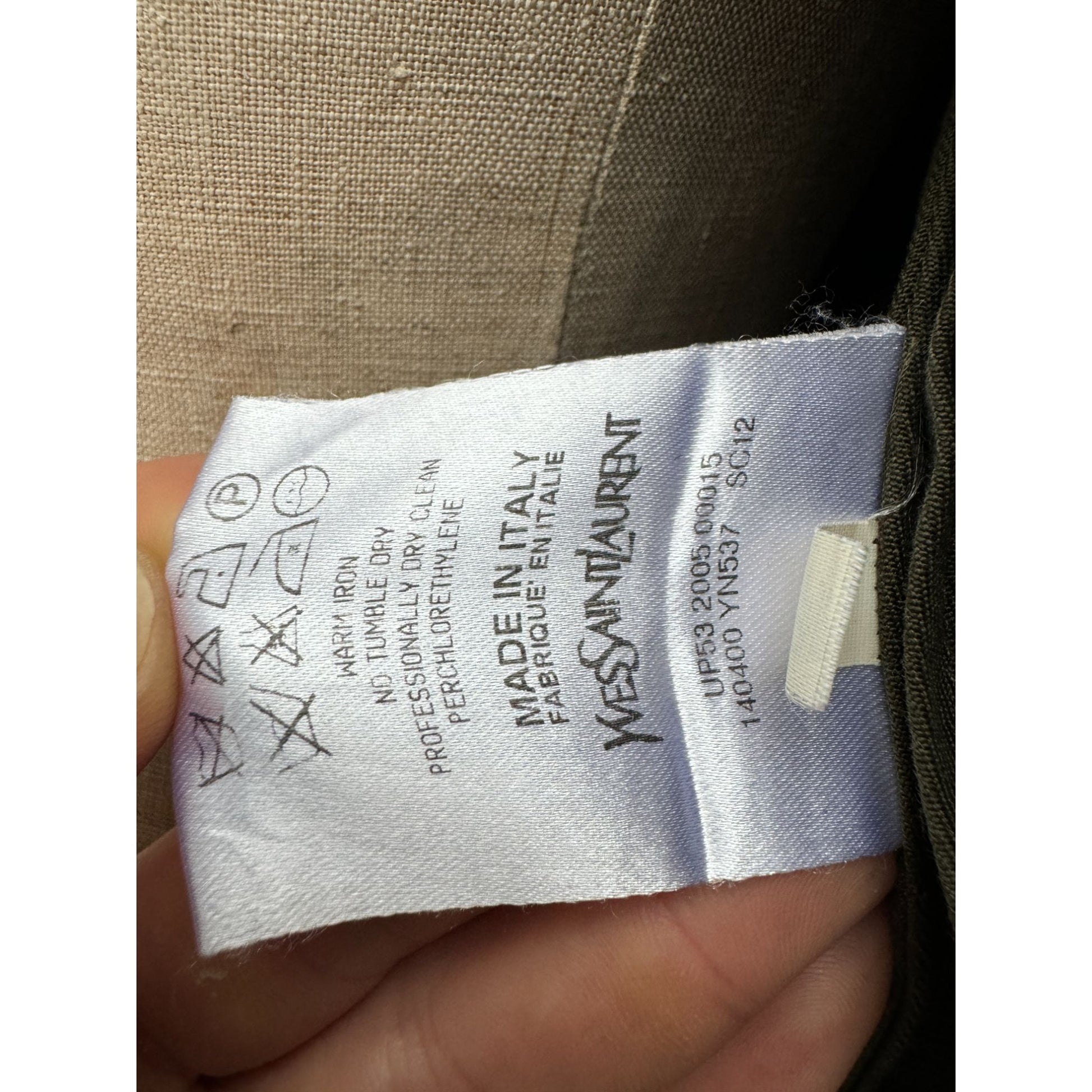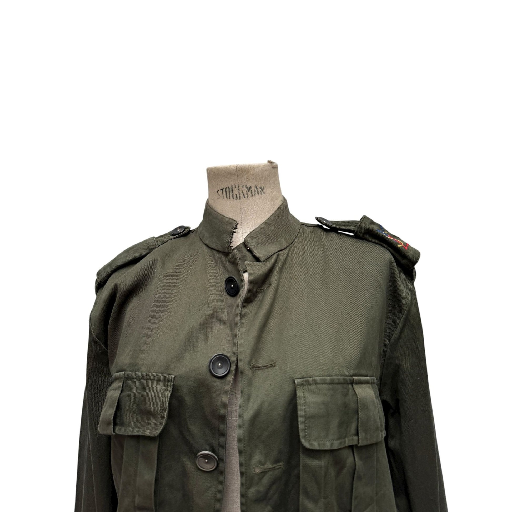 The piece comes in a deep khaki tone, a signature military hue that was central to Yves Saint Laurent’s exploration of safari and uniform-inspired collections since the 1960s. Distinguished by its practical details, it is finished with two front flap chest pockets, buttoned epaulettes on the shoulders, and a mandarin collar for a sharp, commanding look. A subtle yet luxurious detail, the iconic YSL logo is embroidered in vibrant primary colors on the shoulder epaulette, a discreet nod to the house’s heritage and branding.