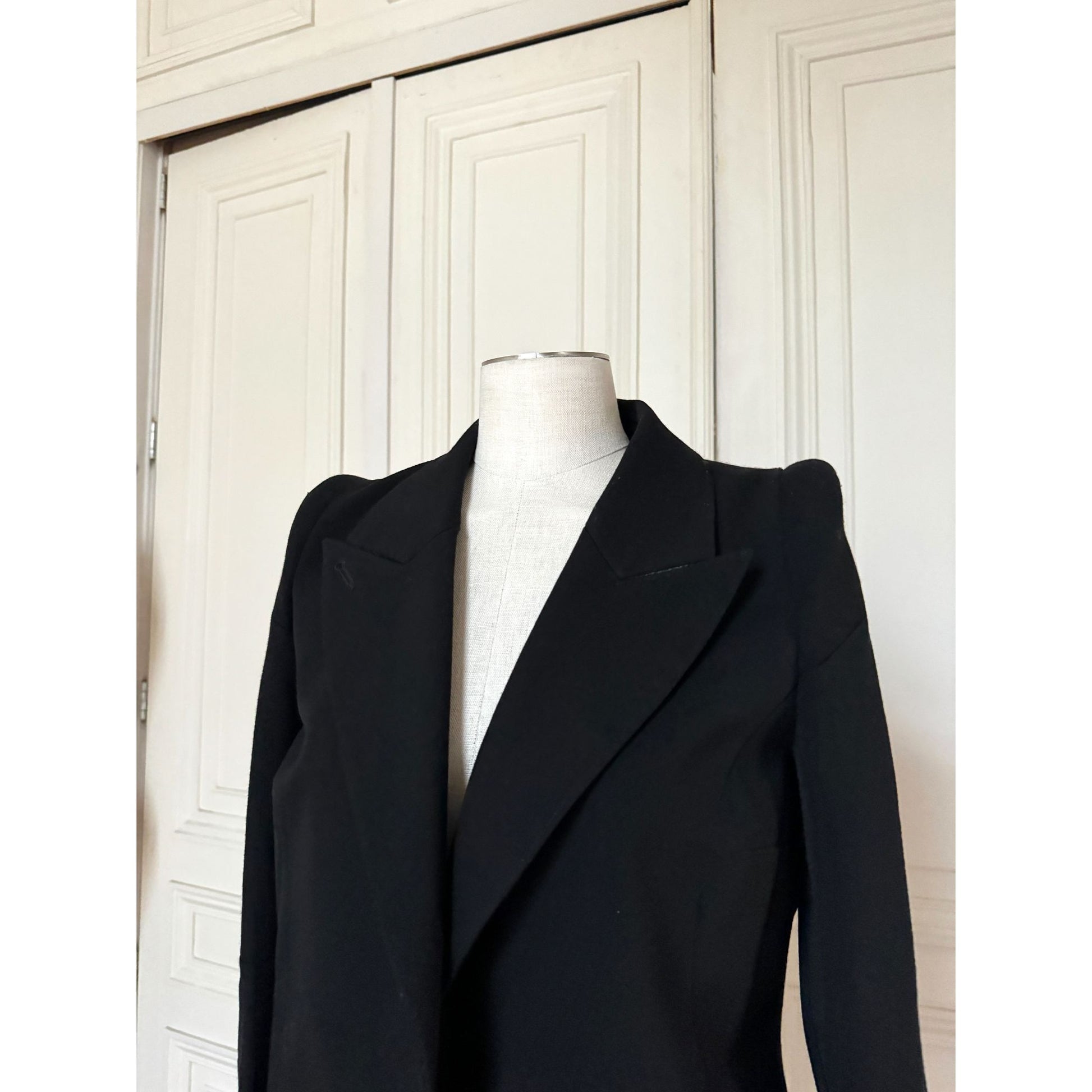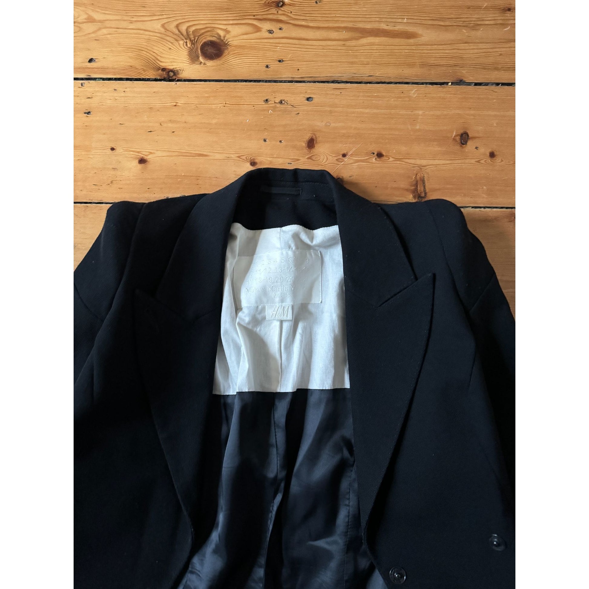 A sharp, structured double-breasted jacket with classic Margiela tailoring cues: strong shoulder line, clean lapels, and a flattering, slightly elongated cut that cinches the waist and skims the hips. The fabric has a refined, dense hand with a touch of stretch for comfort, making it a great day-to-night blazer—equally strong over denim or as part of a full tailored look.