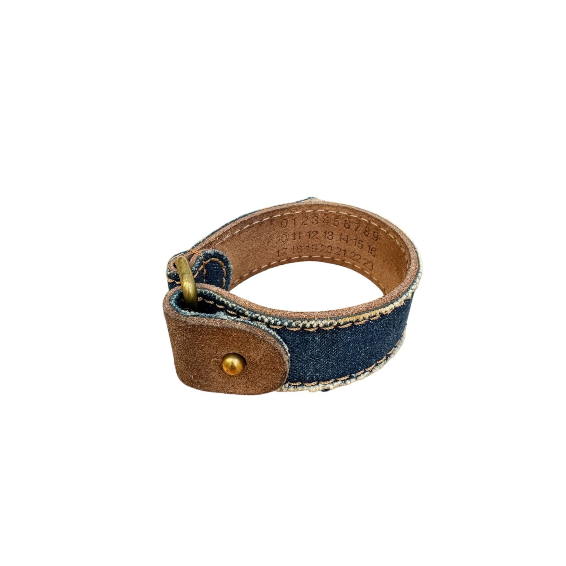 A rare Margiela accessory with utilitarian character and signature understatement. This blue denim bracelet features a leather interior stamped with the house’s numbered code and is finished with a brass-tone closure for a rugged, hardware-led touch. Minimal yet distinctive — ideal stacked with watches or worn alone.