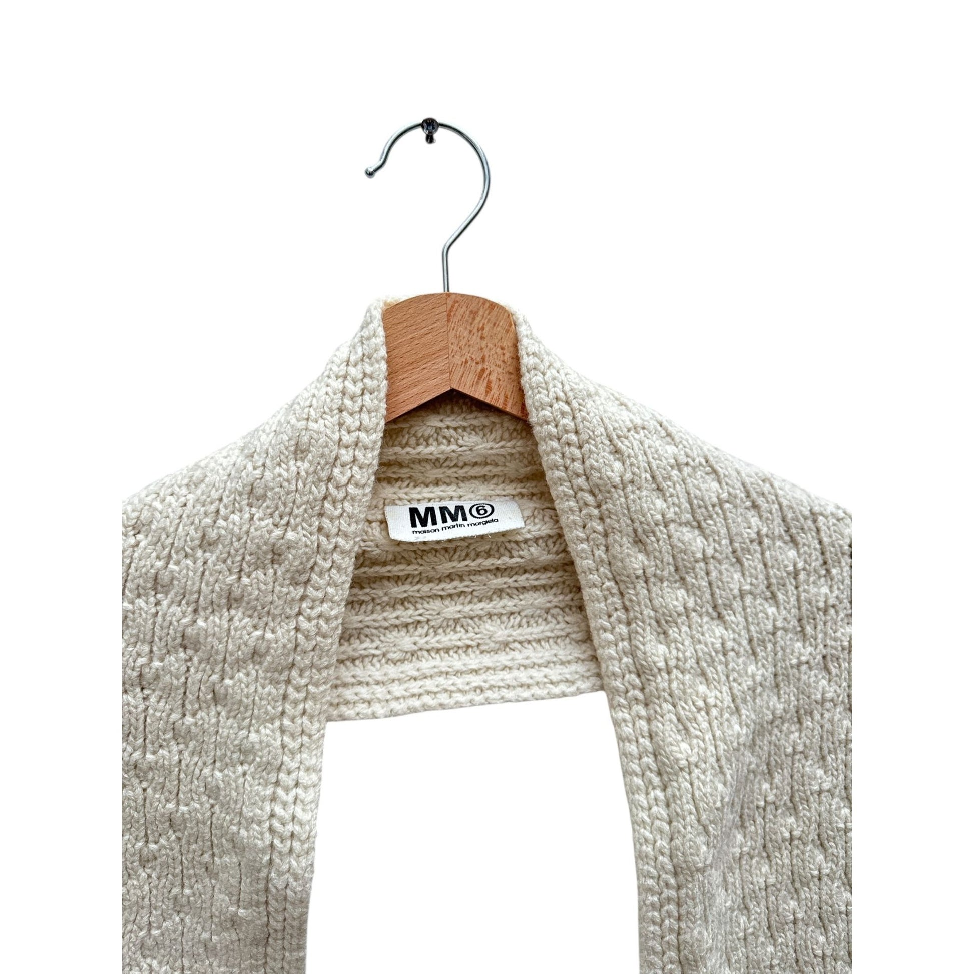 Beautiful minimalist scarf from Maison Martin Margiela, crafted in soft beige wool with a textured knit design. The elongated silhouette allows it to be wrapped, layered, or draped, adding understated warmth and refinement to any winter look.