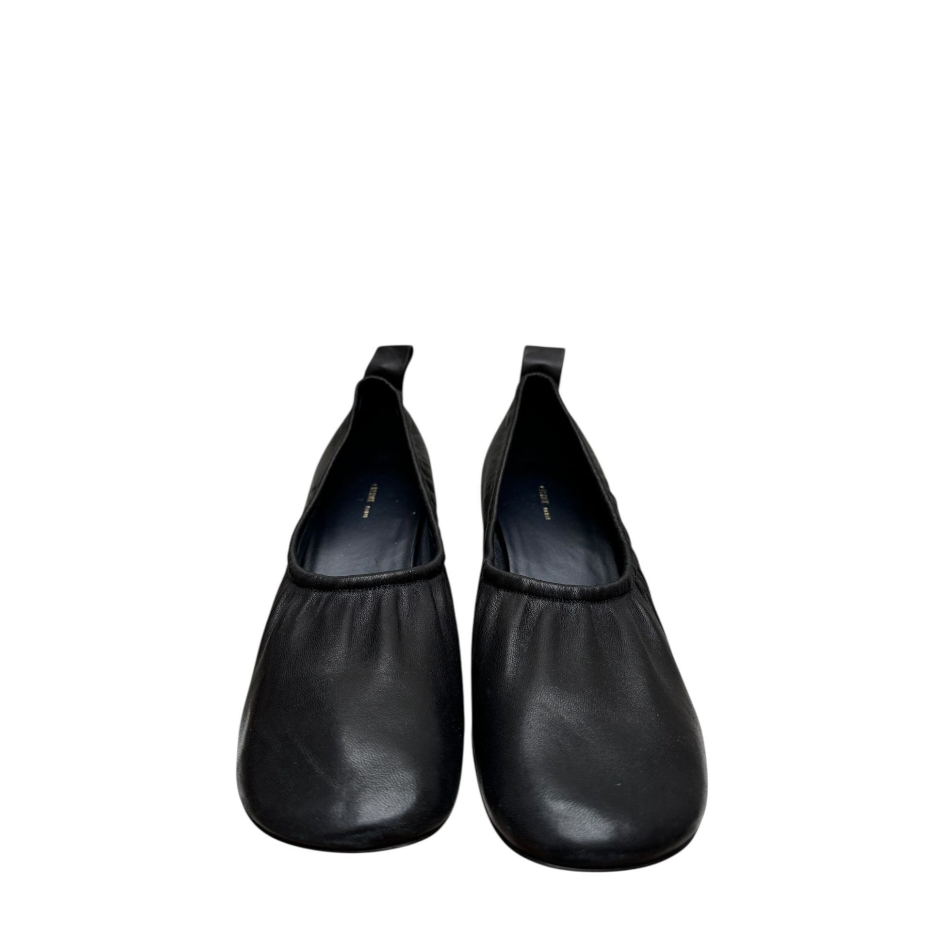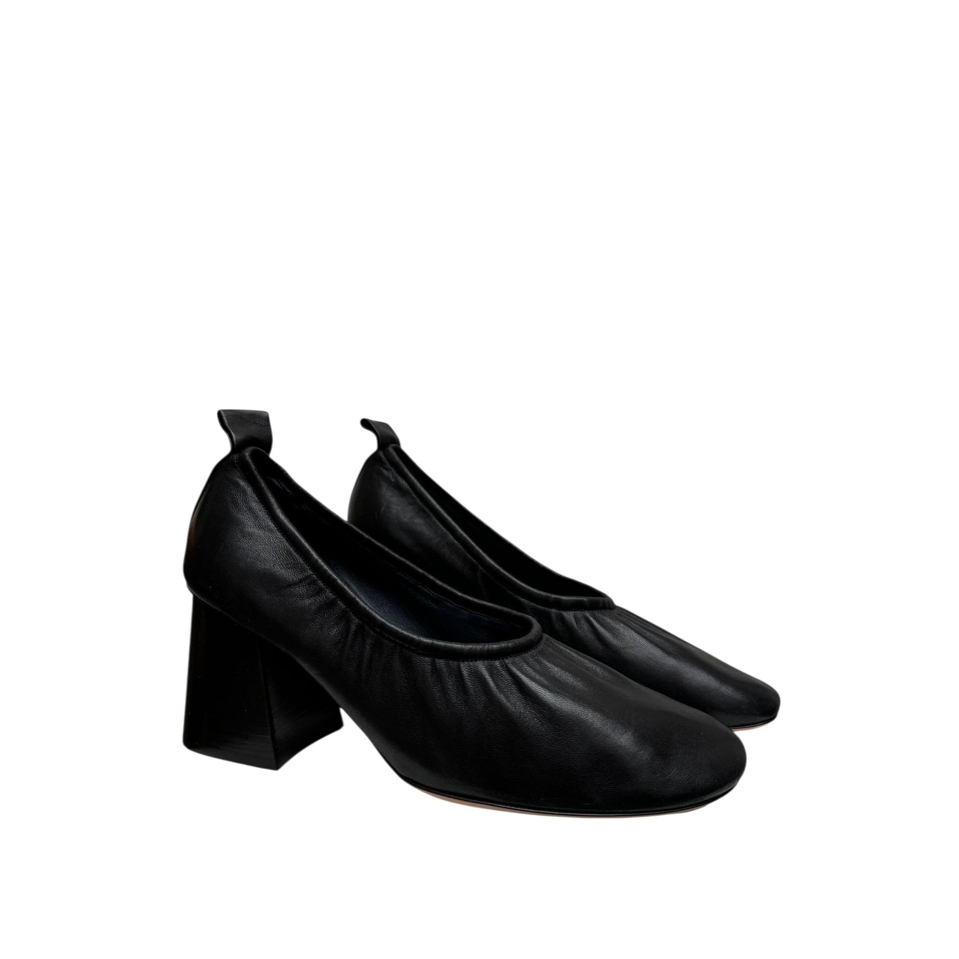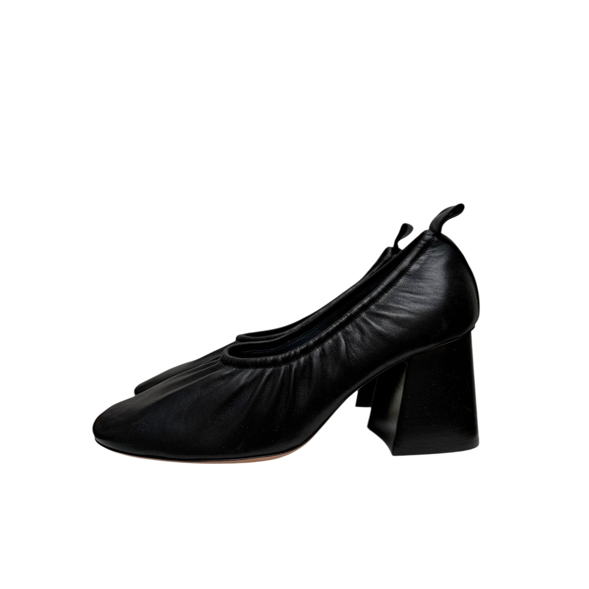 Iconic Celine ballerina heels designed under Phoebe Philo’s creative direction. Crafted in smooth black leather, these shoes feature a softly gathered vamp, almond toe, and elegant pull tab at the back. The sculptural wooden block heel adds both stability and a modern architectural touch, perfectly balancing comfort and sophistication.