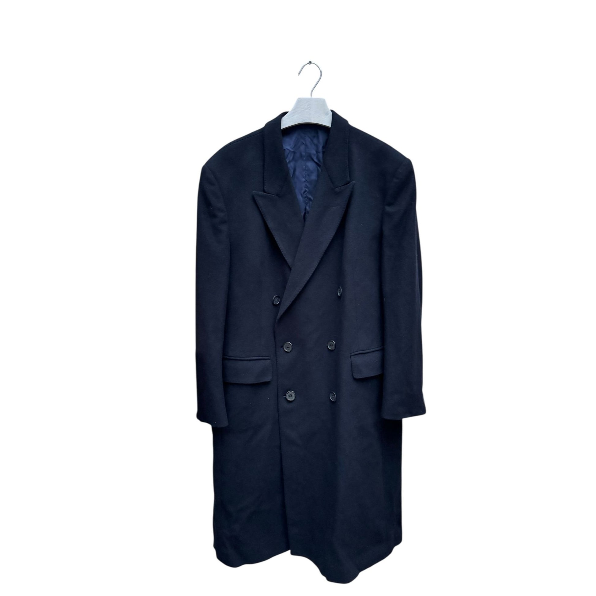 A timeless Yves Saint Laurent double-breasted overcoat in a deep black cashmere-blend—tailored with a strong, structured shoulder and a long, elegant line. The silhouette is classic menswear with a sharp lapel and clean front, making it an easy “forever” piece that works equally well over a suit or dressed down with denim and knits.