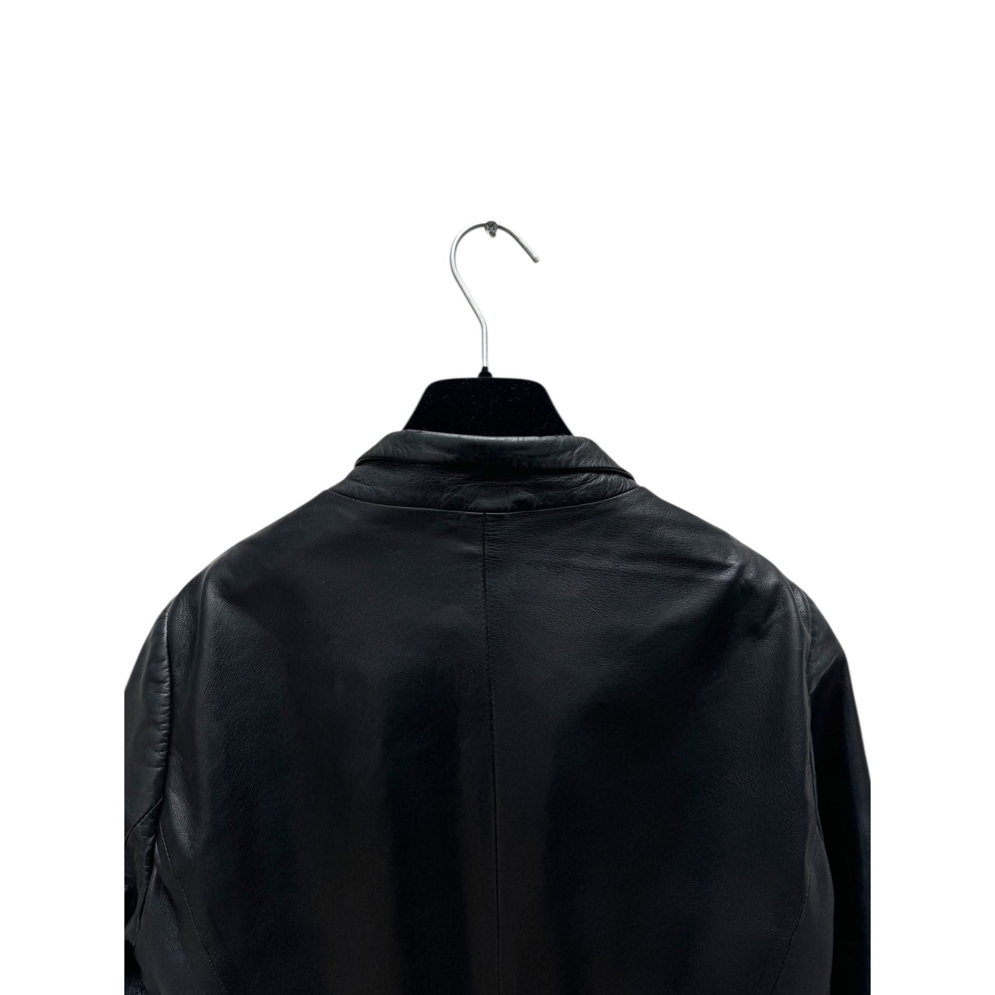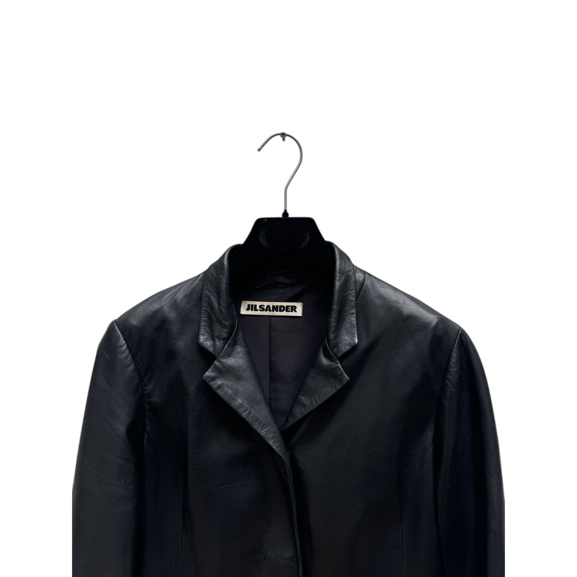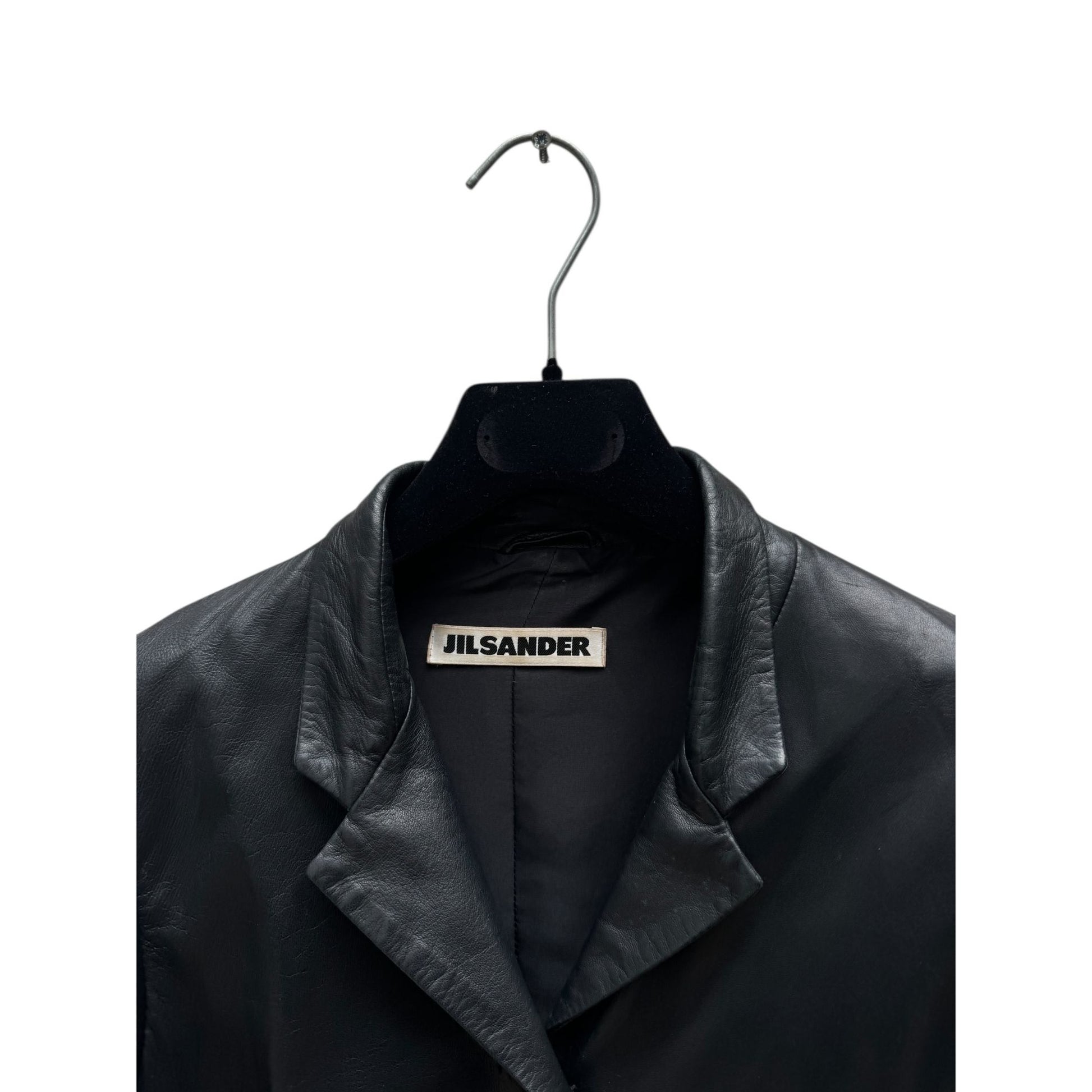 A refined expression of minimalist luxury, this Jil Sander black leather blazer captures the brand’s timeless approach to modern tailoring. Crafted in Italy from 100% supple leather with a 100% silk lining, it offers both structure and fluidity — hallmarks of Jil Sander’s understated yet architectural aesthetic.