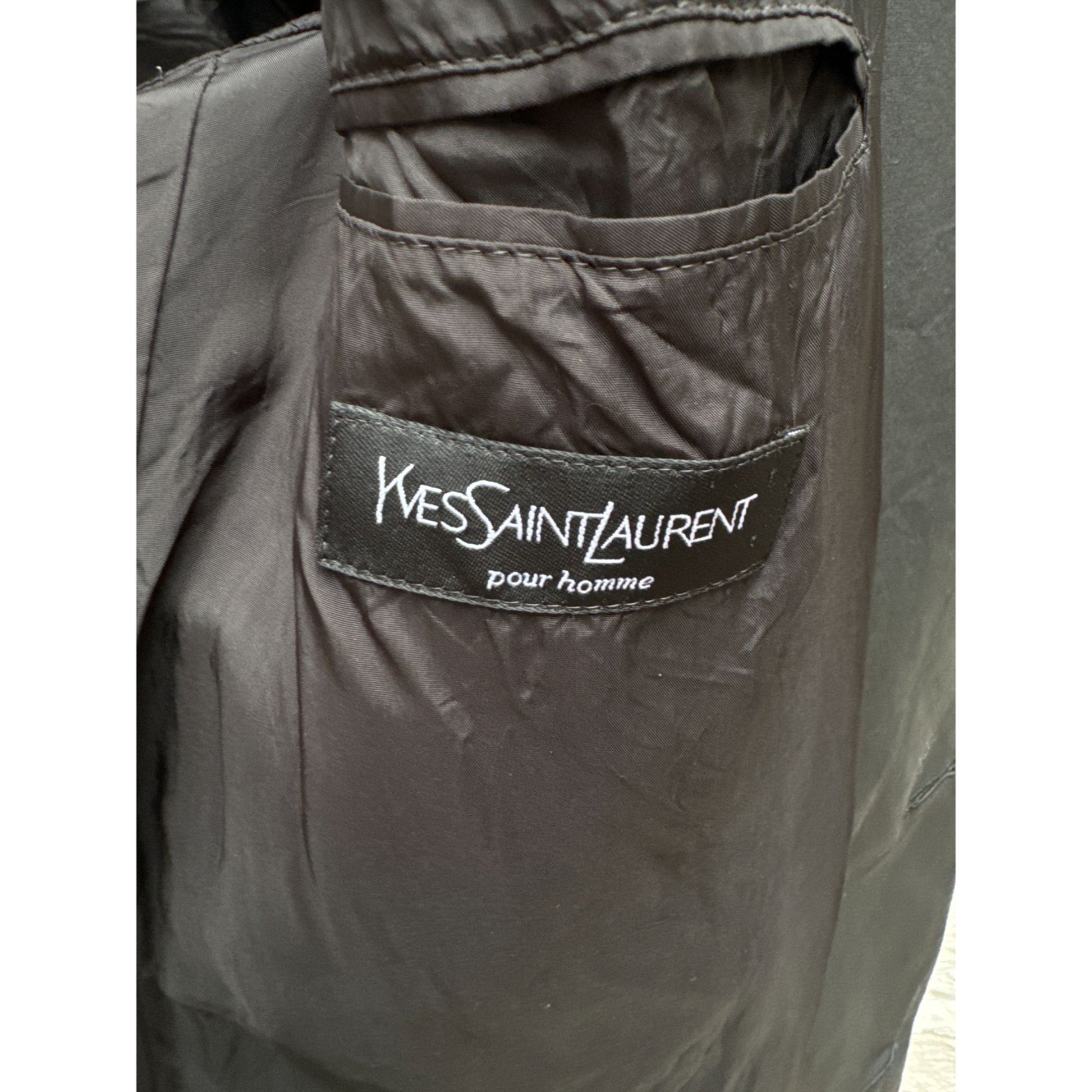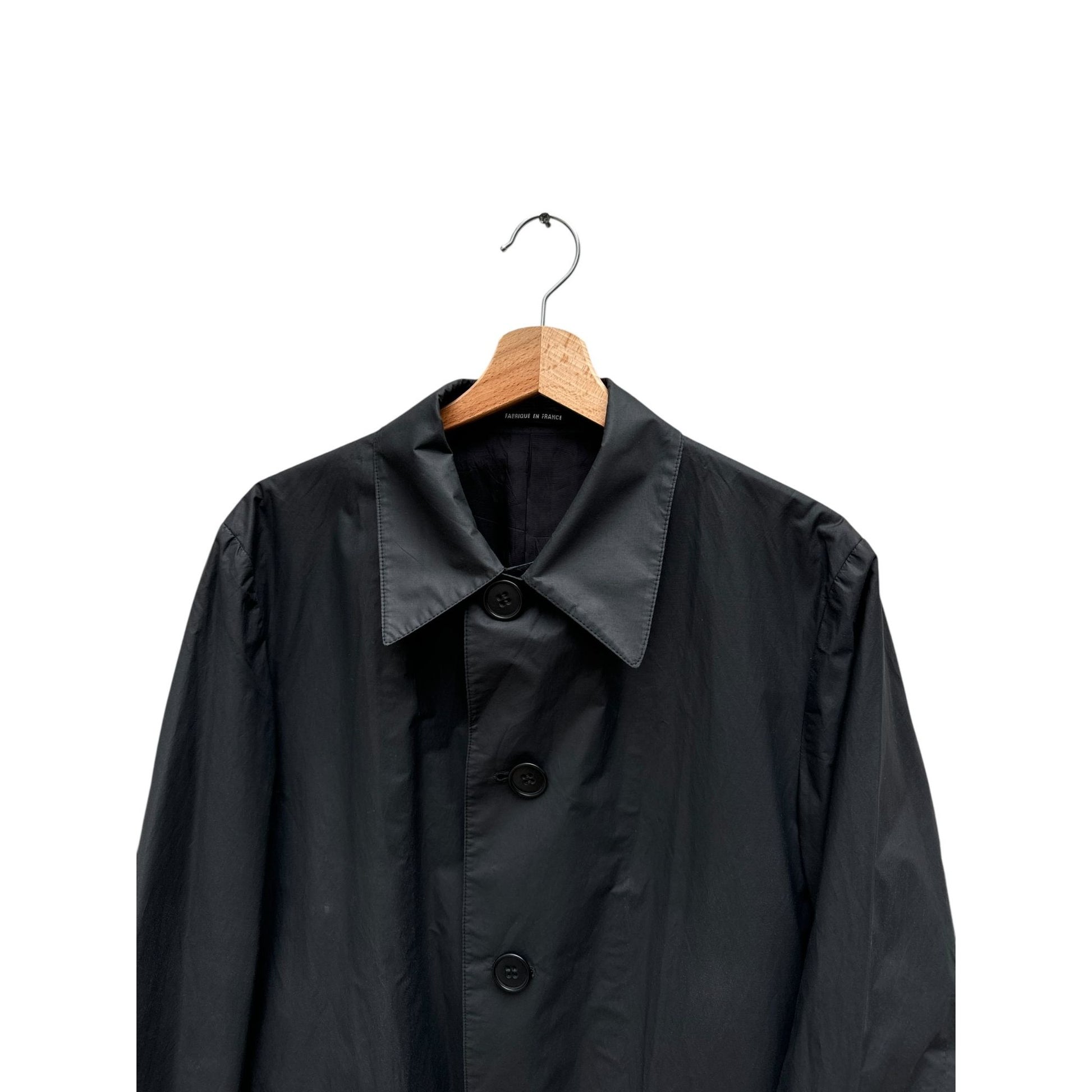 A refined Yves Saint Laurent pour homme mac coat, crafted in France and embodying the house’s minimalist, functional elegance. Rendered in a deep matte black, this coat features a lightweight yet structured technical fabric blend, offering subtle weather resistance while maintaining a clean, tailored appearance.