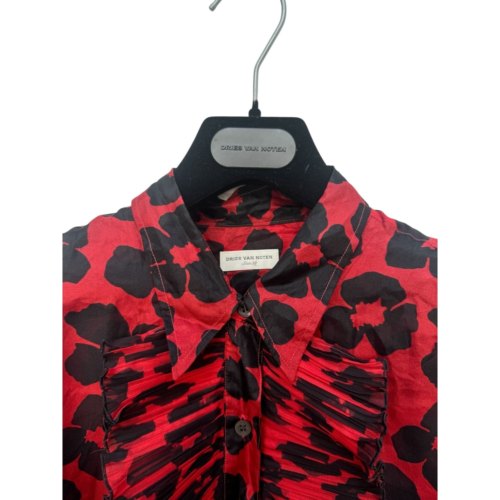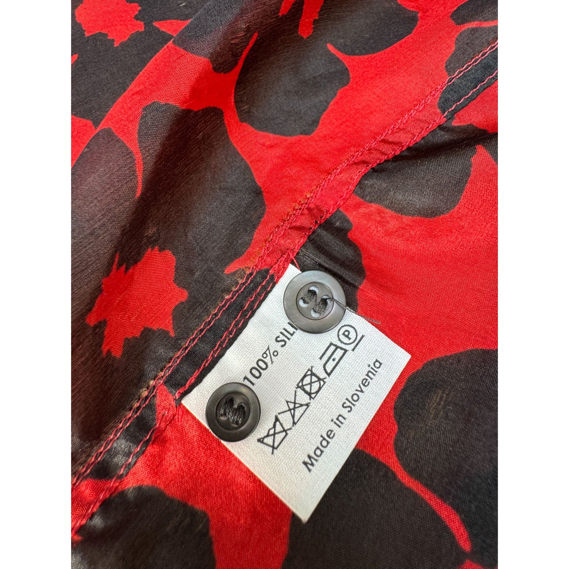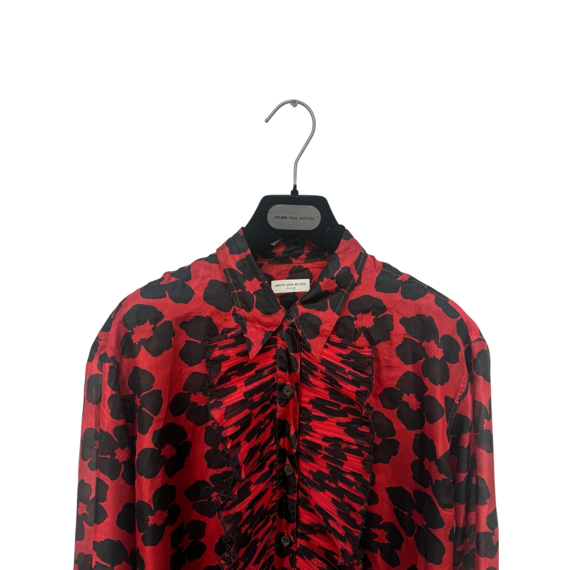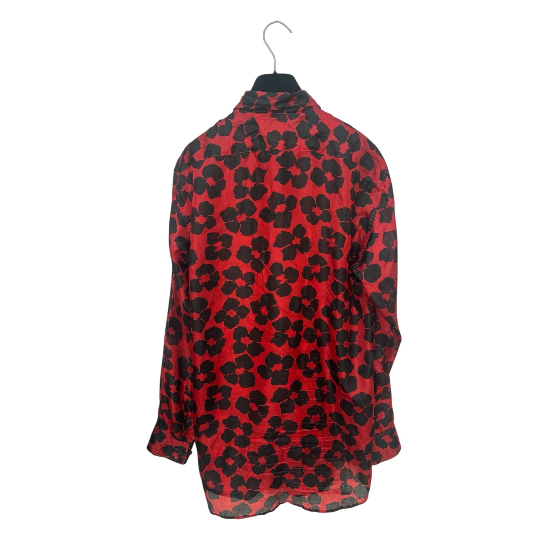 This striking silk shirt from Dries Van Noten is a bold and elegant piece that perfectly embodies the designer’s signature mix of artistry and wearability. Crafted in 100% lightweight silk, it features an eye-catching floral motif in deep black set against a vibrant red background.