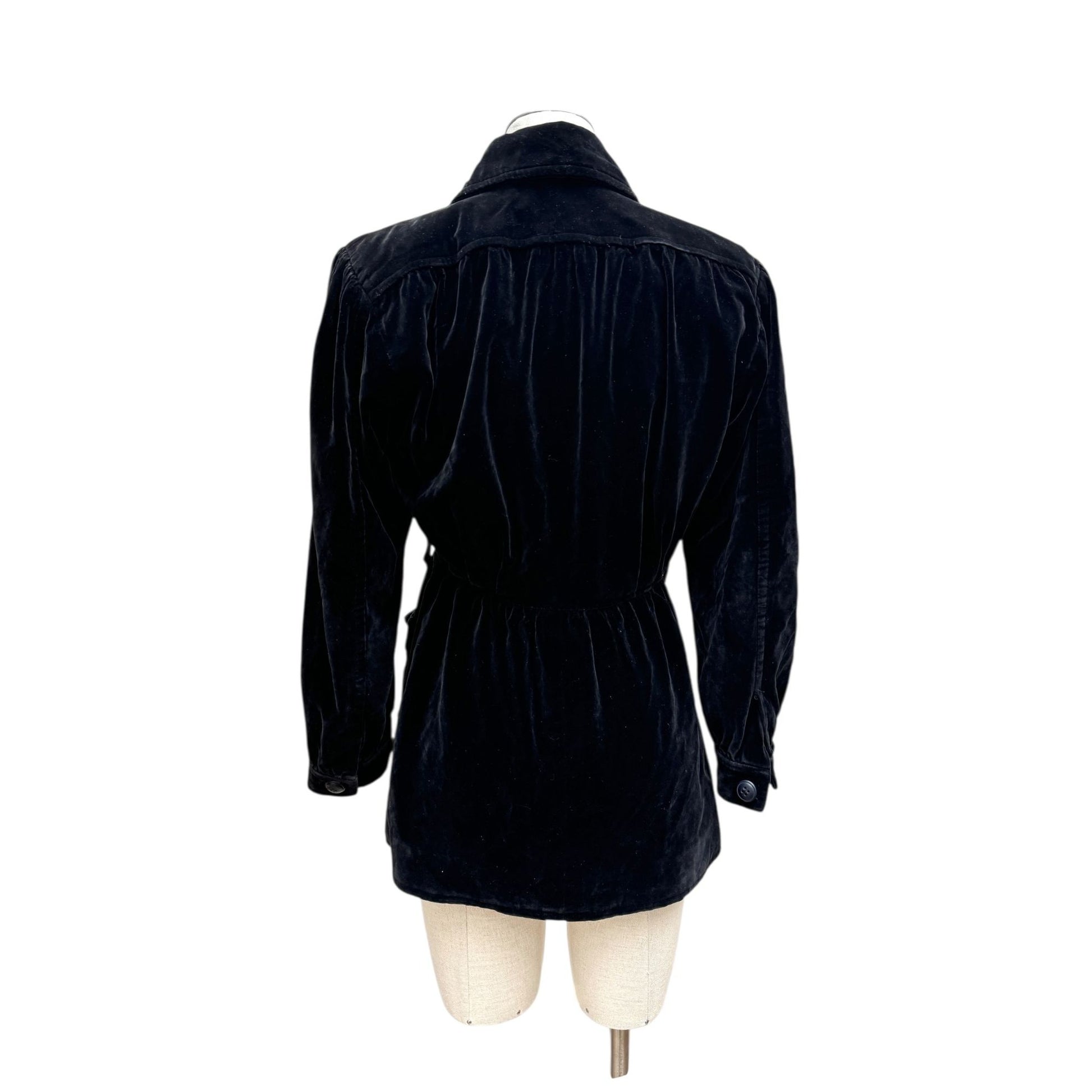 Timeless black velvet jacket from Saint Laurent Paris, showcasing the house’s signature balance between sharp tailoring and understated sensuality.