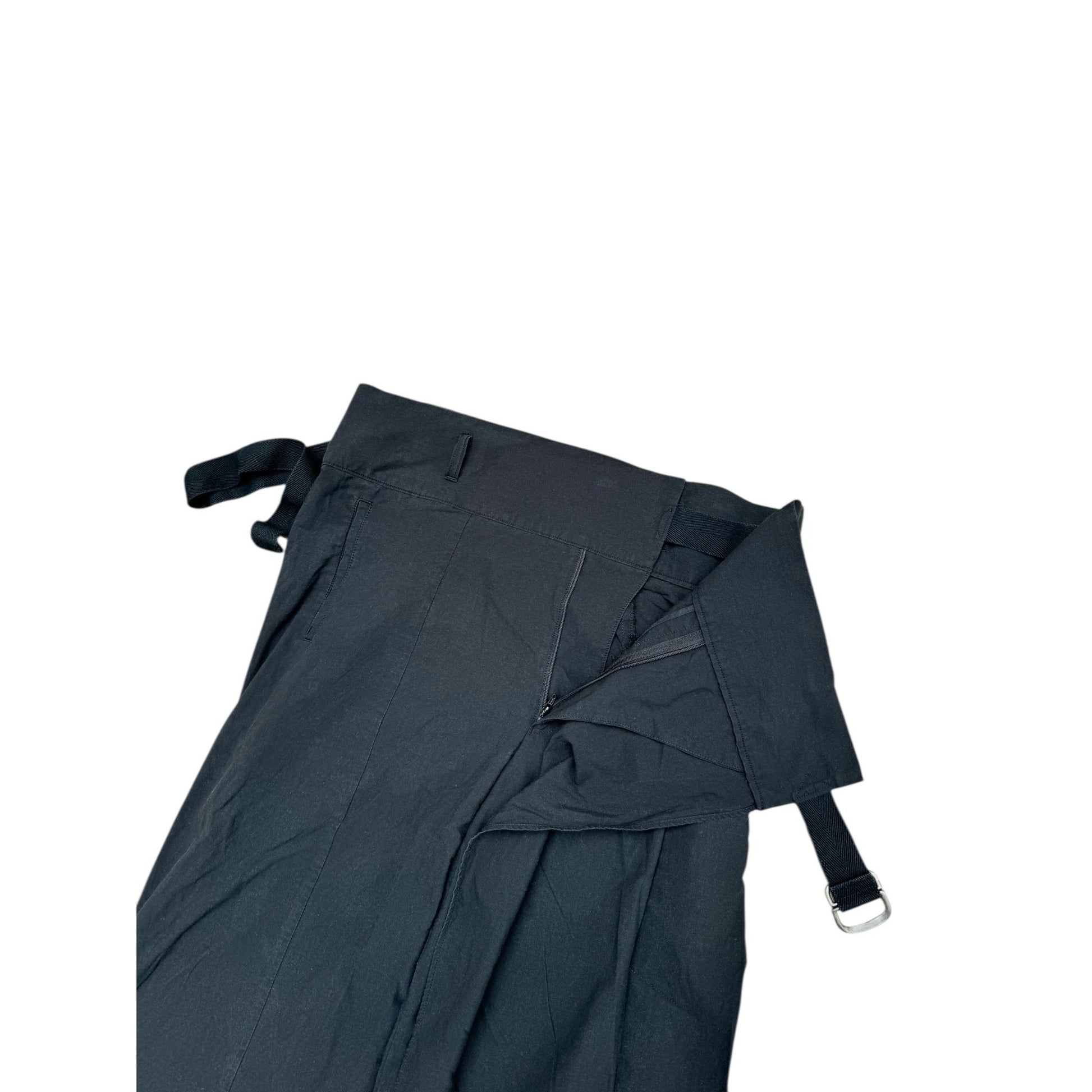 The wide, architectural cut creates a fluid drape that moves gracefully with the body, while the built-in adjustable belt allows for a customizable fit at the waist. The overlapping front panel design adds a distinctive element of movement and asymmetry.