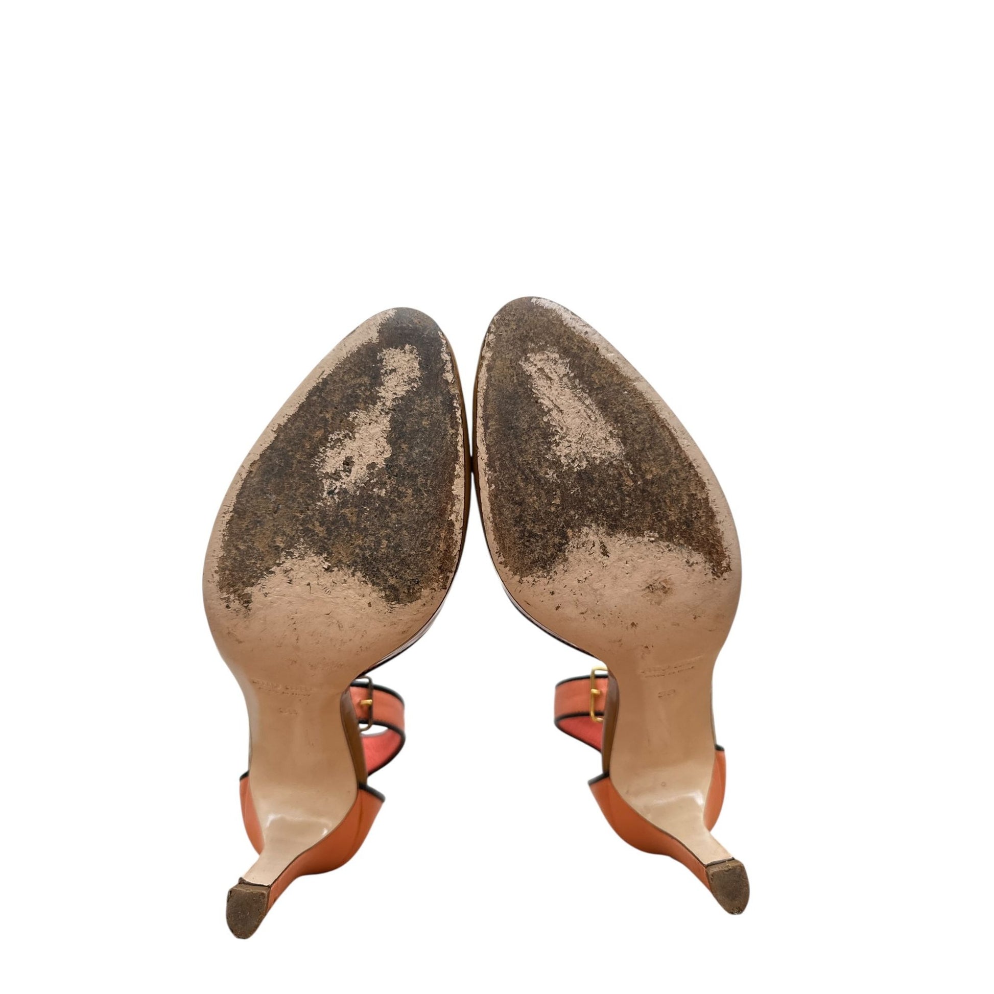 Chic and feminine pair of Miu Miu heels featuring a striking color-block design. Crafted in glossy brown patent leather with contrasting coral pink leather ankle straps and slim gold-tone high heels, finished with light pink leather piping for a refined touch. The bold mix of textures and tones makes these a standout statement piece for both day and evening looks.