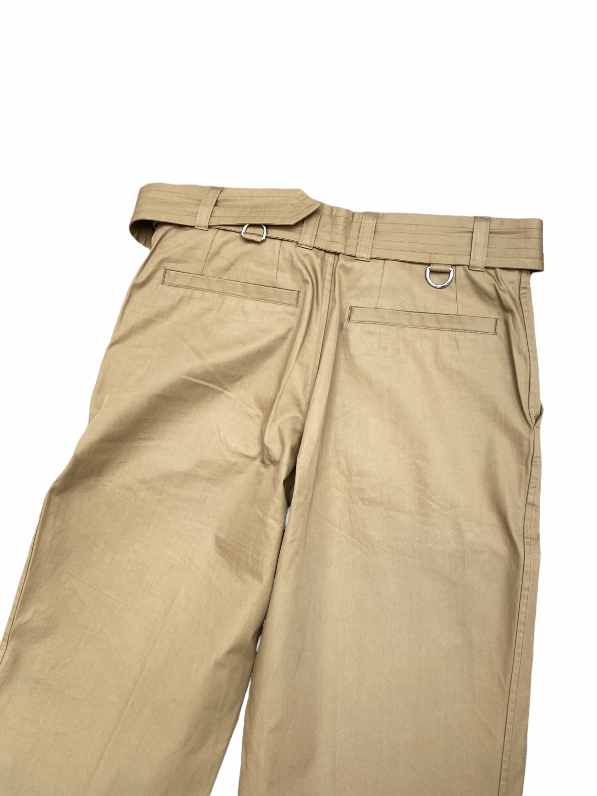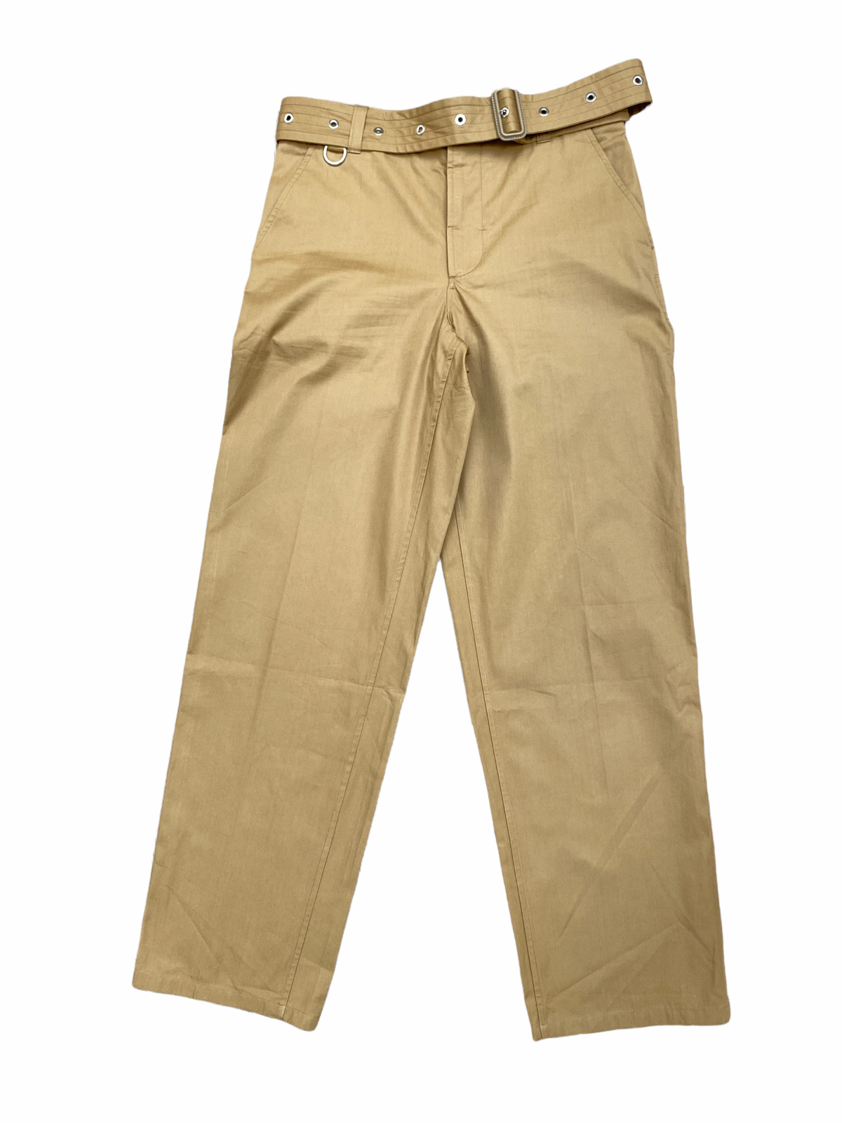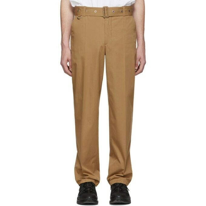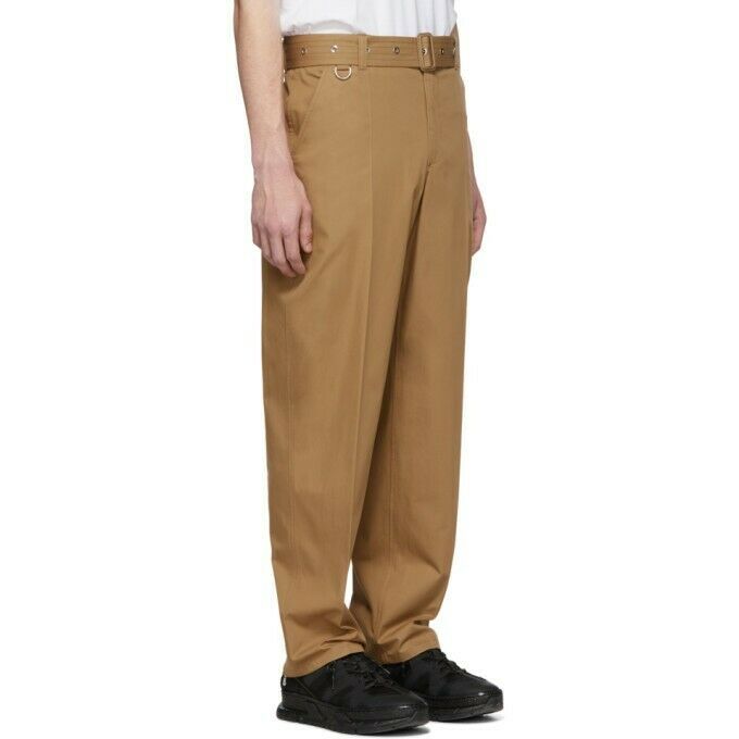 Slim-fit cotton twill trousers in toffee brown. Mid-rise. Four-pocket styling. Detachable and adjustable pin-buckle belt with D-ring hardware and belt loops at waist. Zip-fly. Silver-tone hardware.
