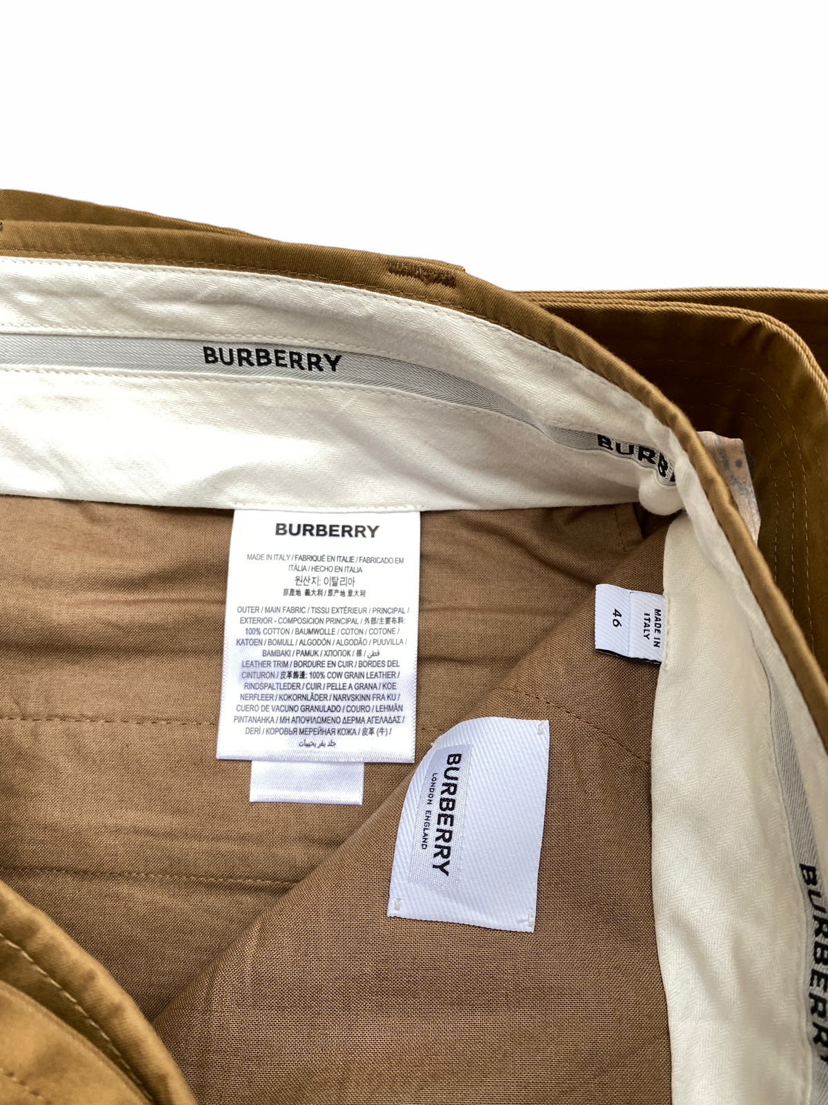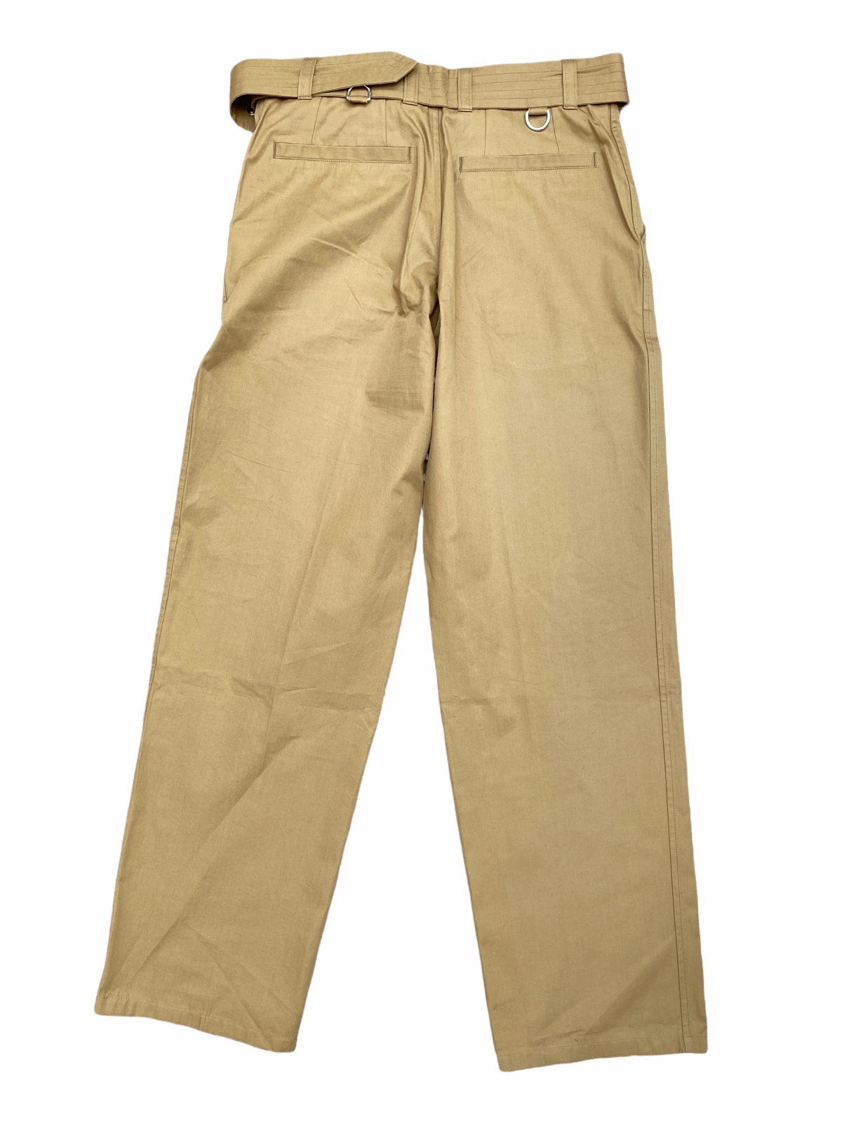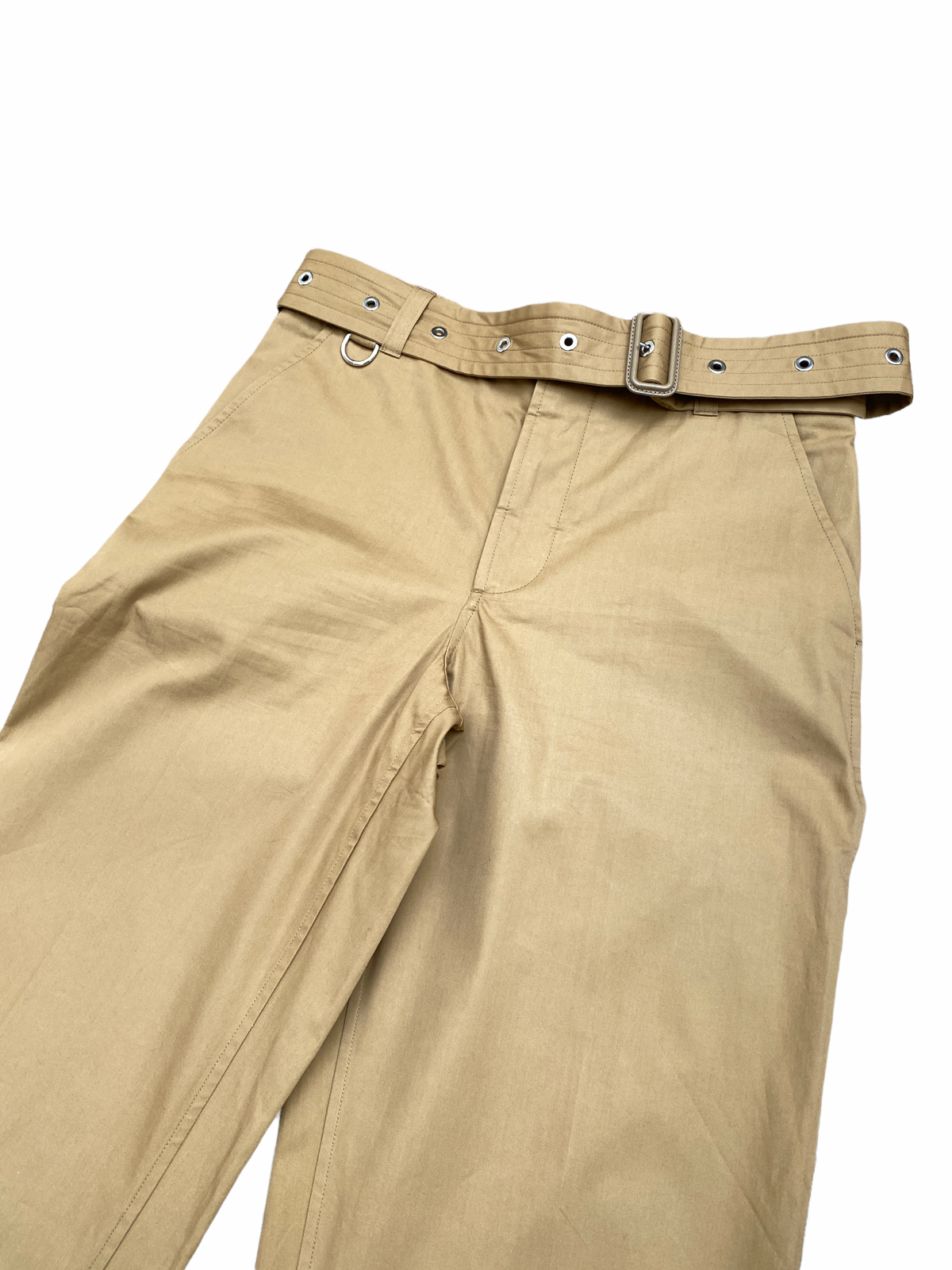 Slim-fit cotton twill trousers in toffee brown. Mid-rise. Four-pocket styling. Detachable and adjustable pin-buckle belt with D-ring hardware and belt loops at waist. Zip-fly. Silver-tone hardware.