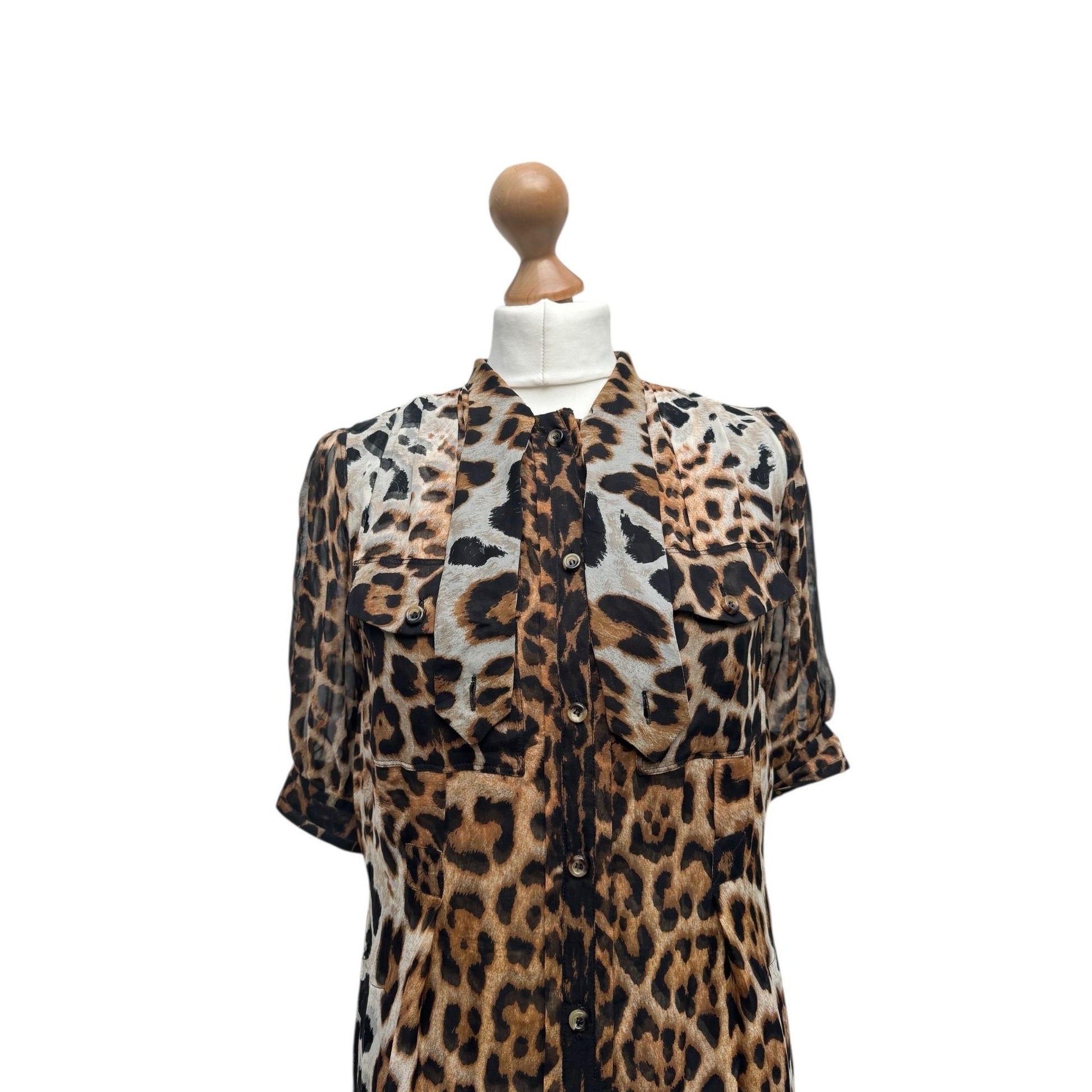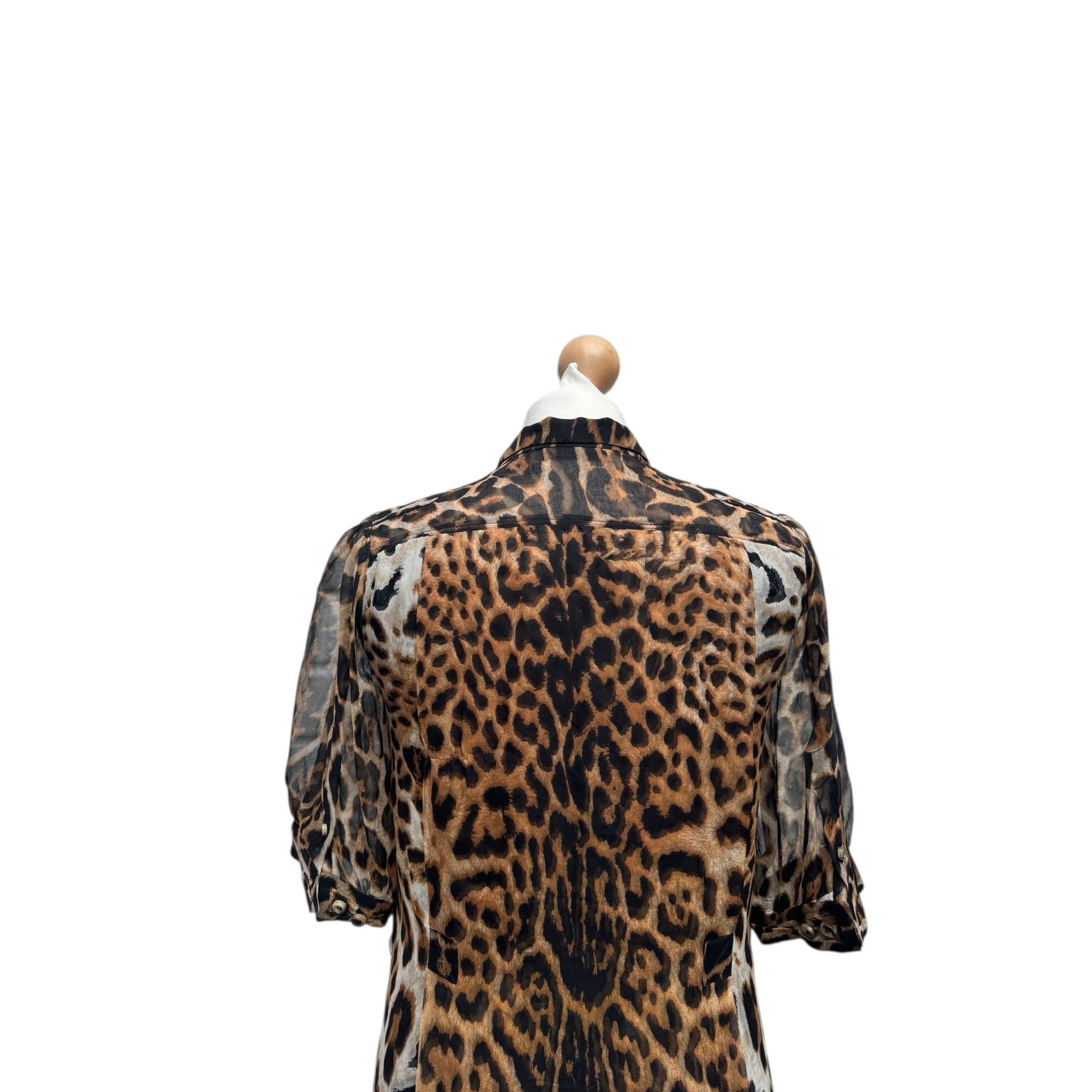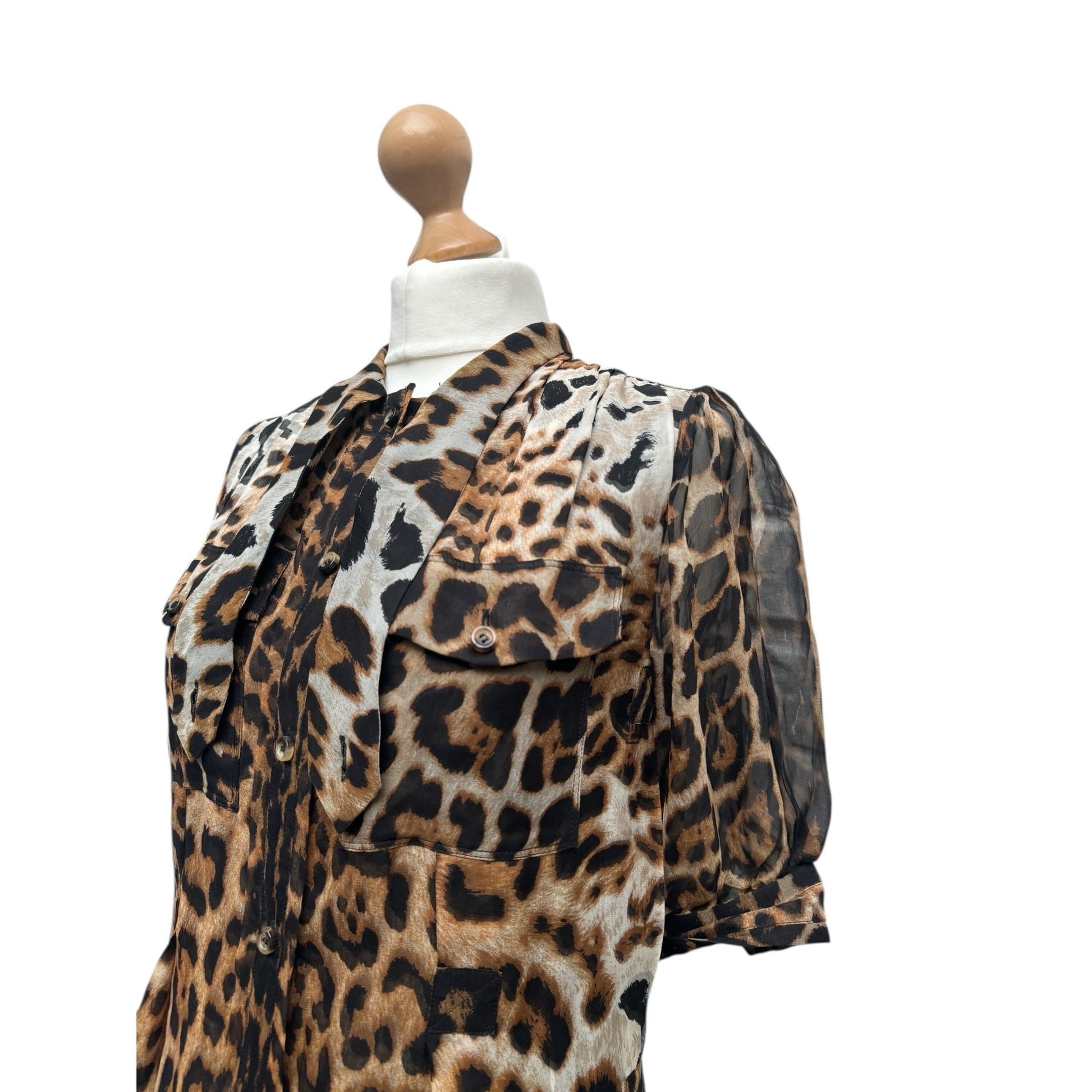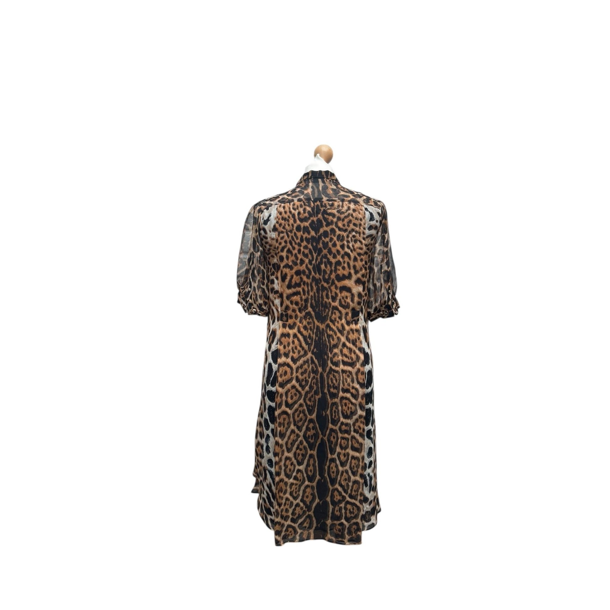 This dress features an exquisite leopard print rendered on the finest sheer silk, creating a luxurious interplay of transparency and depth.