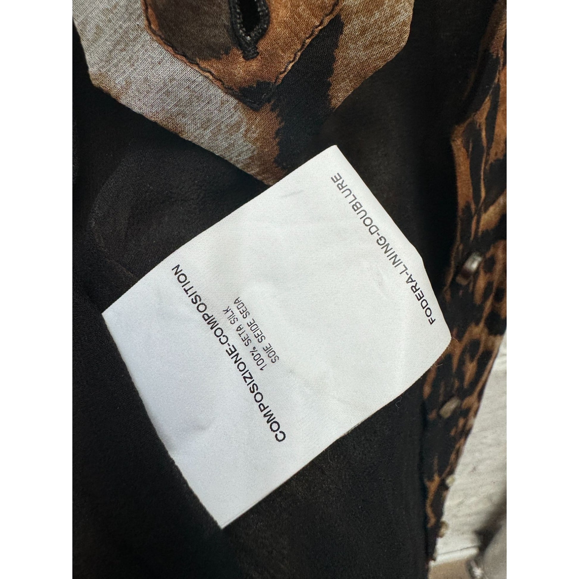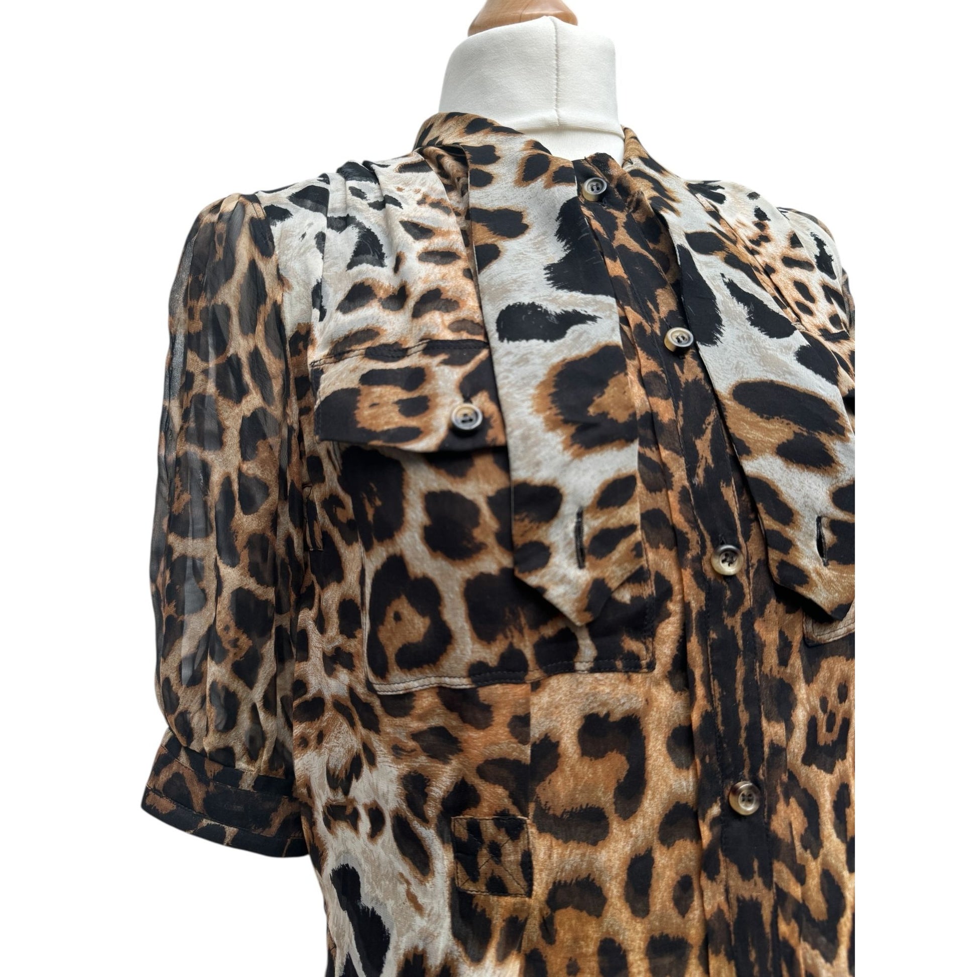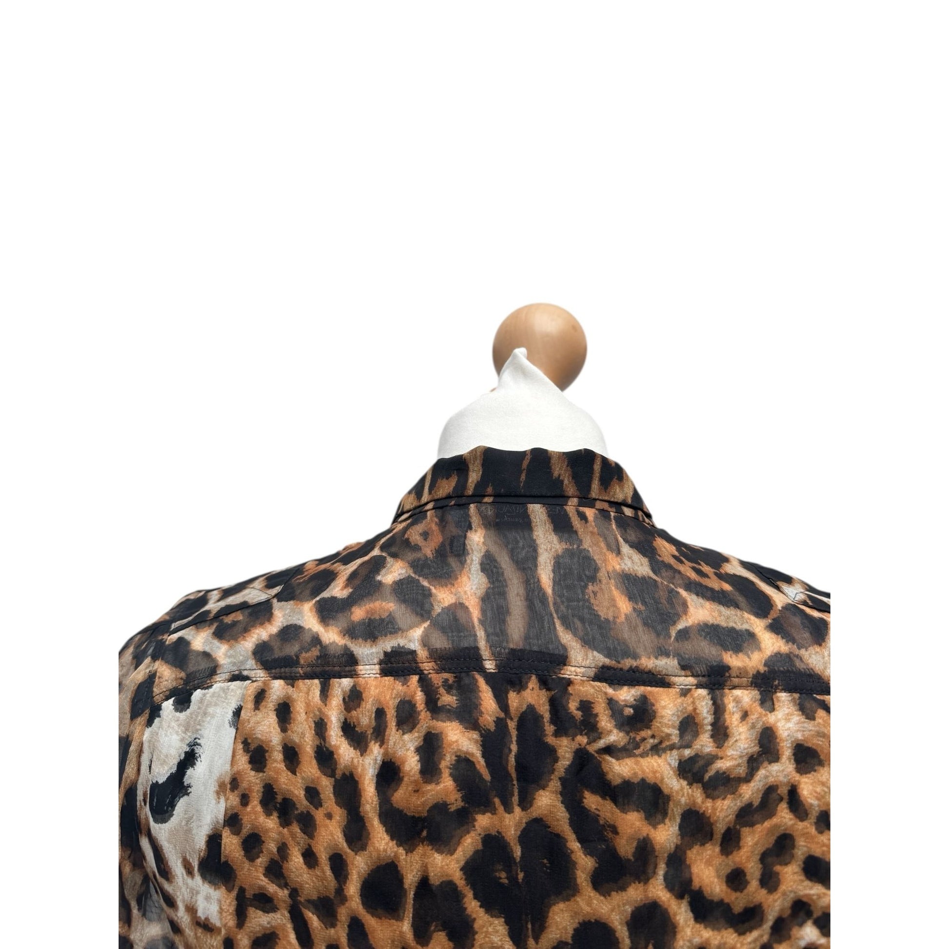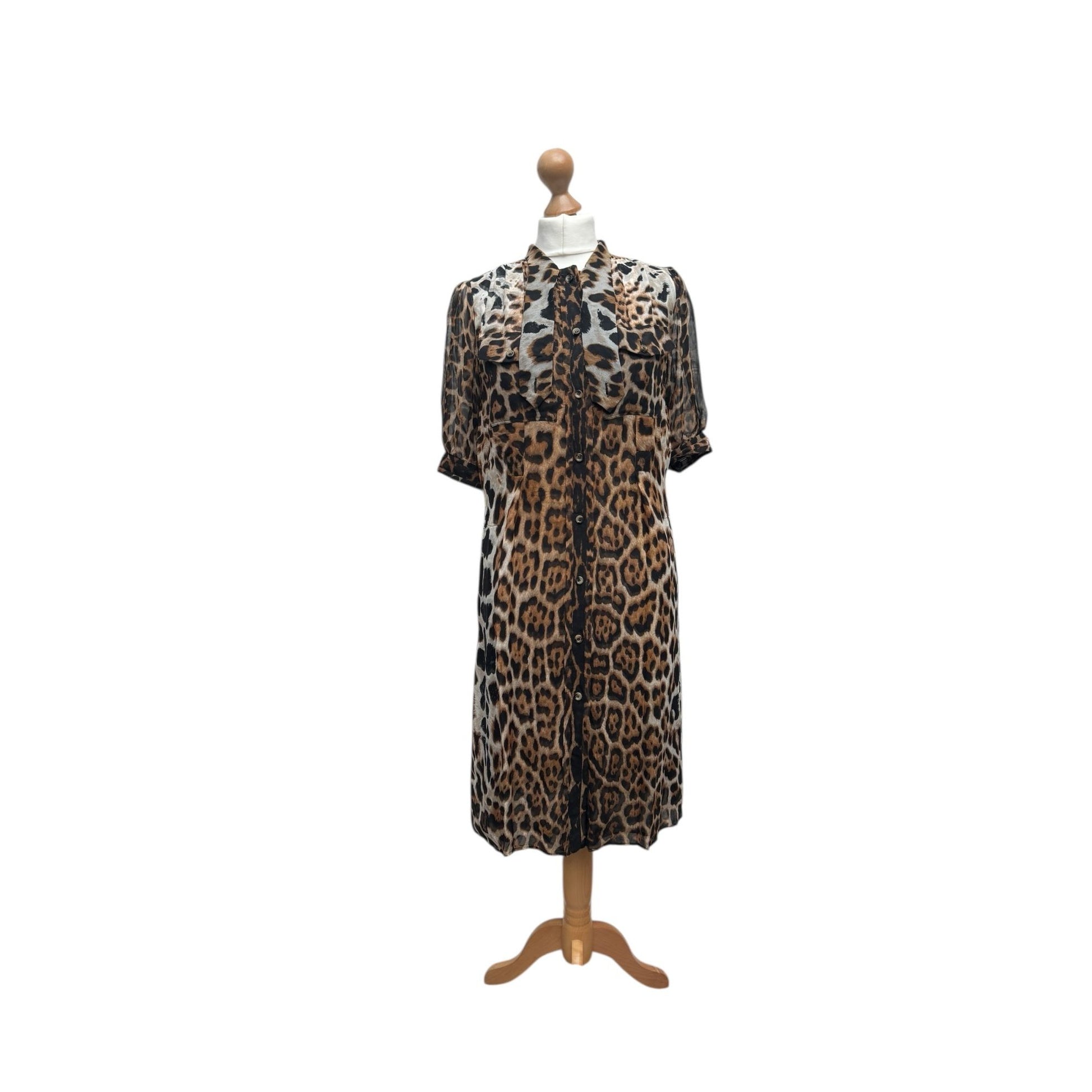 This dress features an exquisite leopard print rendered on the finest sheer silk, creating a luxurious interplay of transparency and depth.