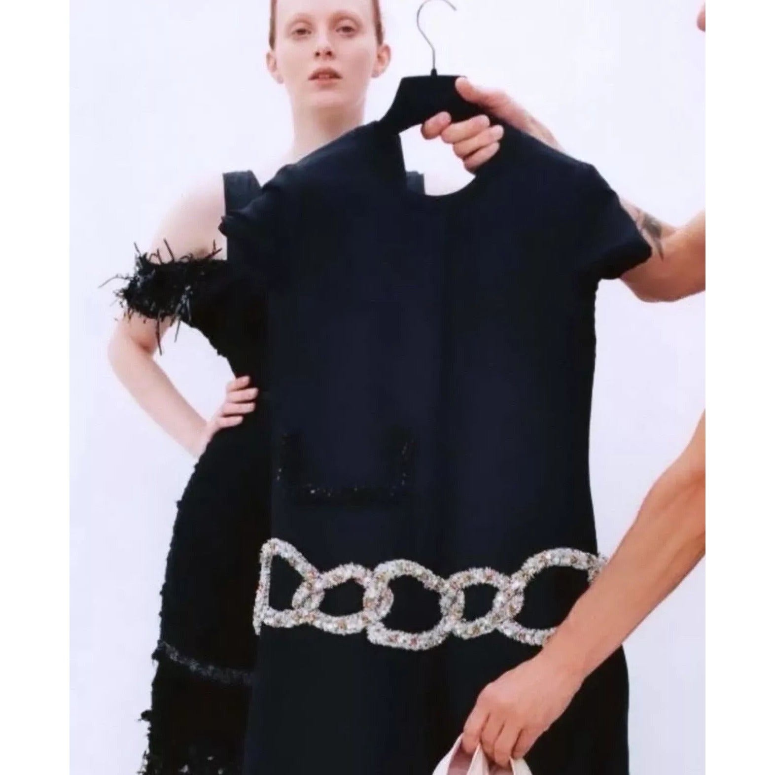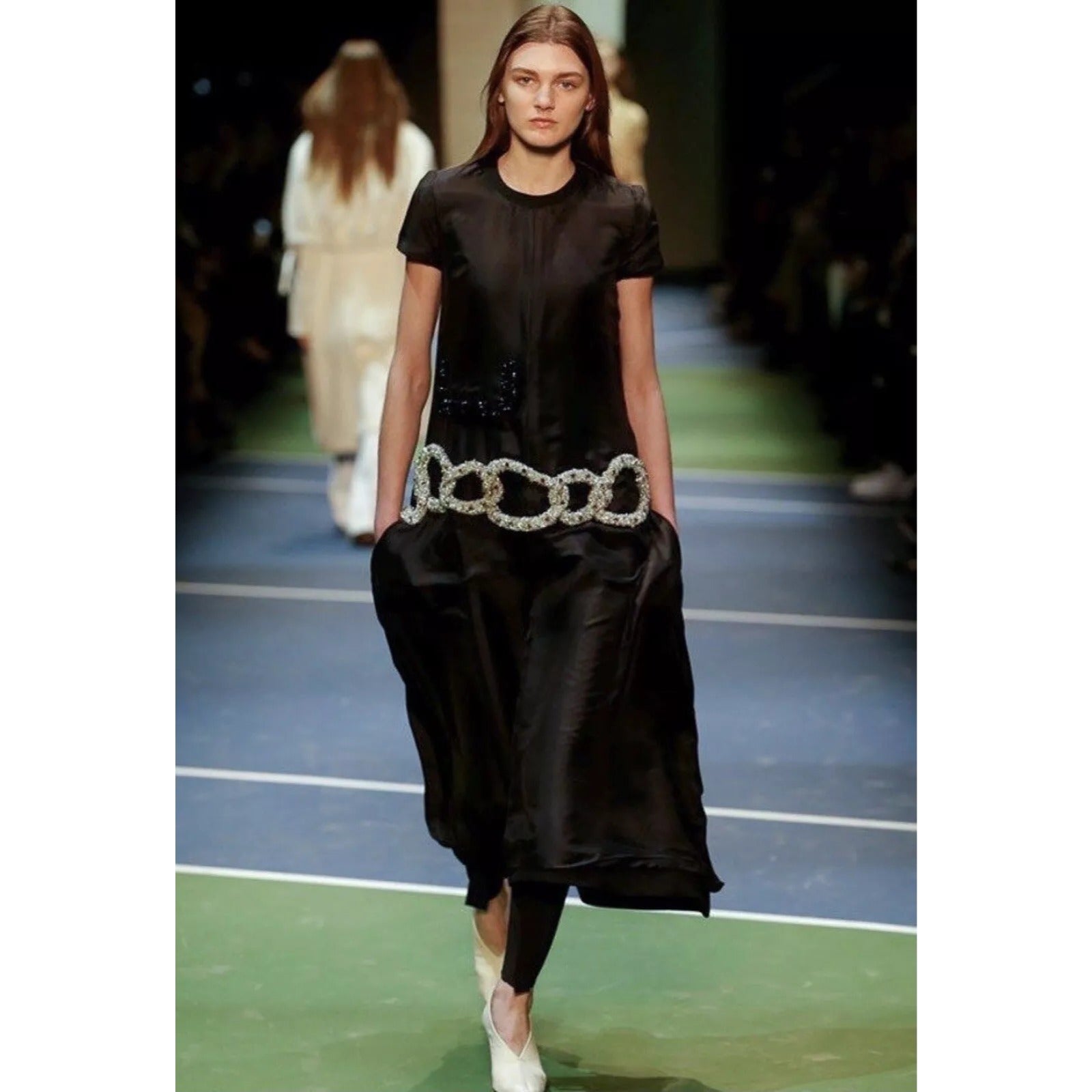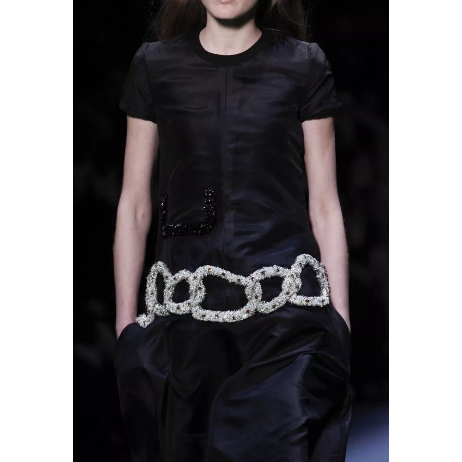The true highlight of the piece is the remarkable crystal-embellished “belt,” an oversized, hand-embroidered chain motif that wraps the waist in shimmering, three-dimensional links. Each link is meticulously adorned with an array of glass crystals and beads, creating an eye-catching sculptural effect that elevates the entire look. The front also features a signature black beaded pocket detail—a subtle but distinctive Celine touch.