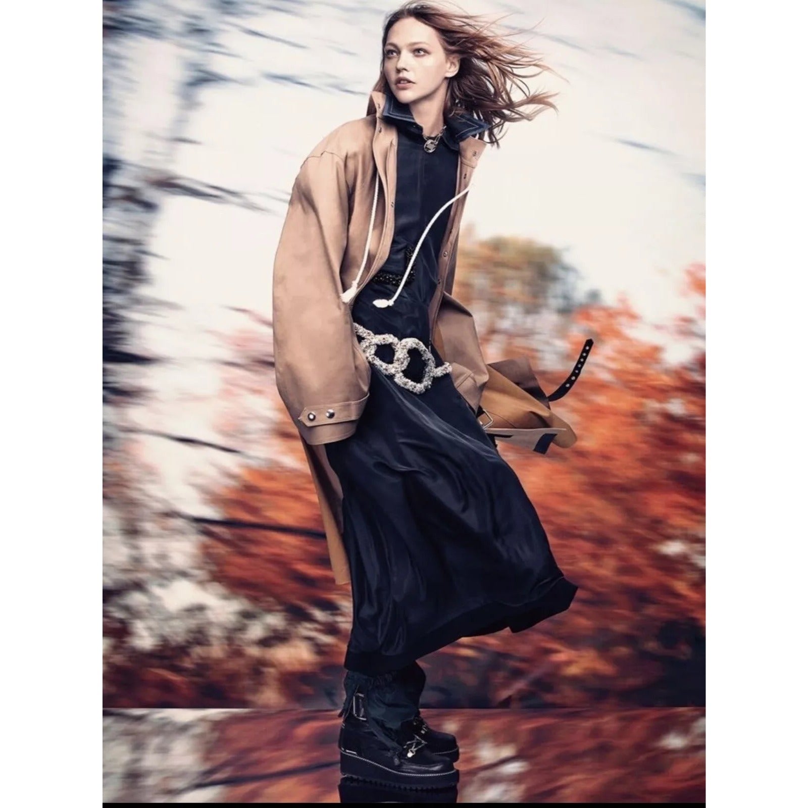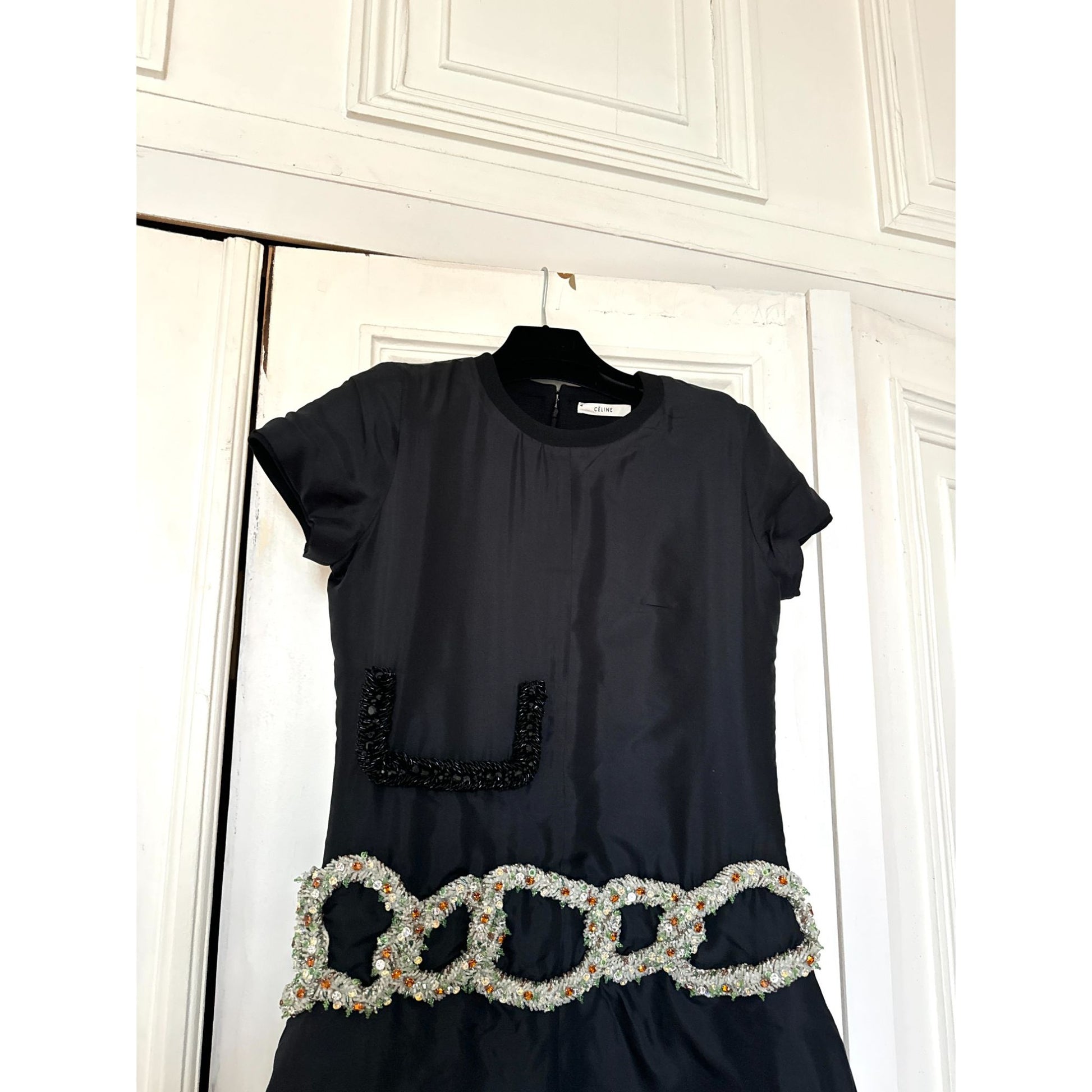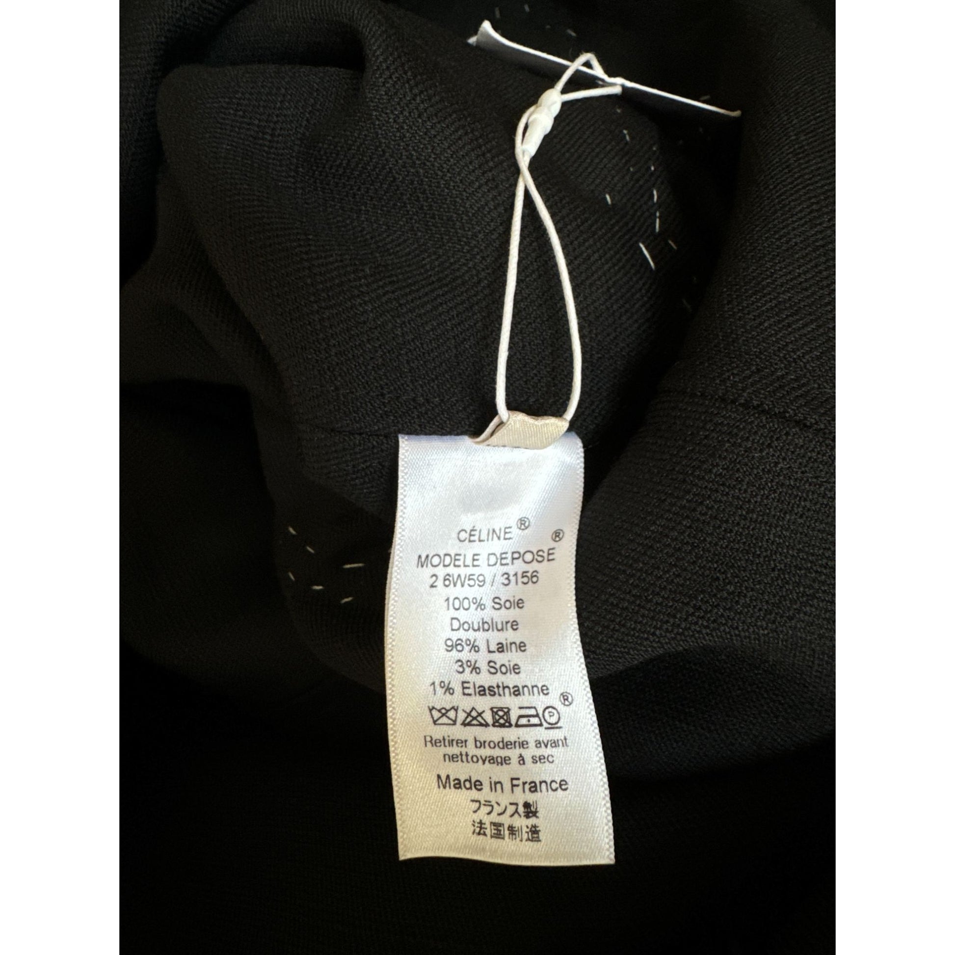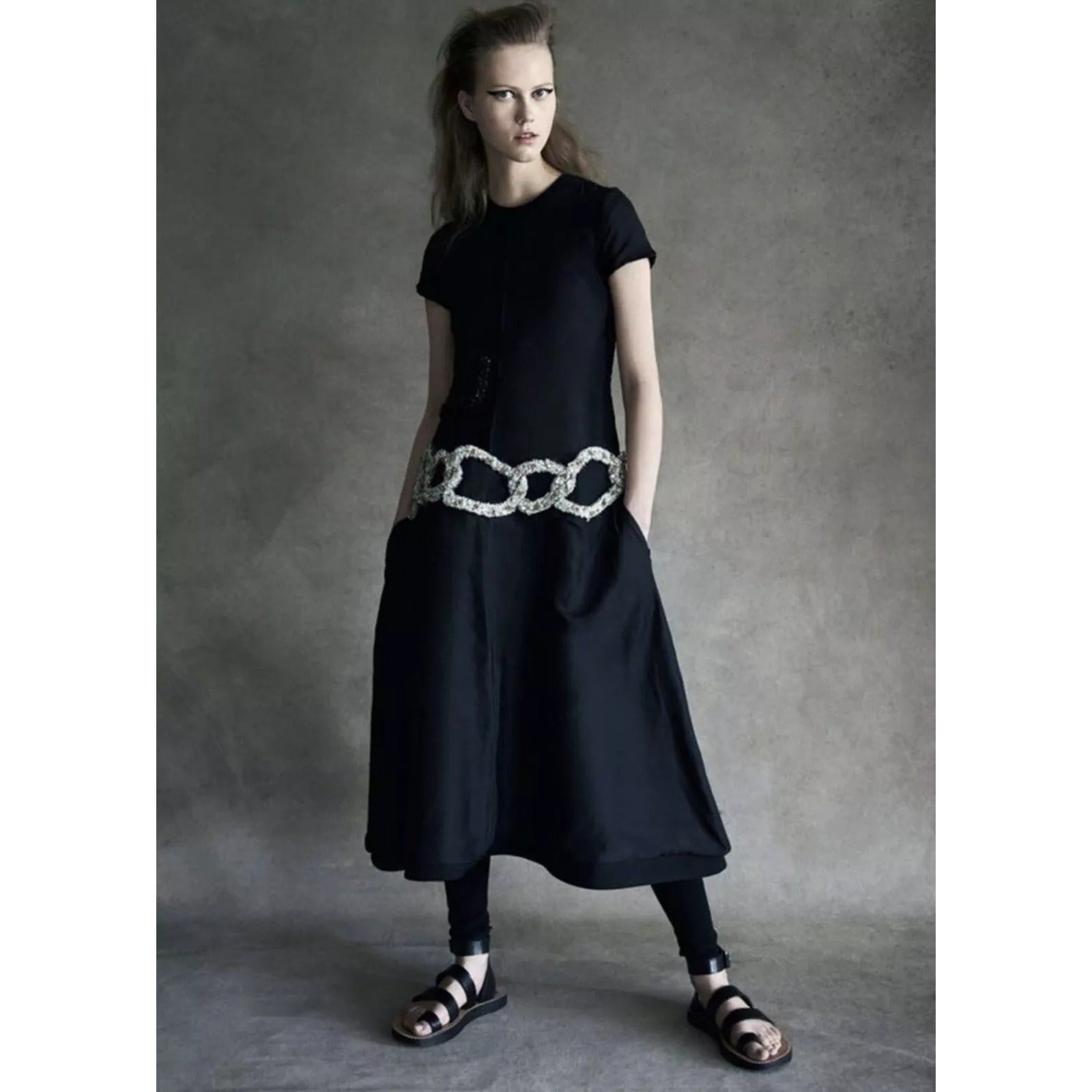 The true highlight of the piece is the remarkable crystal-embellished “belt,” an oversized, hand-embroidered chain motif that wraps the waist in shimmering, three-dimensional links. Each link is meticulously adorned with an array of glass crystals and beads, creating an eye-catching sculptural effect that elevates the entire look. The front also features a signature black beaded pocket detail—a subtle but distinctive Celine touch.