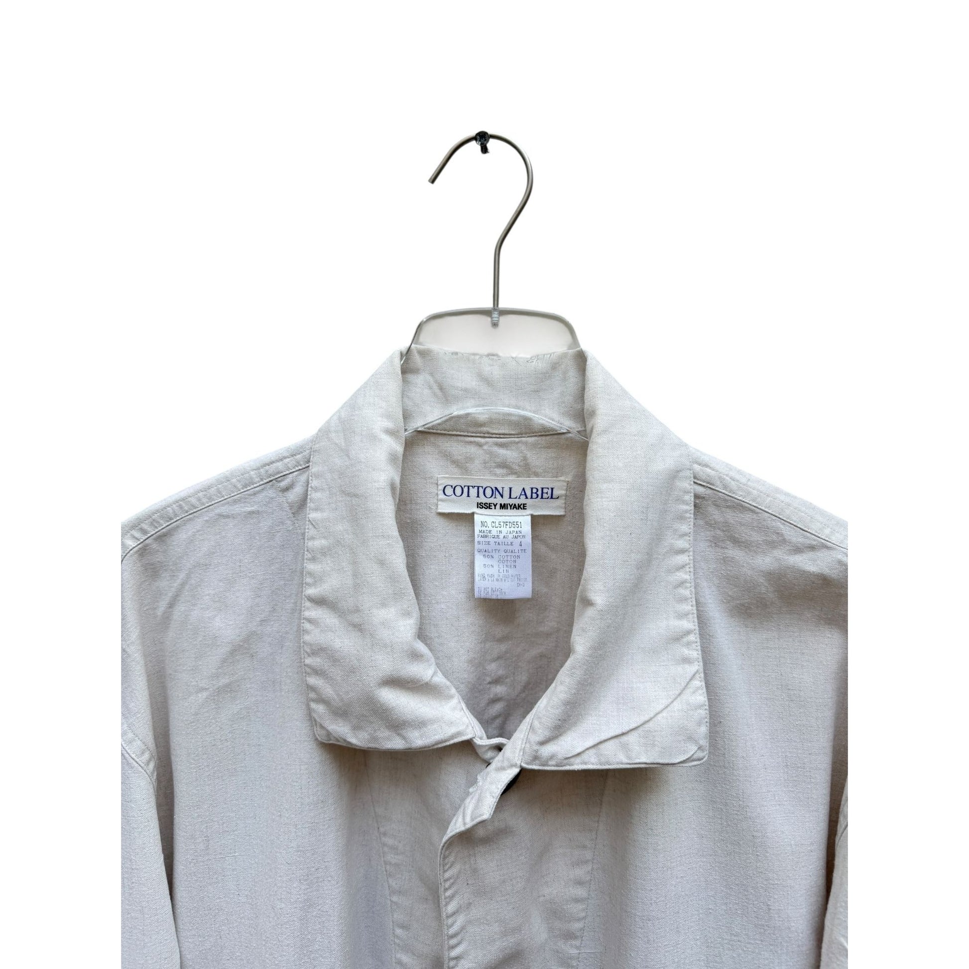 Minimalist and functional, this Issey Miyake Cotton Label jacket embodies the designer’s philosophy of timeless workwear-inspired tailoring. Crafted in Japan from a blend of 50% linen and 50% cotton, it offers a breathable, durable structure with a refined natural texture.