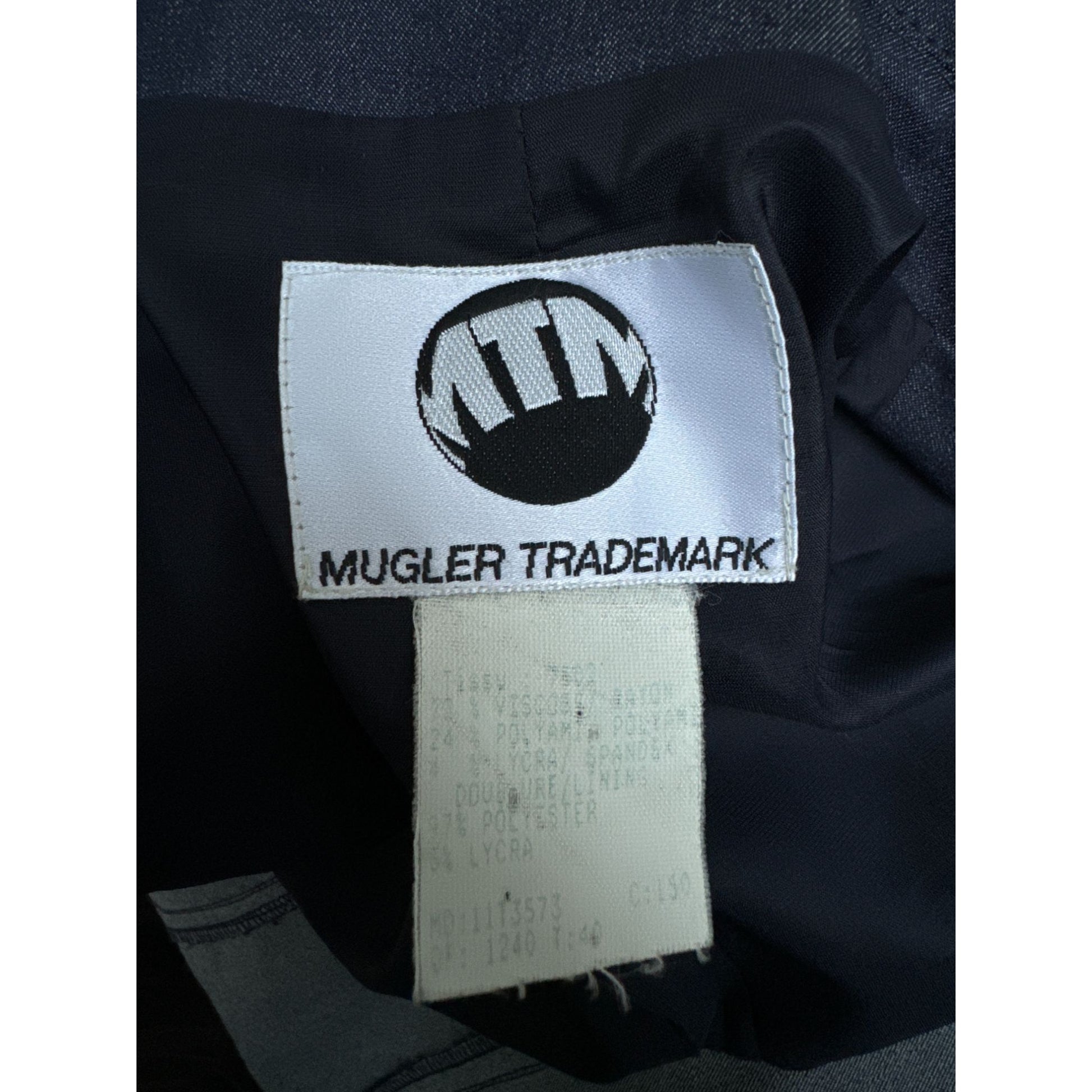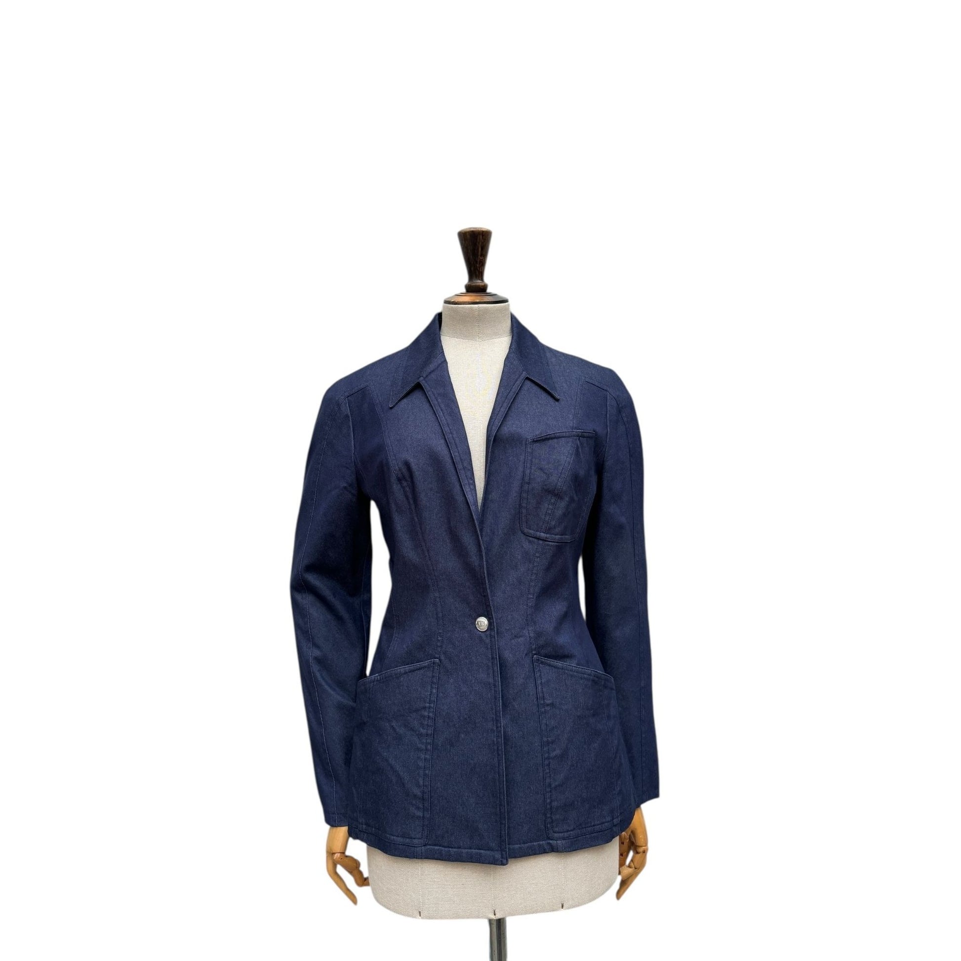 Sleek and sharply tailored, this Thierry Mugler dark denim blazer captures the house’s signature sculptural silhouette in a casual-luxury fabric. Cut to define the waist and elongate the torso, it features strong lines, precise seaming, and a minimalist single-breasted front finished with a discrete press-stud buttons.