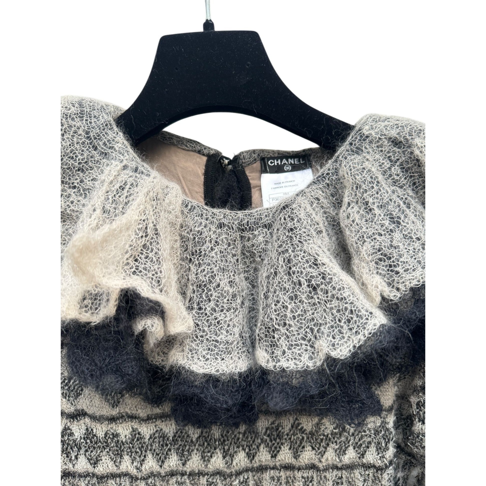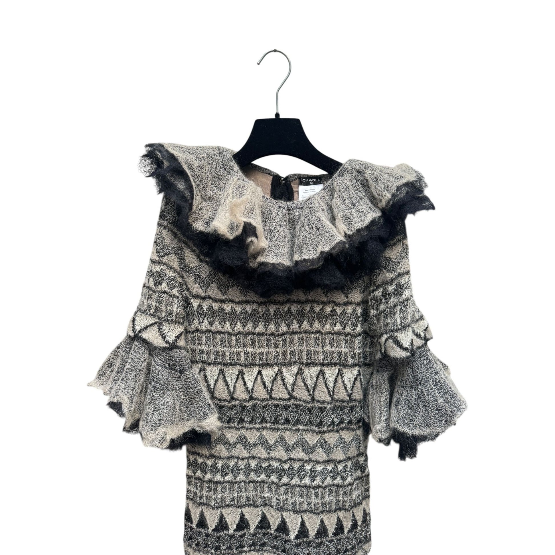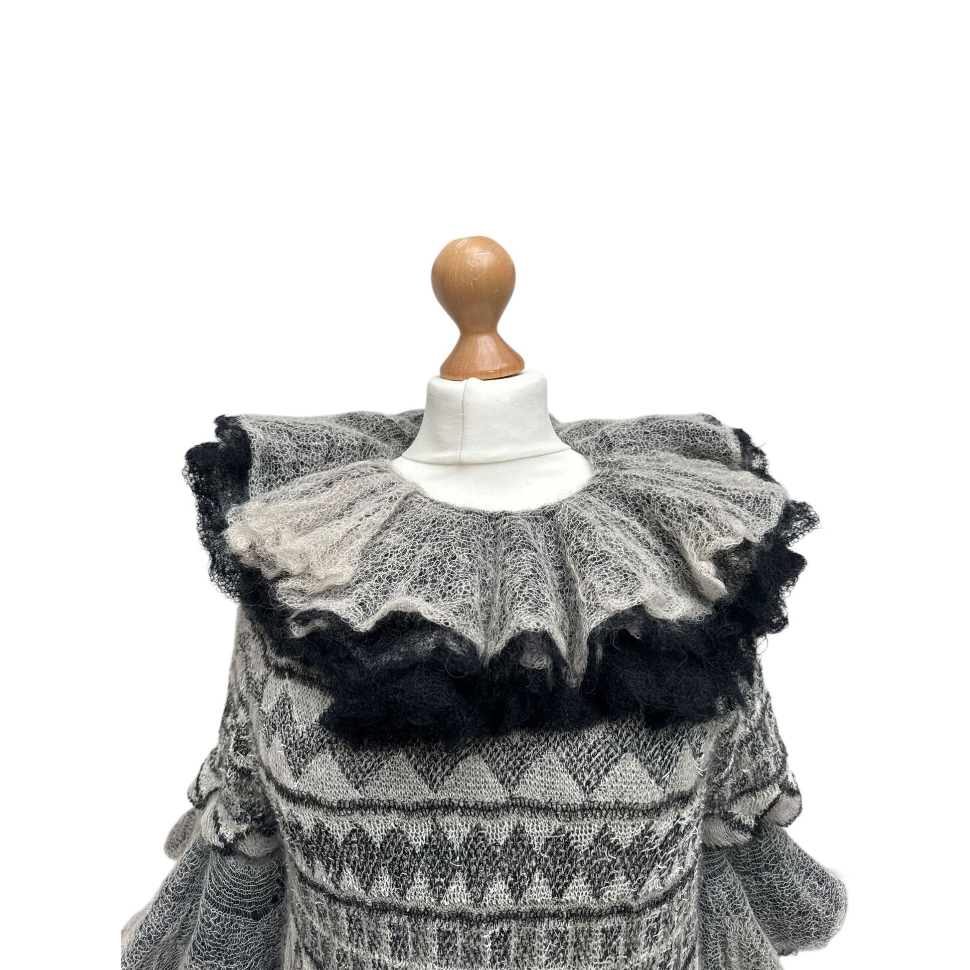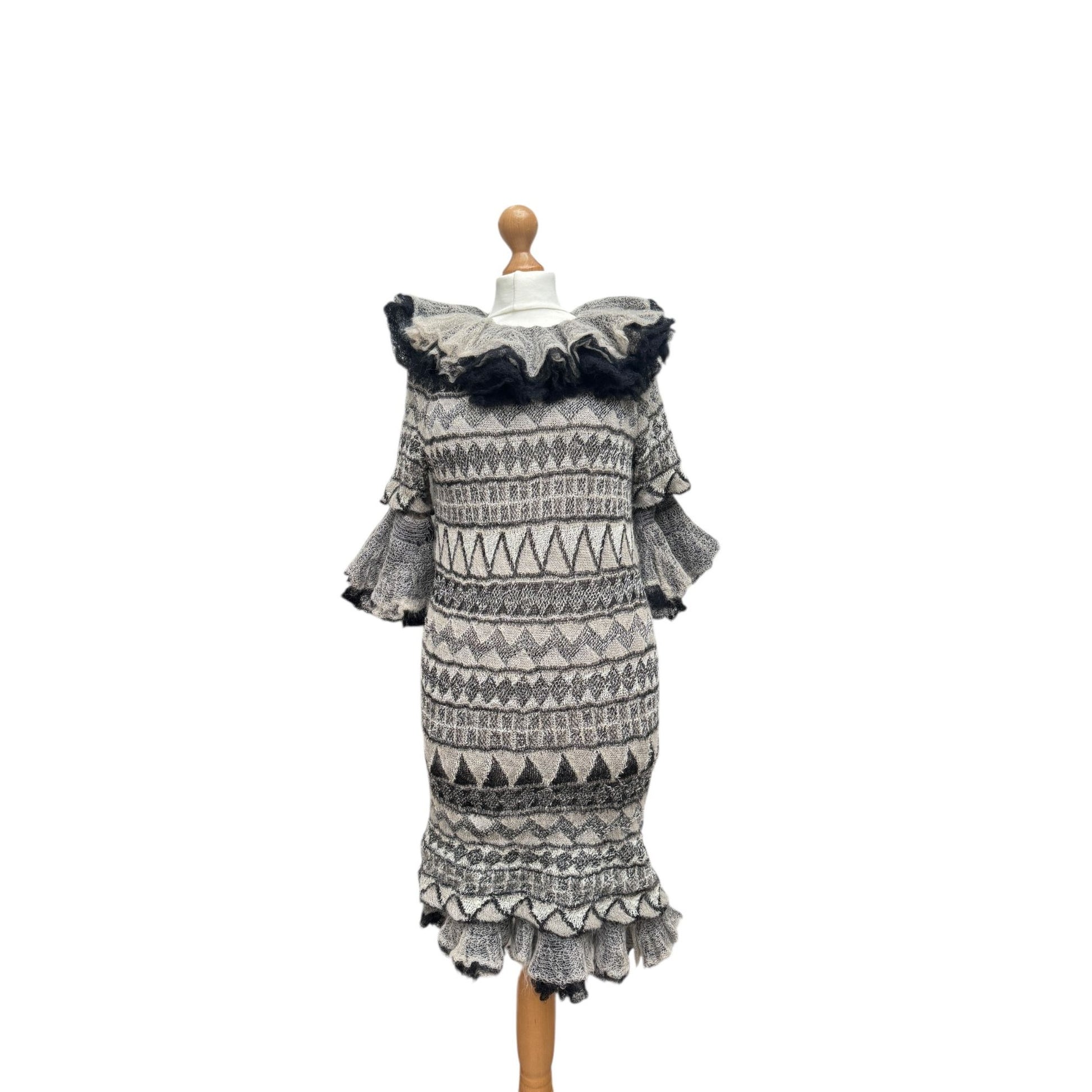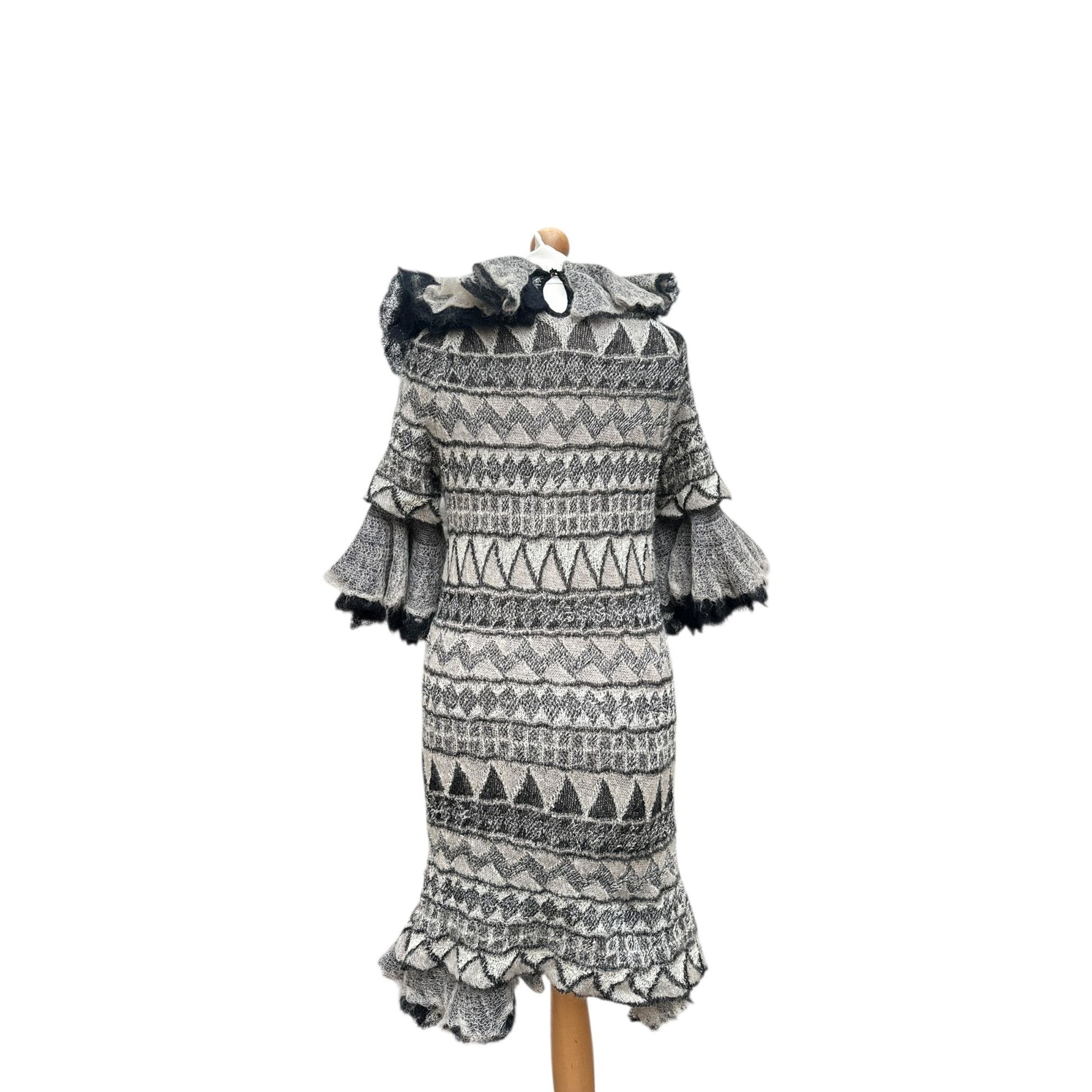 The dress features an intricate geometric Fair Isle–inspired motif, enhanced by voluminous ruffled trims at the collar, sleeves, and hemline in contrasting black and grey tones. A playful and rare detail is the tiny Russian doll button closure at the back — an iconic Karl Lagerfeld touch that adds whimsy and collectible value.