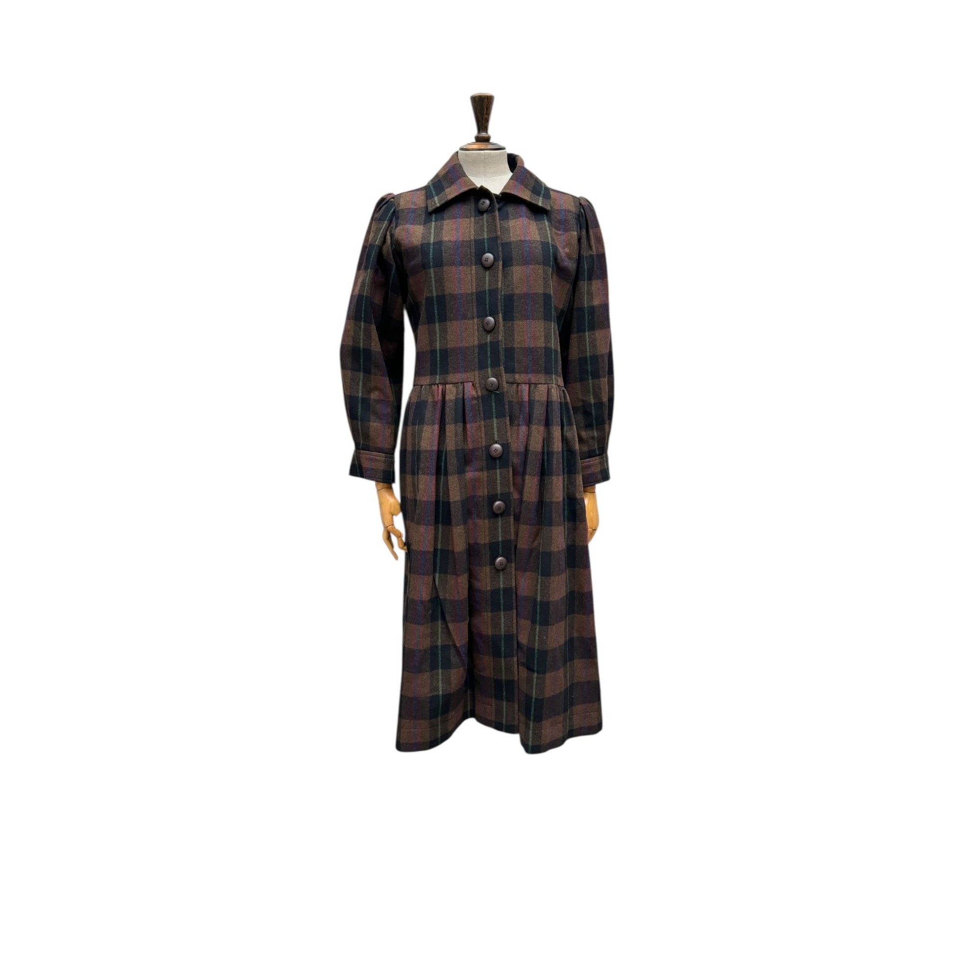 Iconic Yves Saint Laurent coat from the Fall/Winter 1976 collection, crafted in a rich brown and black checkered plaid wool. This piece features a beautifully structured silhouette with softly defined shoulders and a long, elegant cut.