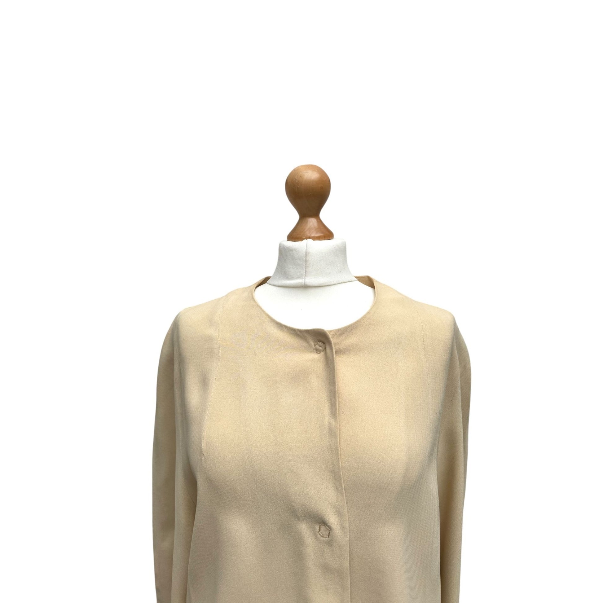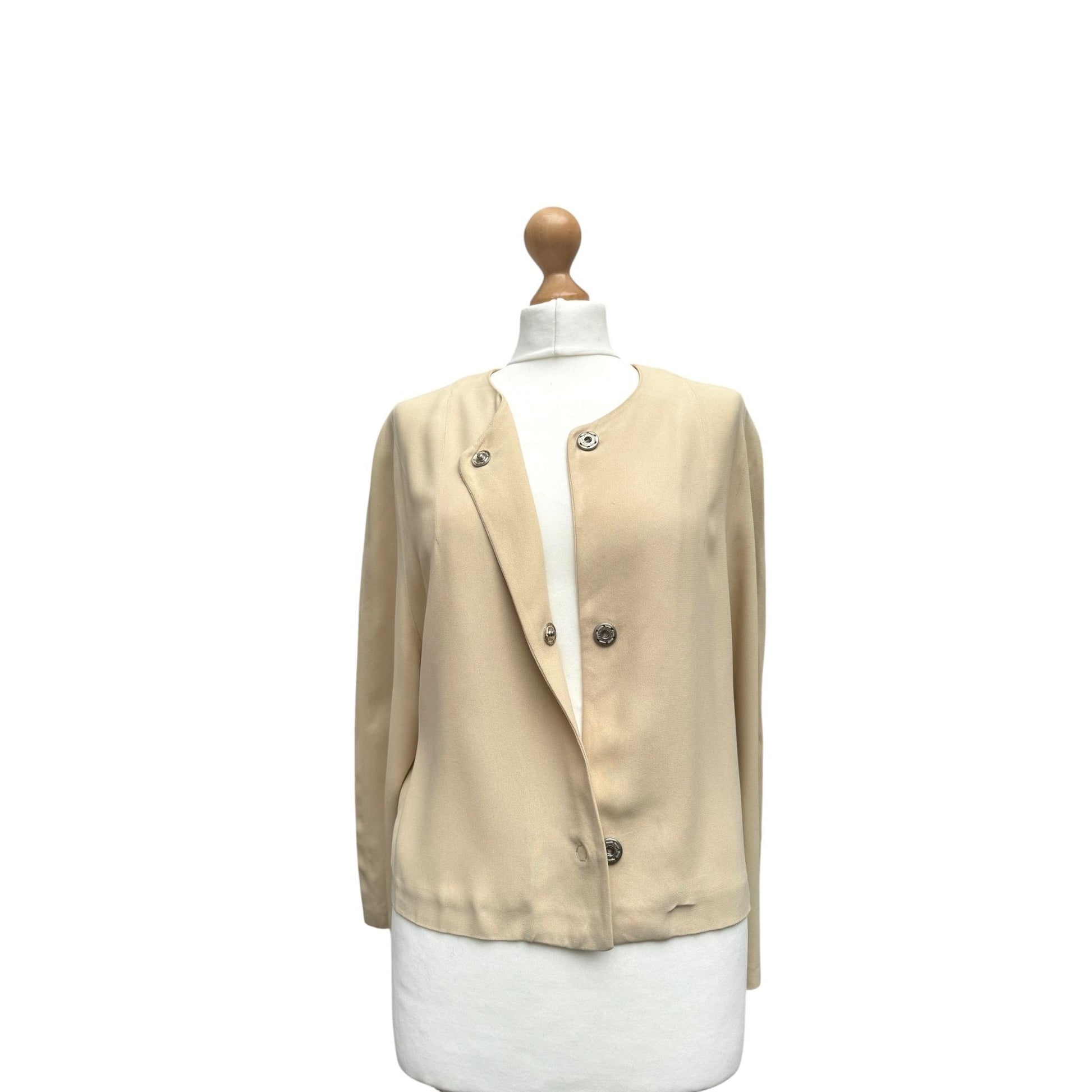 Crafted in a soft beige color, it features iconic oversized metal snap buttons at the closure. The clean, collarless design and straight cut make it a timeless layering piece.