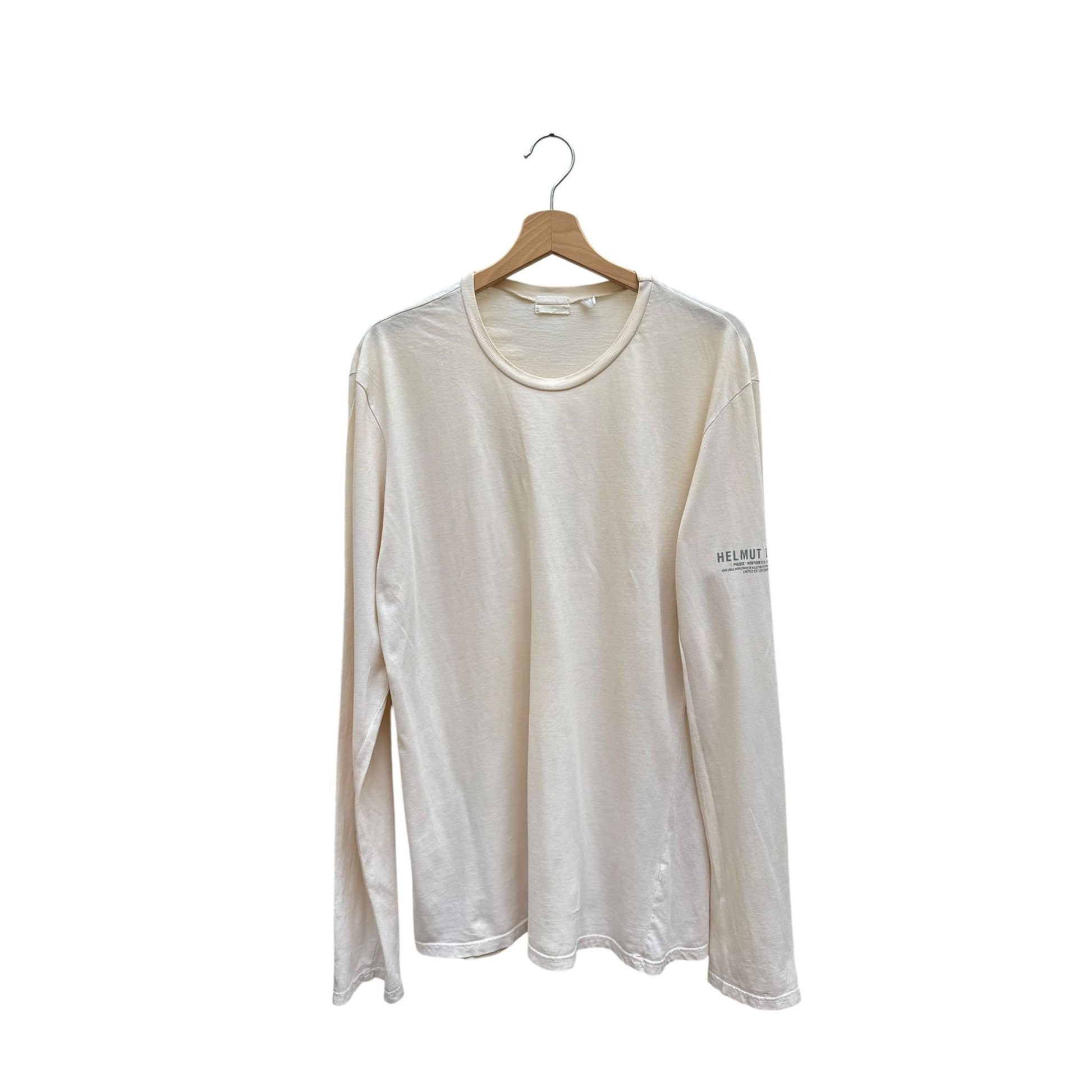 The design features a classic crew neck with subtle drop shoulders, allowing for a relaxed, slightly oversized silhouette. On the left sleeve, a Helmut Lang Jeans press print reads: