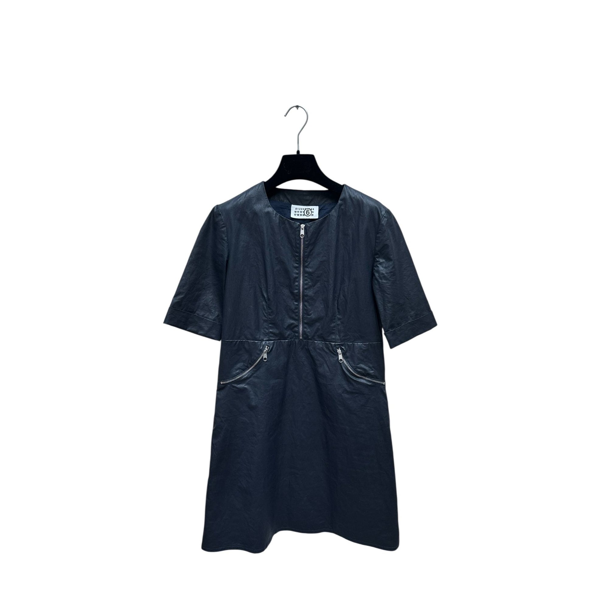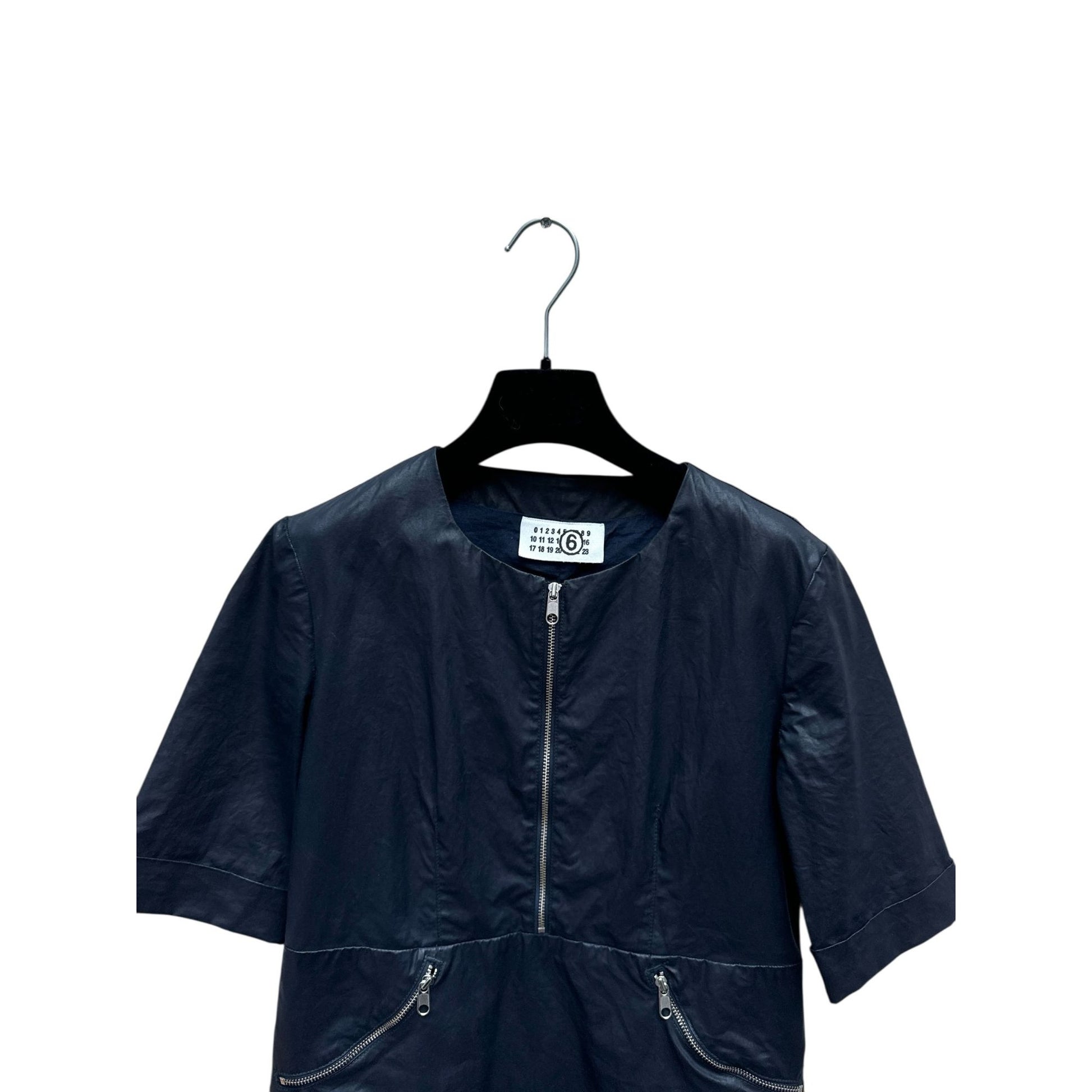 The silhouette is clean and minimal, featuring a round neckline, short sleeves, and a visible front zip that runs from the neckline to the waist, offering utilitarian edge.