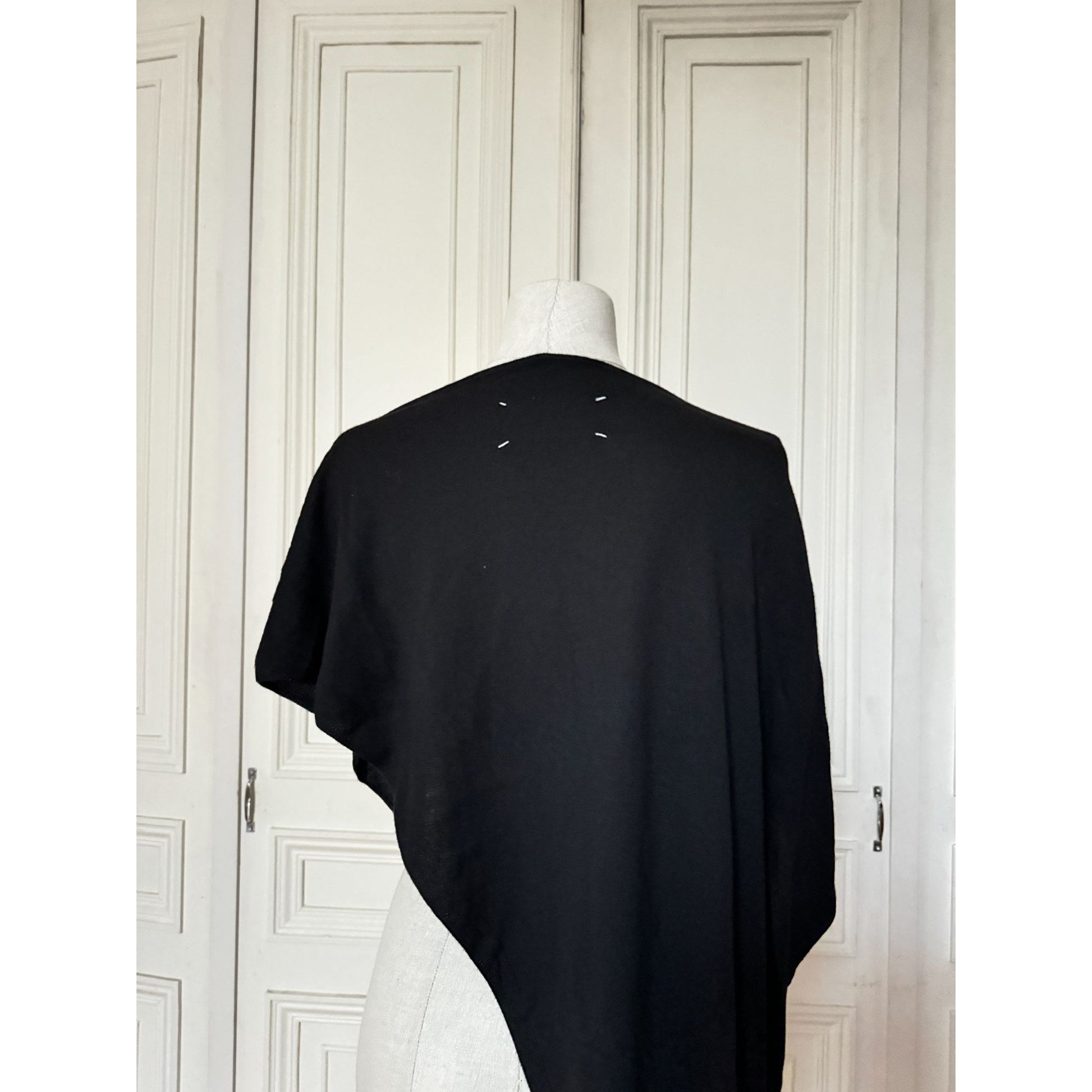 The minimalist black wool fabric highlights the construction and avant-garde cut, making it versatile as both a statement top or an unconventional dress. Discreet signature stitching is visible at the back, true to Margiela’s iconic codes.