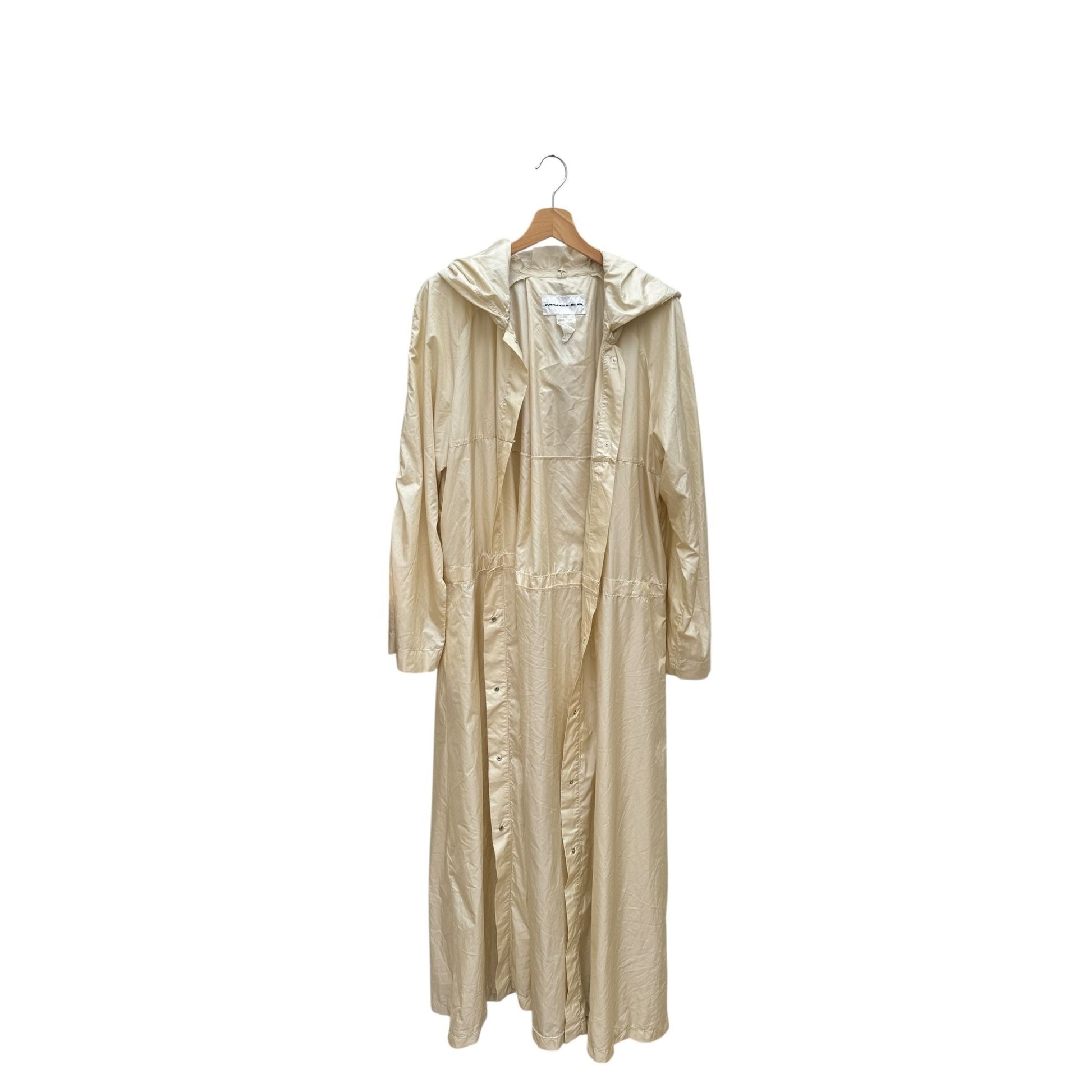 The coat features an oversized hood, adding both functionality and a sculptural element that heightens its theatrical appeal. Designed with versatility in mind, its generous cut allows it to be worn by a wide range of body types (XS to L), making it a truly unisex statement piece.