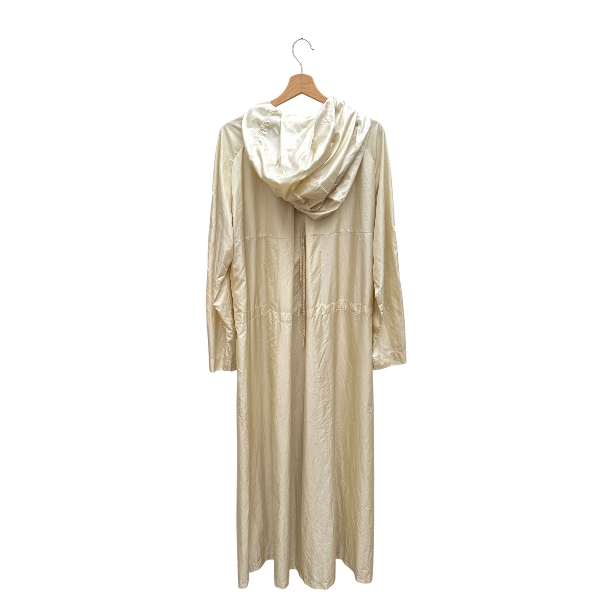 This rare Thierry Mugler maxi coat is a striking example of the designer’s avant-garde vision, combining futuristic elegance with dramatic volume. Crafted in a luminous gold-tone nylon and polyester blend (67% nylon, 33% polyester), the coat has a lightweight, semi-transparent finish that shimmers subtly with movement. Its elongated silhouette drapes fluidly to the floor, creating an effortlessly bold presence.