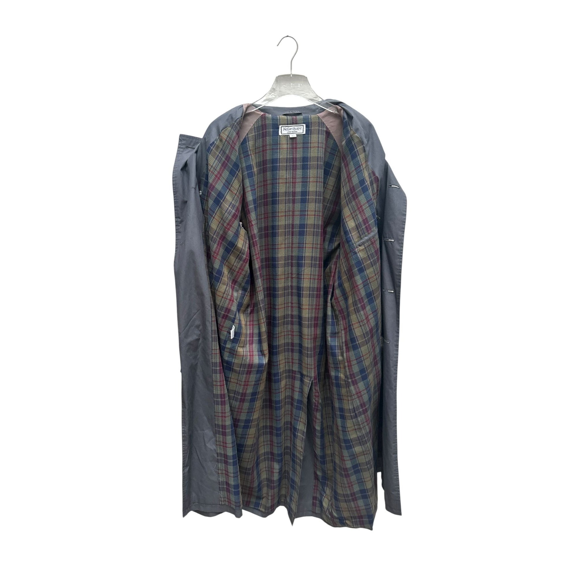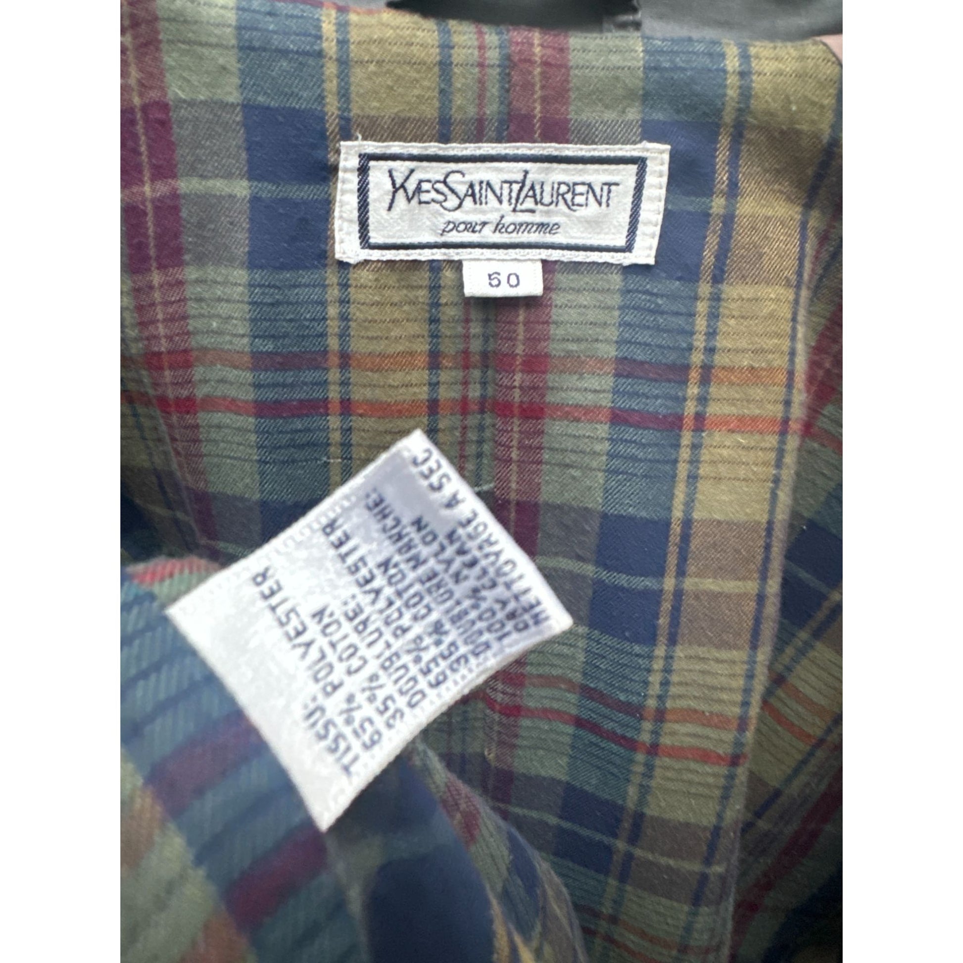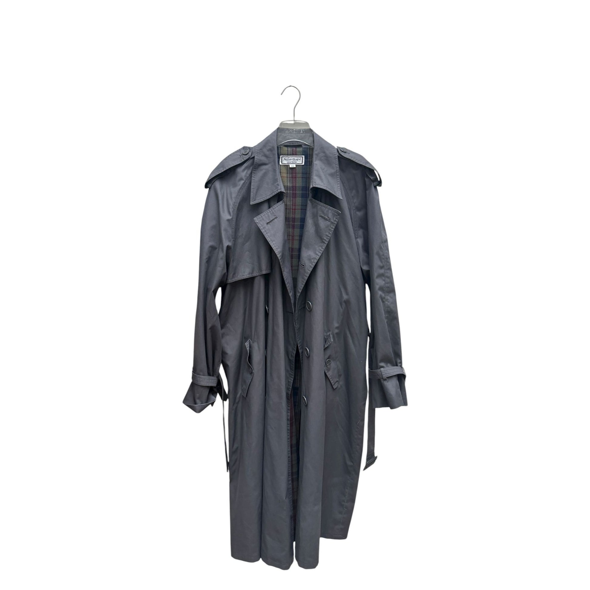 A timeless Yves Saint Laurent pour homme trench coat crafted in a classic grey tone, enhanced with refined tailoring and a longline silhouette. This double-breasted coat features structured shoulders with epaulettes, adjustable belted cuffs, and a matching waist belt for a cinched or relaxed fit. The storm flap at the back and front adds both function and a traditional trench detail.