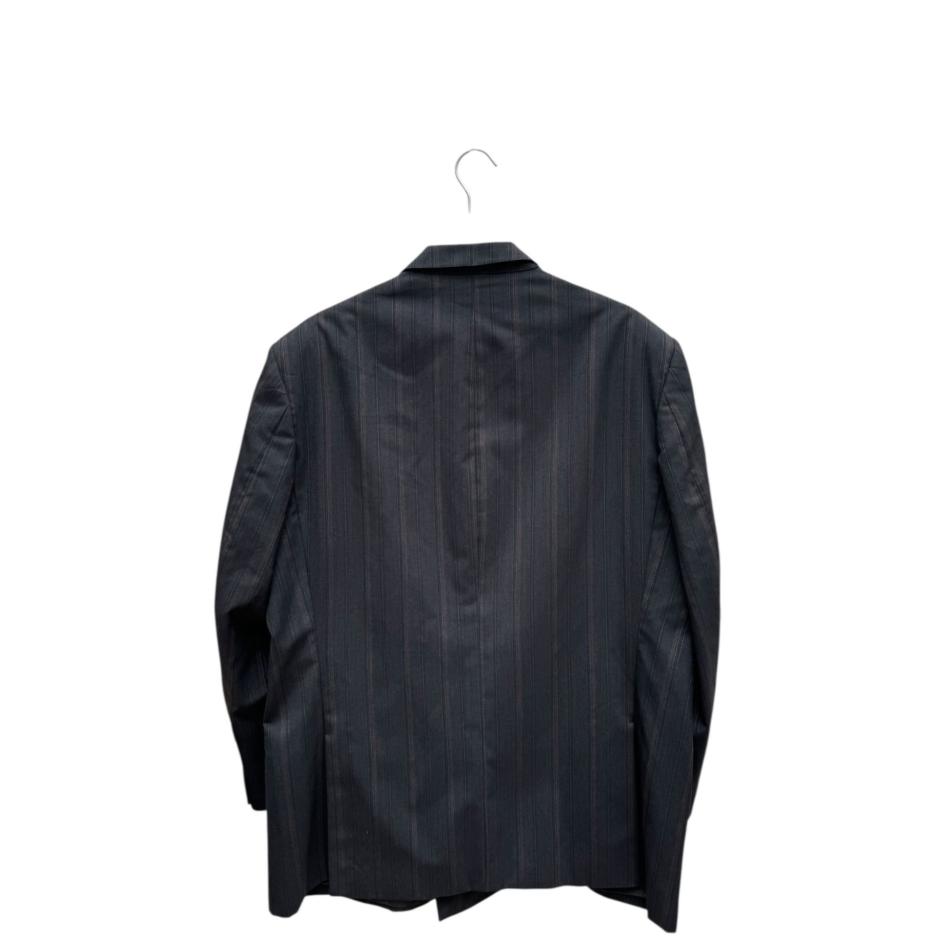 Crafted in France from 100% wool, the jacket features a subtle pinstripe pattern that adds depth and dimension to its structured silhouette.